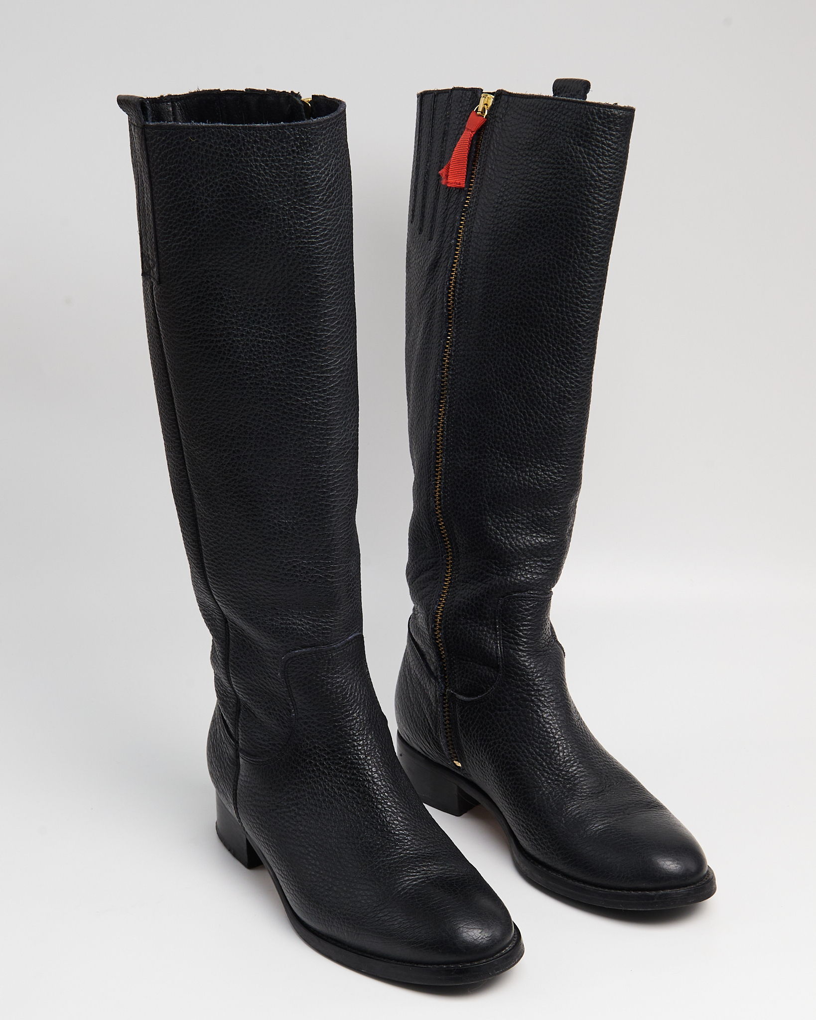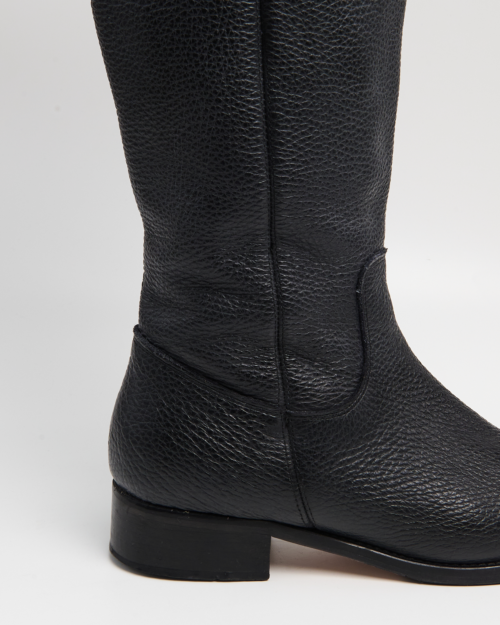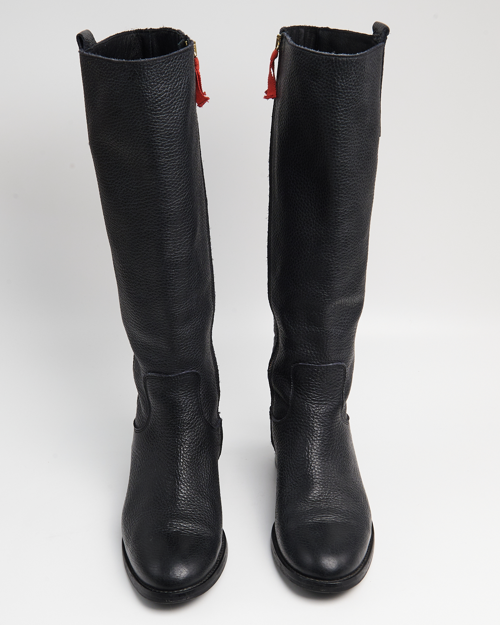 Сапоги из плотной зернистой кожи. Высокое голенище, устойчивый низкий каблук. Молния с контрастной текстильной застежкой. Итальянское производство.