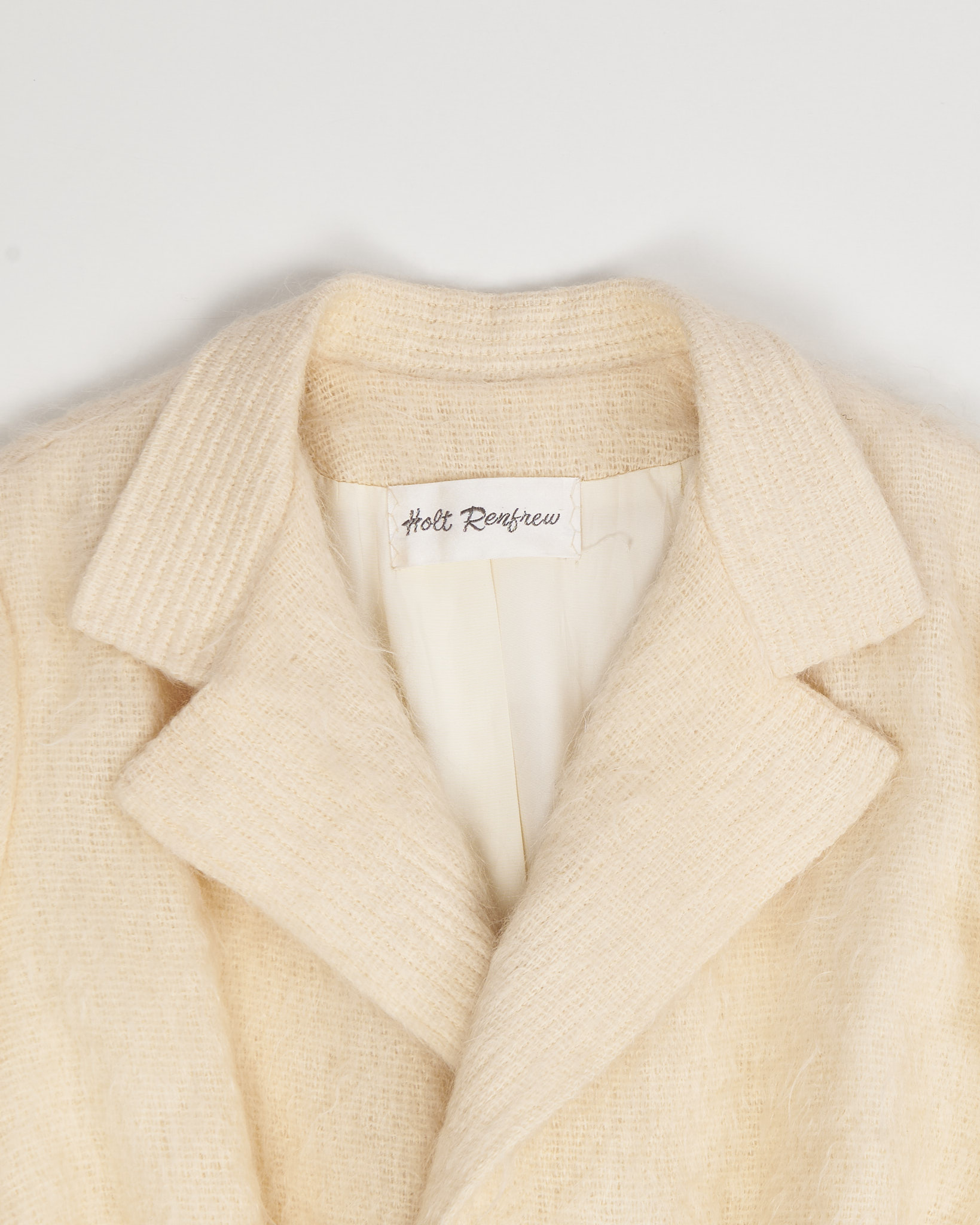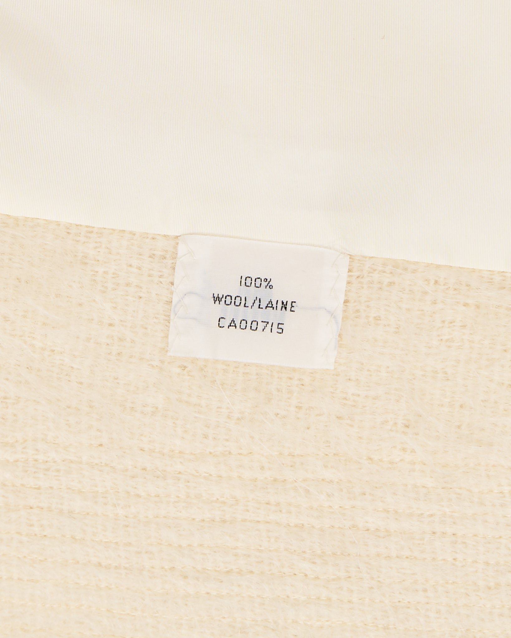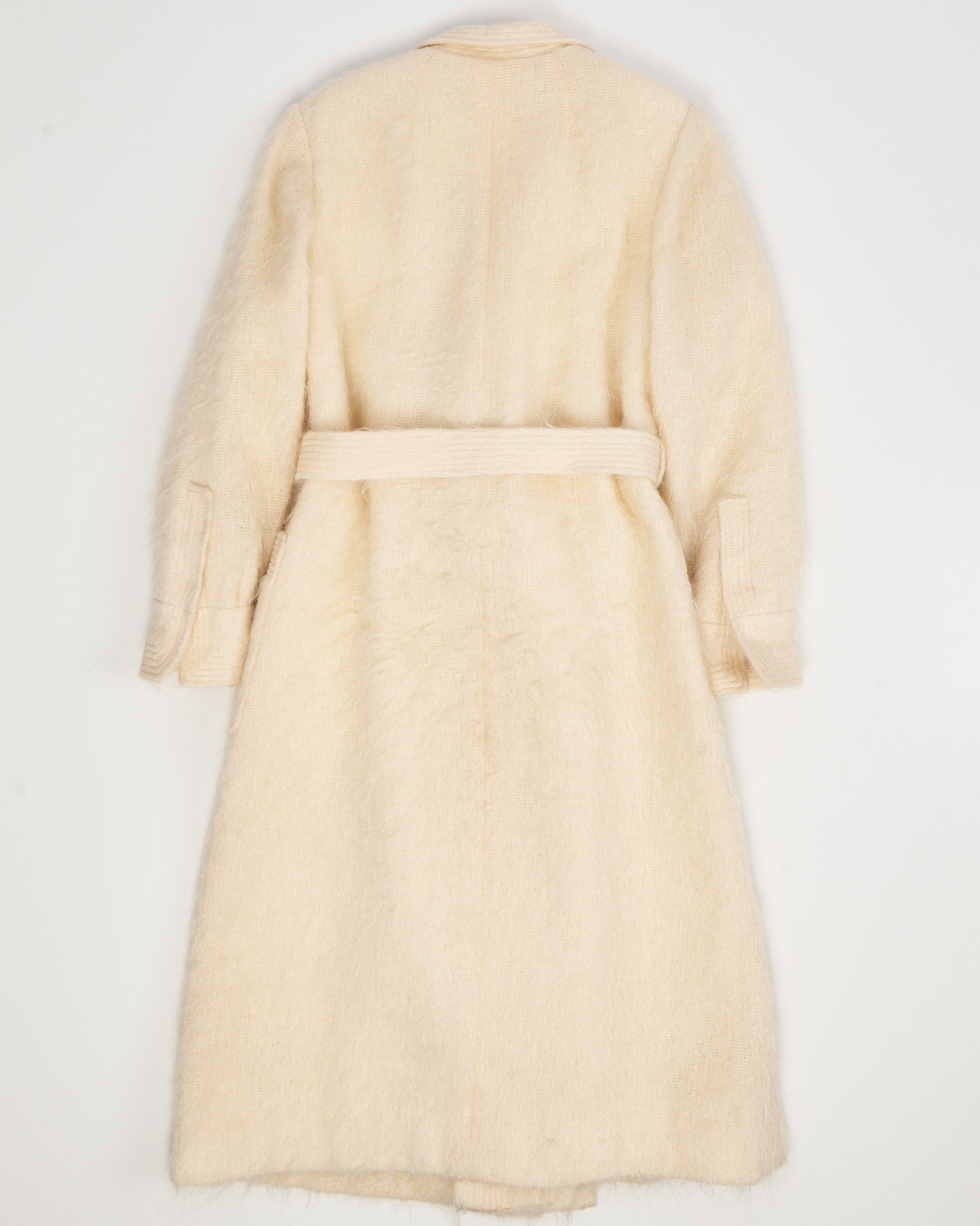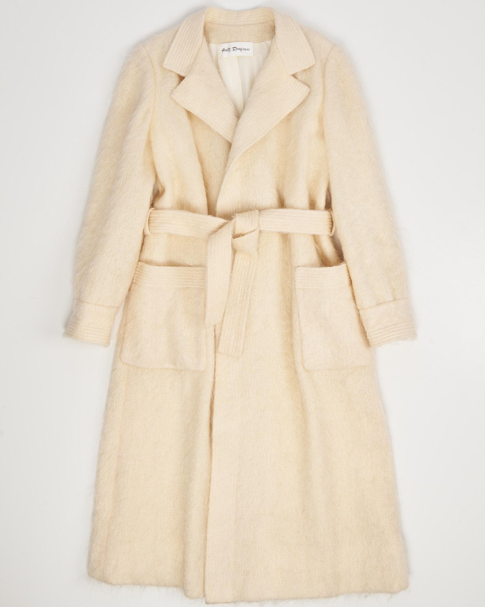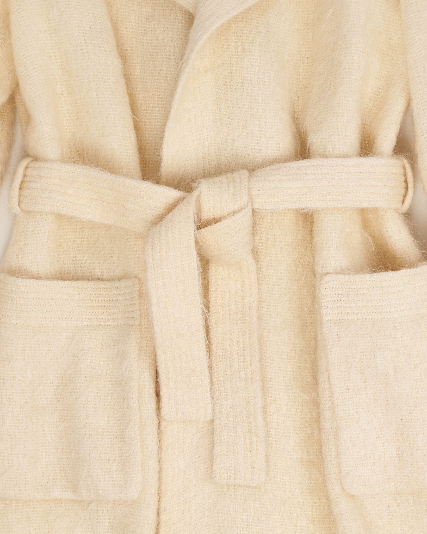 Пальто из 100% шерсти светло-молочного оттенка с лёгким ворсом, создающим мягкий, воздушный объём. Ткань плотная, тёплая и приятная на ощупь. Модель на запах с поясом. Широкий воротник и крупные накладные карманы.