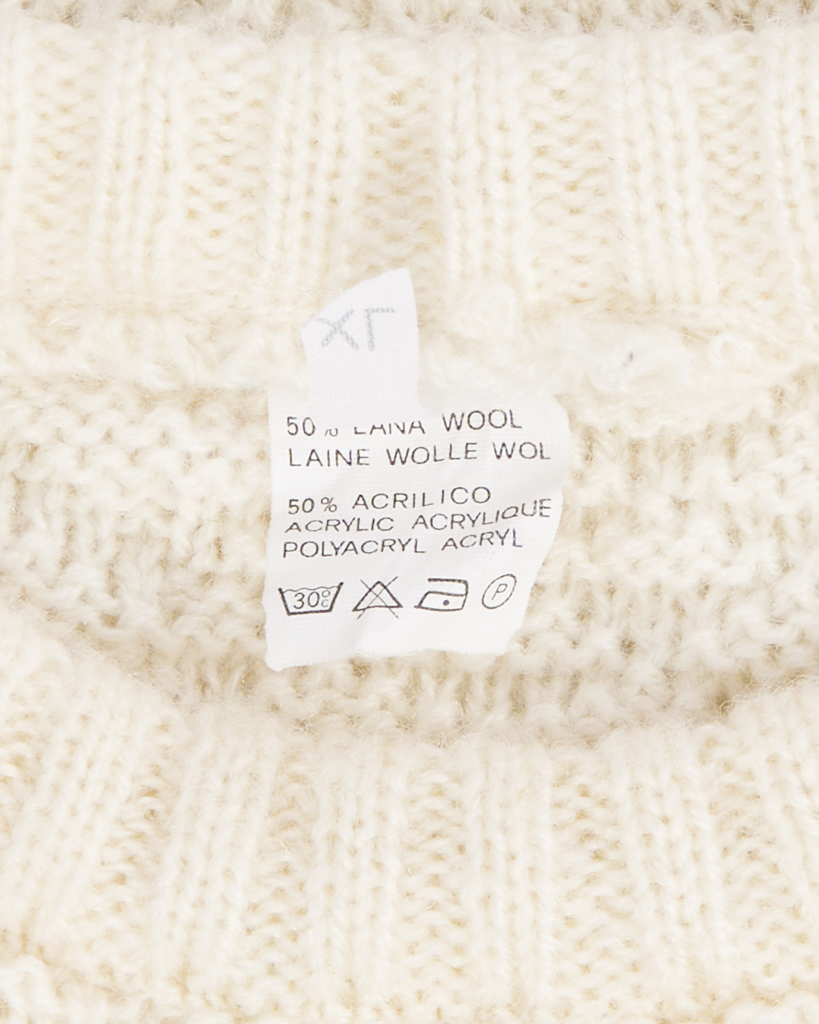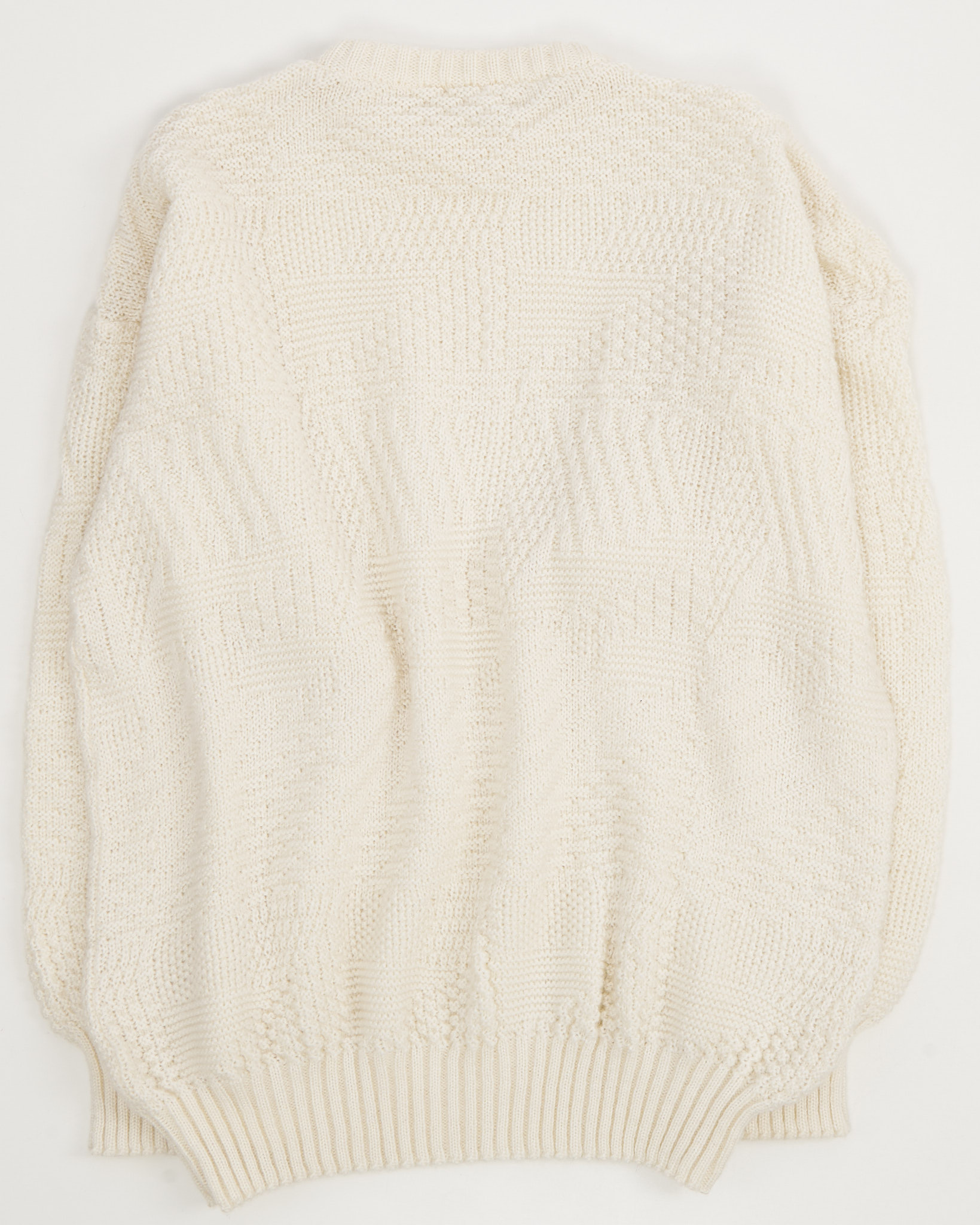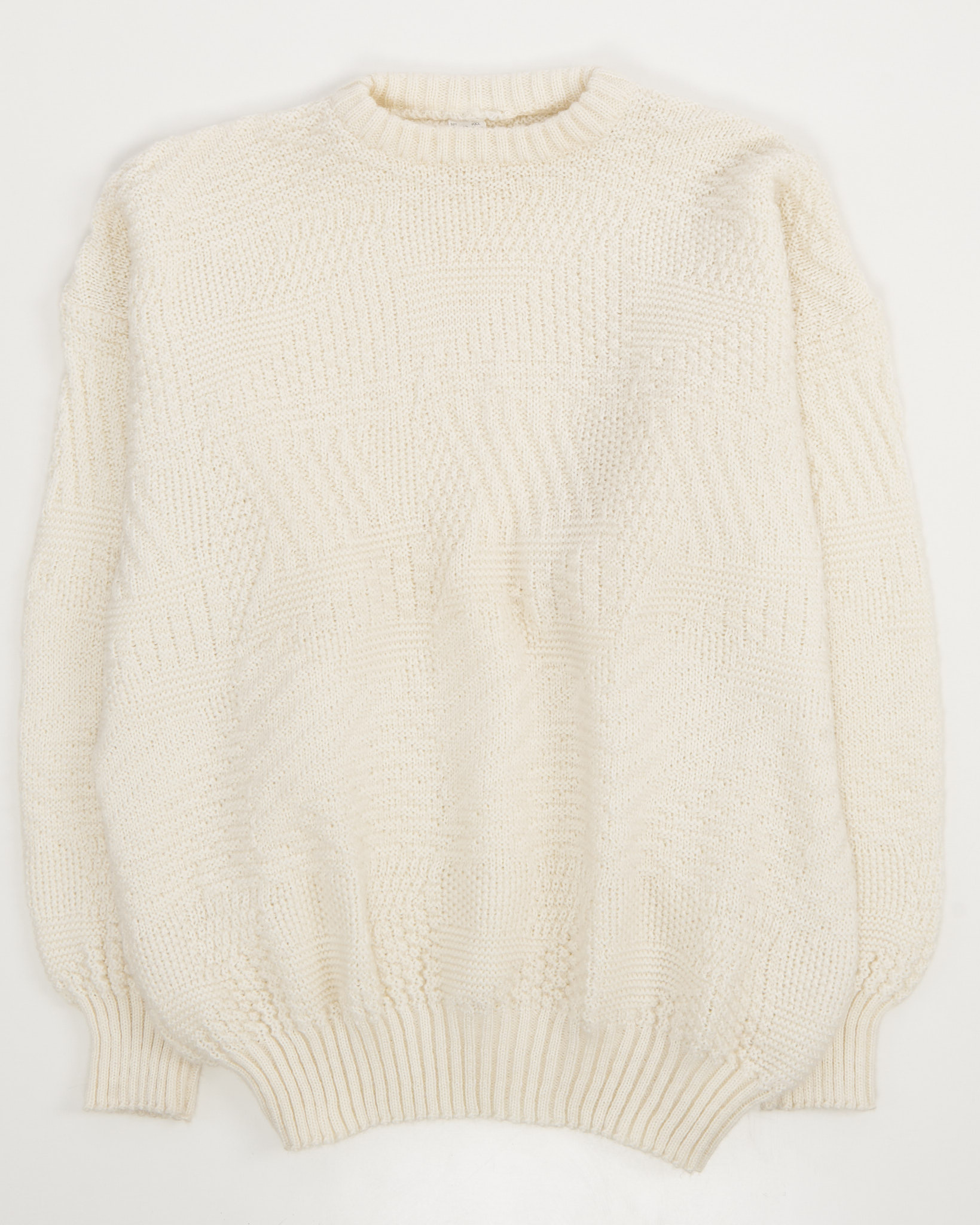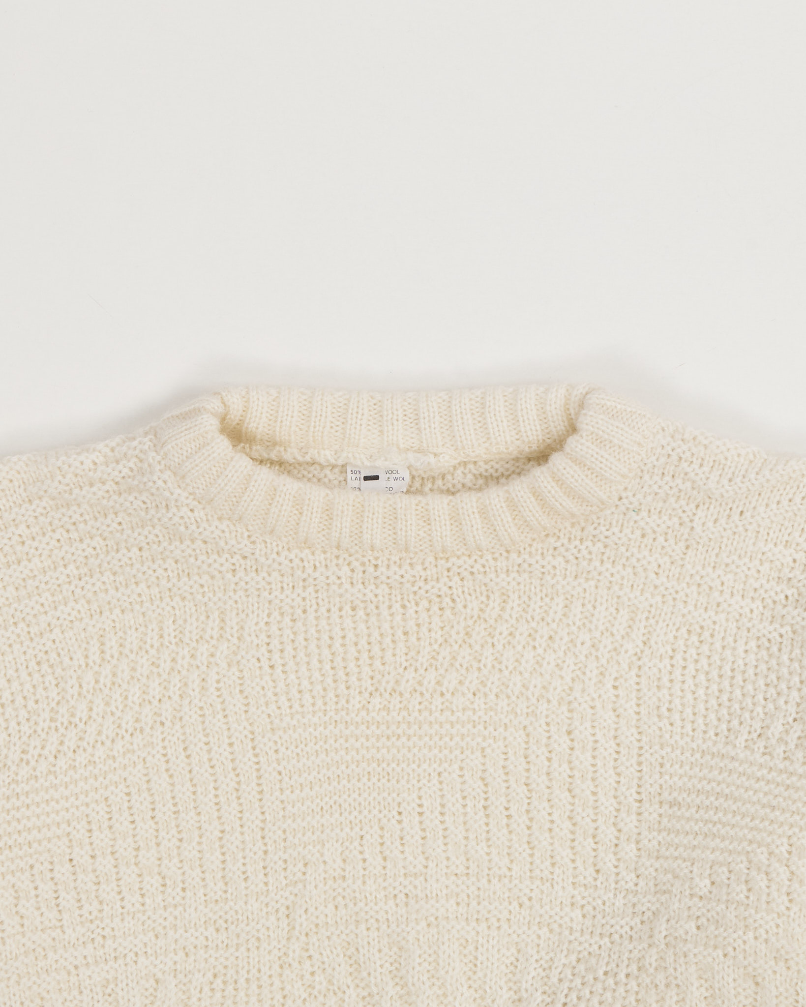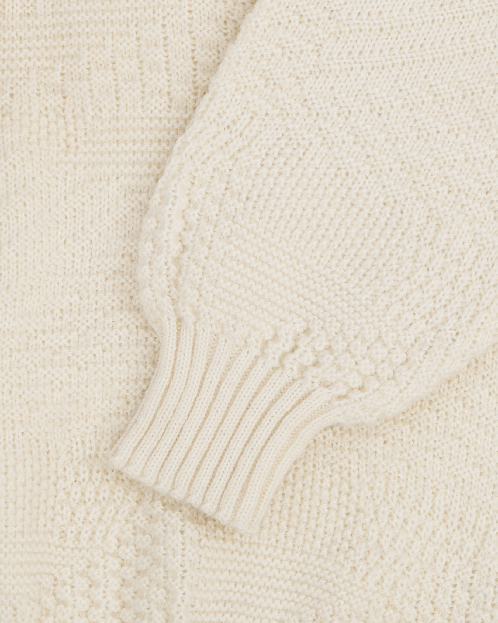 Выполнен из смеси шерсти и акрила, что делает изделие тёплым и при этом лёгким в уходе. Светло-кремового цвета, с объёмным геометрическим узором в фактурной вязке.