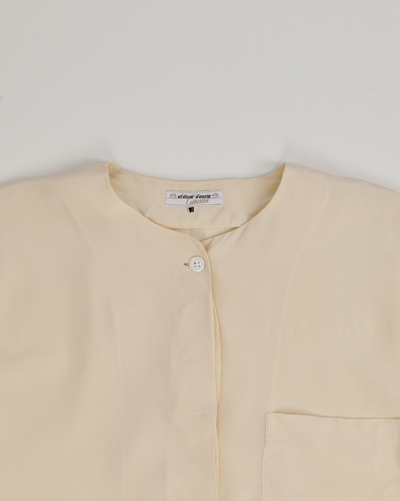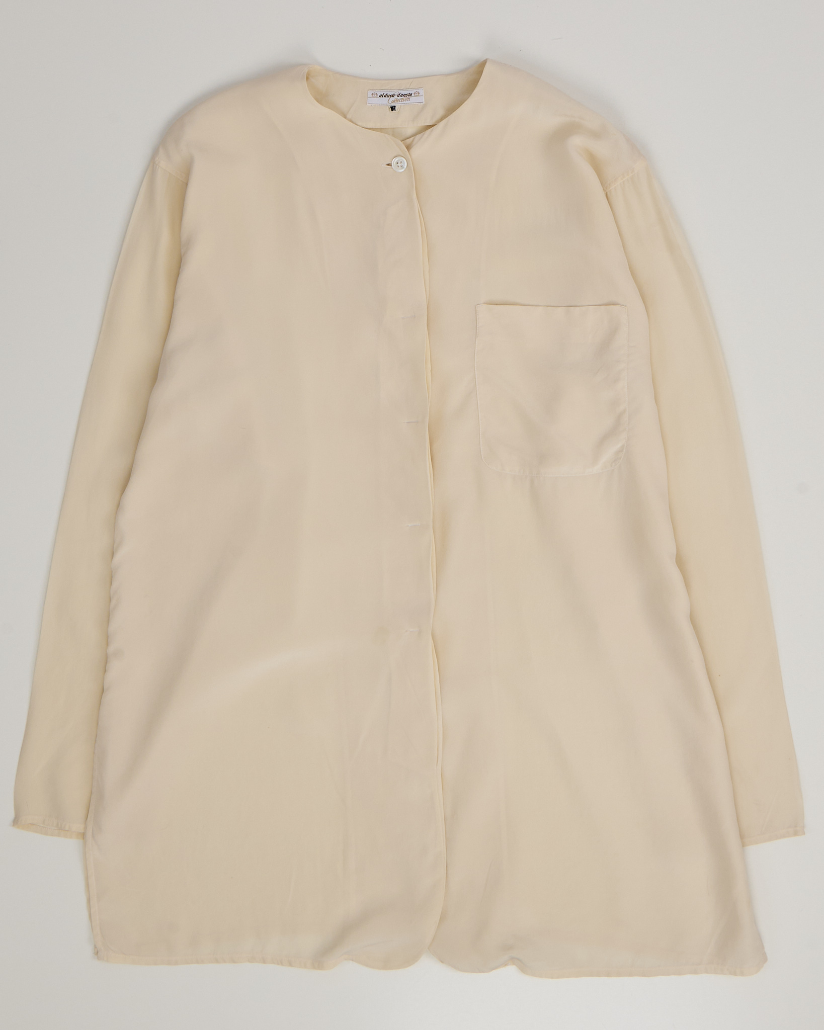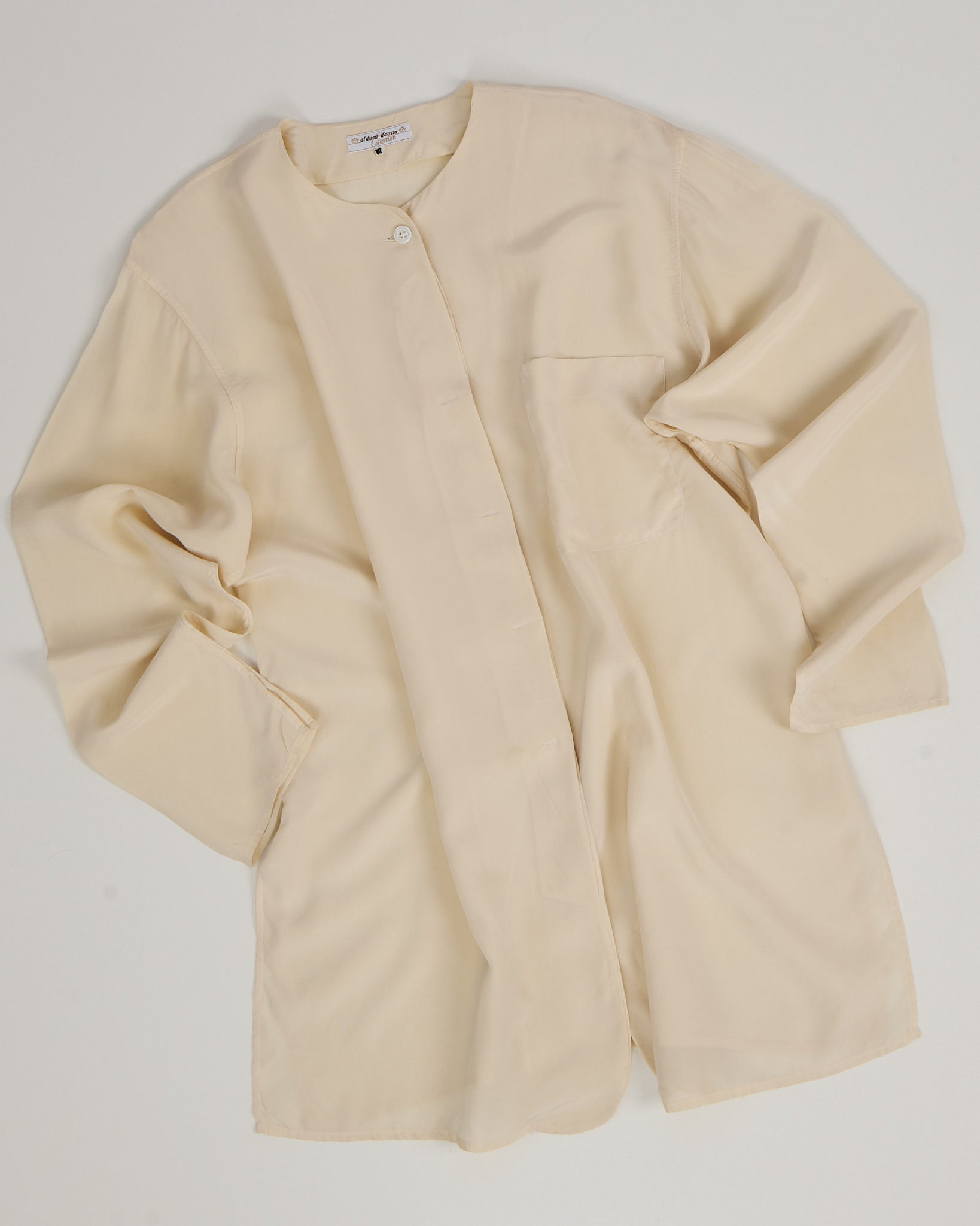 Блуза Aldina D’Aosta из 100% натурального шёлка светлого кремового оттенка. Свободная посадка, крупный нагрудный карман, акцентные разрезы по бокам.