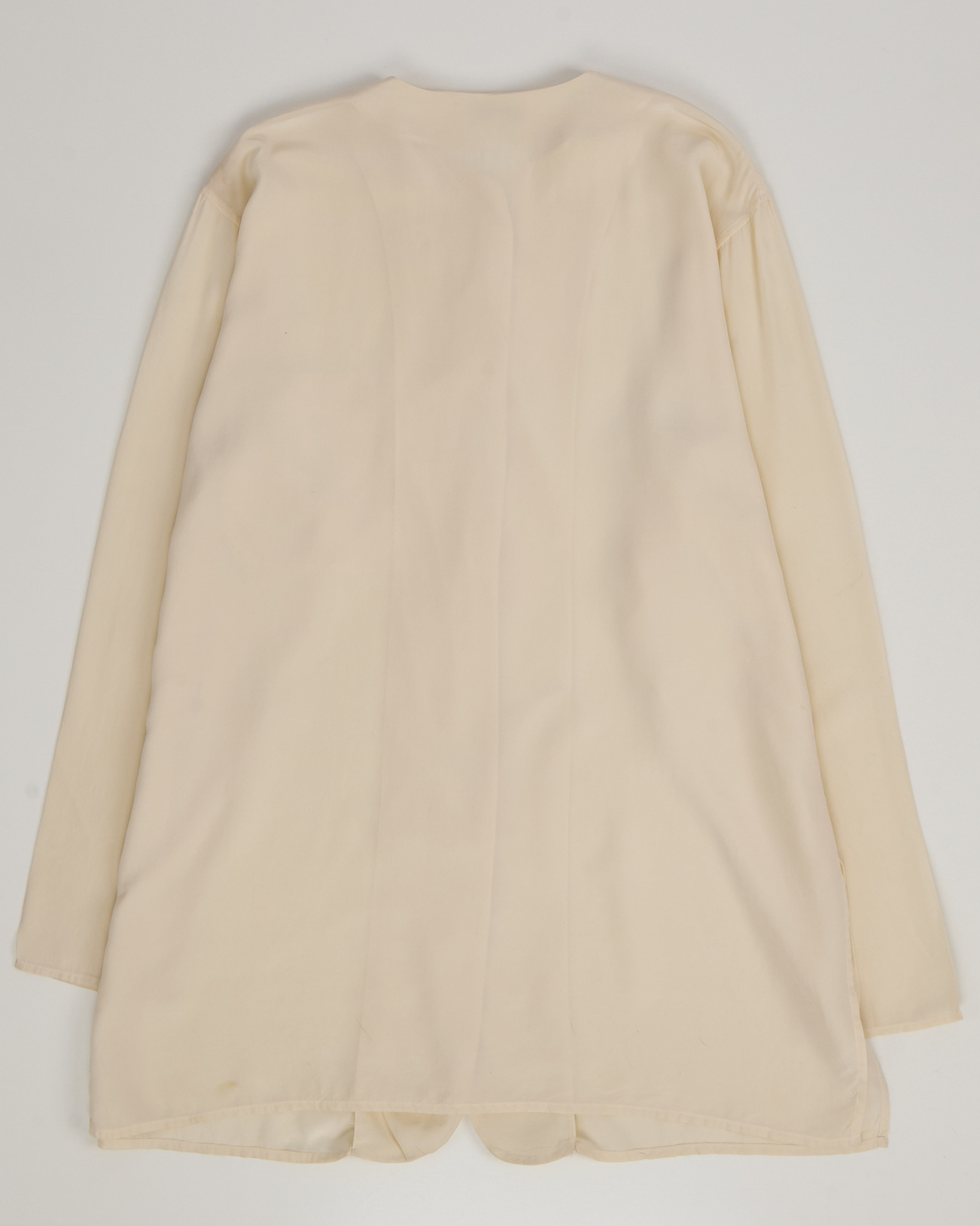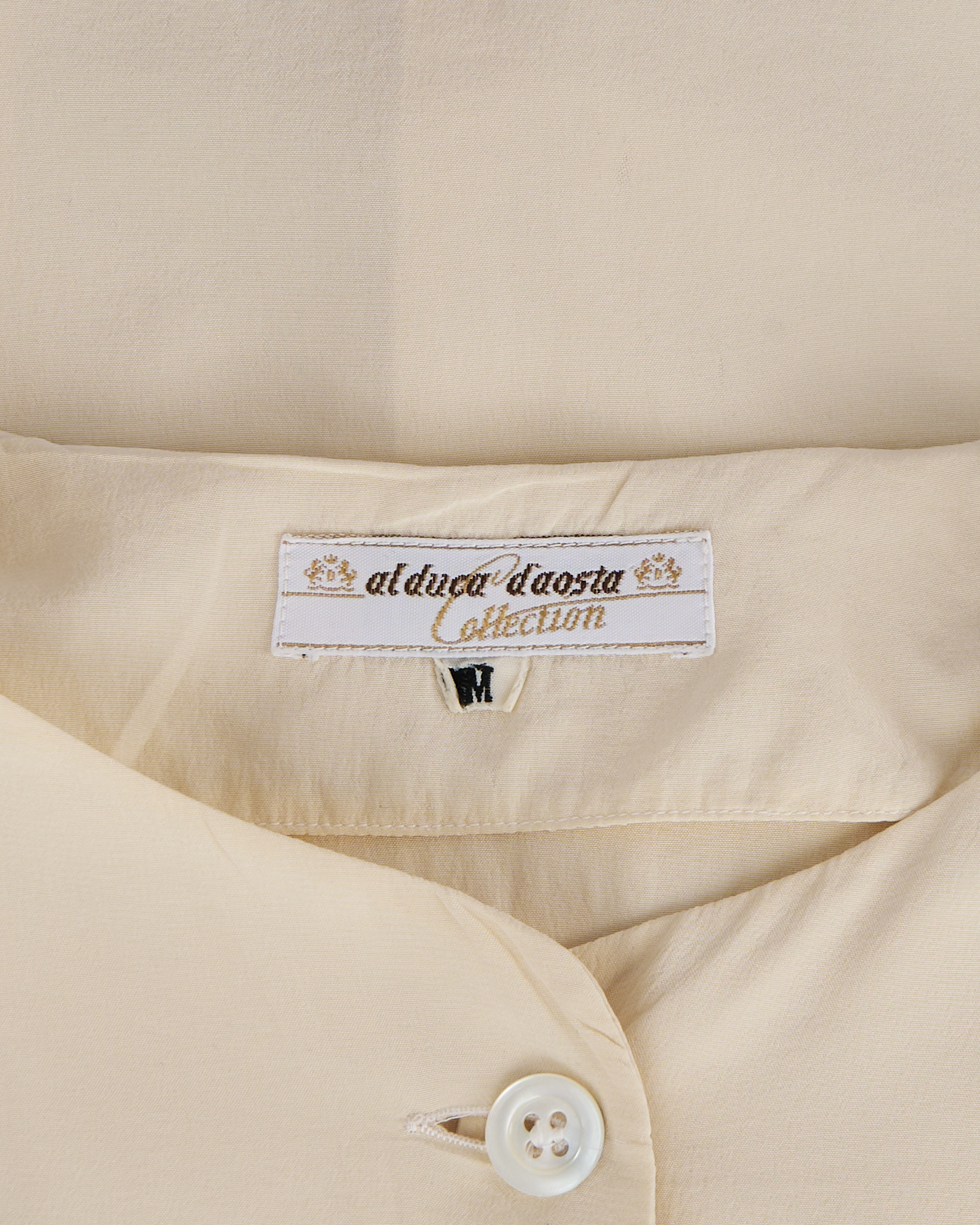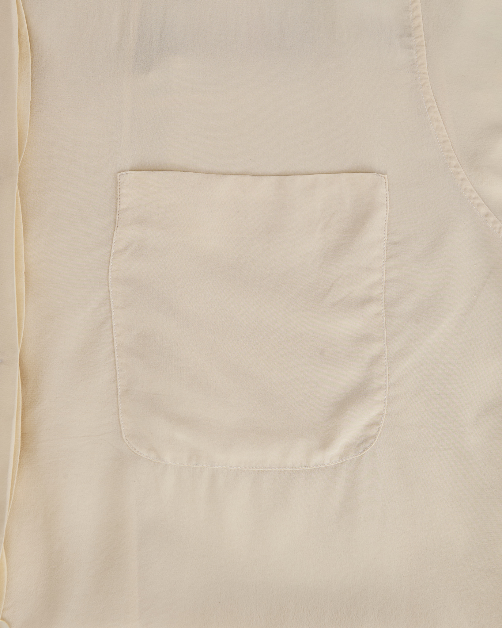 Блуза Aldina D’Aosta из 100% натурального шёлка светлого кремового оттенка. Свободная посадка, крупный нагрудный карман, акцентные разрезы по бокам.