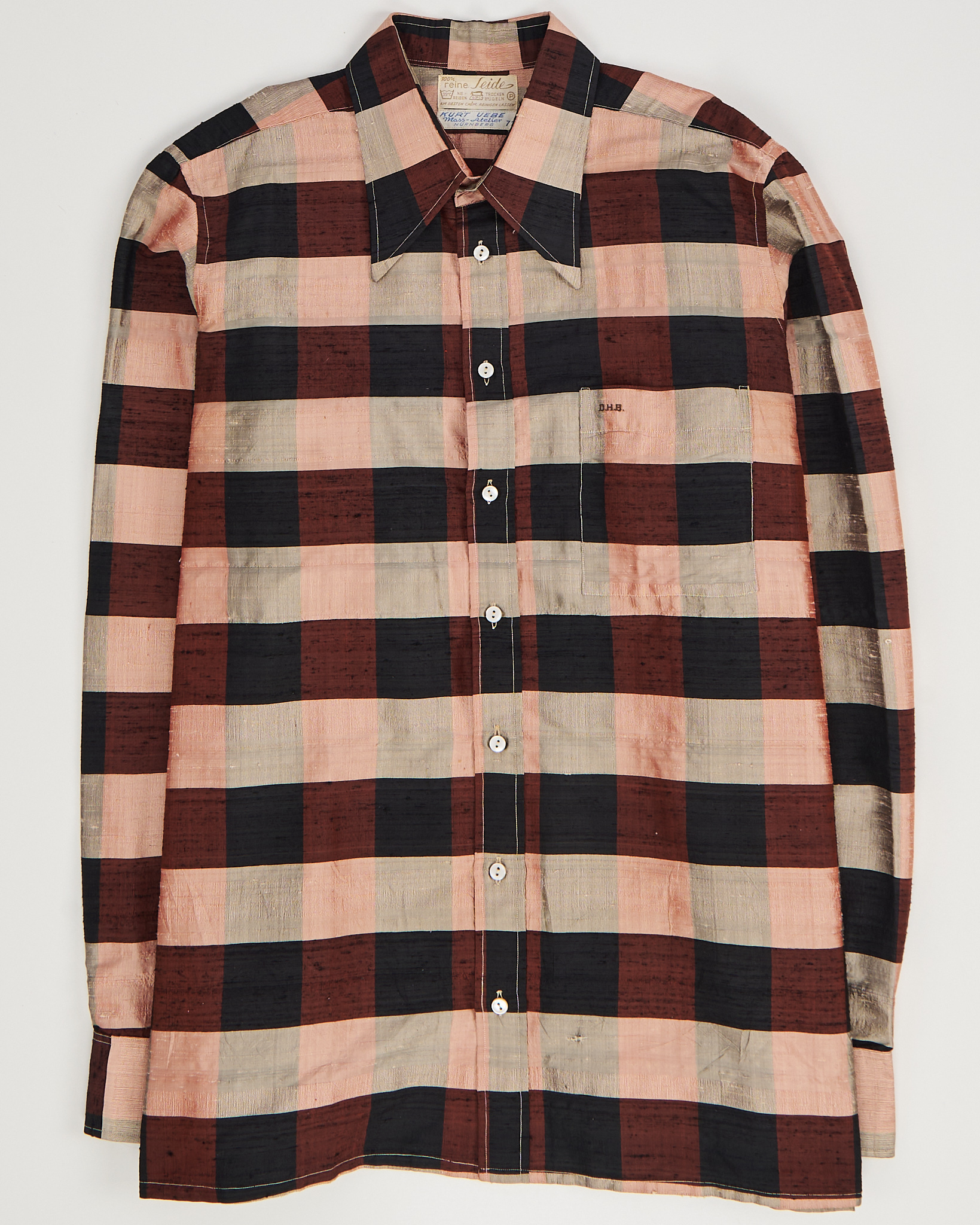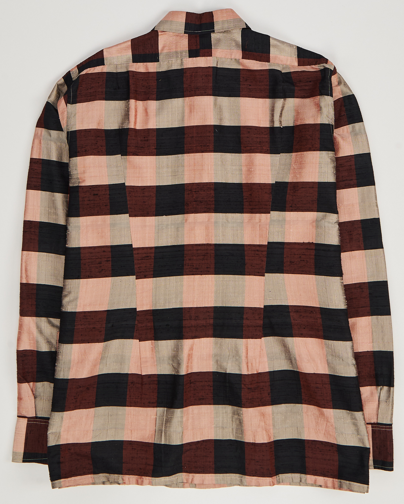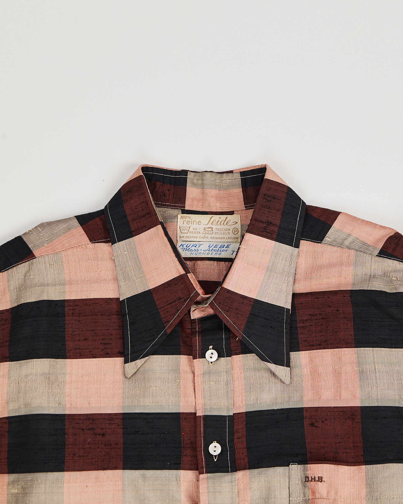 Рубашка Kurt Weber из 100% натурального шёлка. Посадка свободная, принт - крупная клетка в оттенках коричневого, бежевого и чёрного. Акцентная вышивка на груди.
