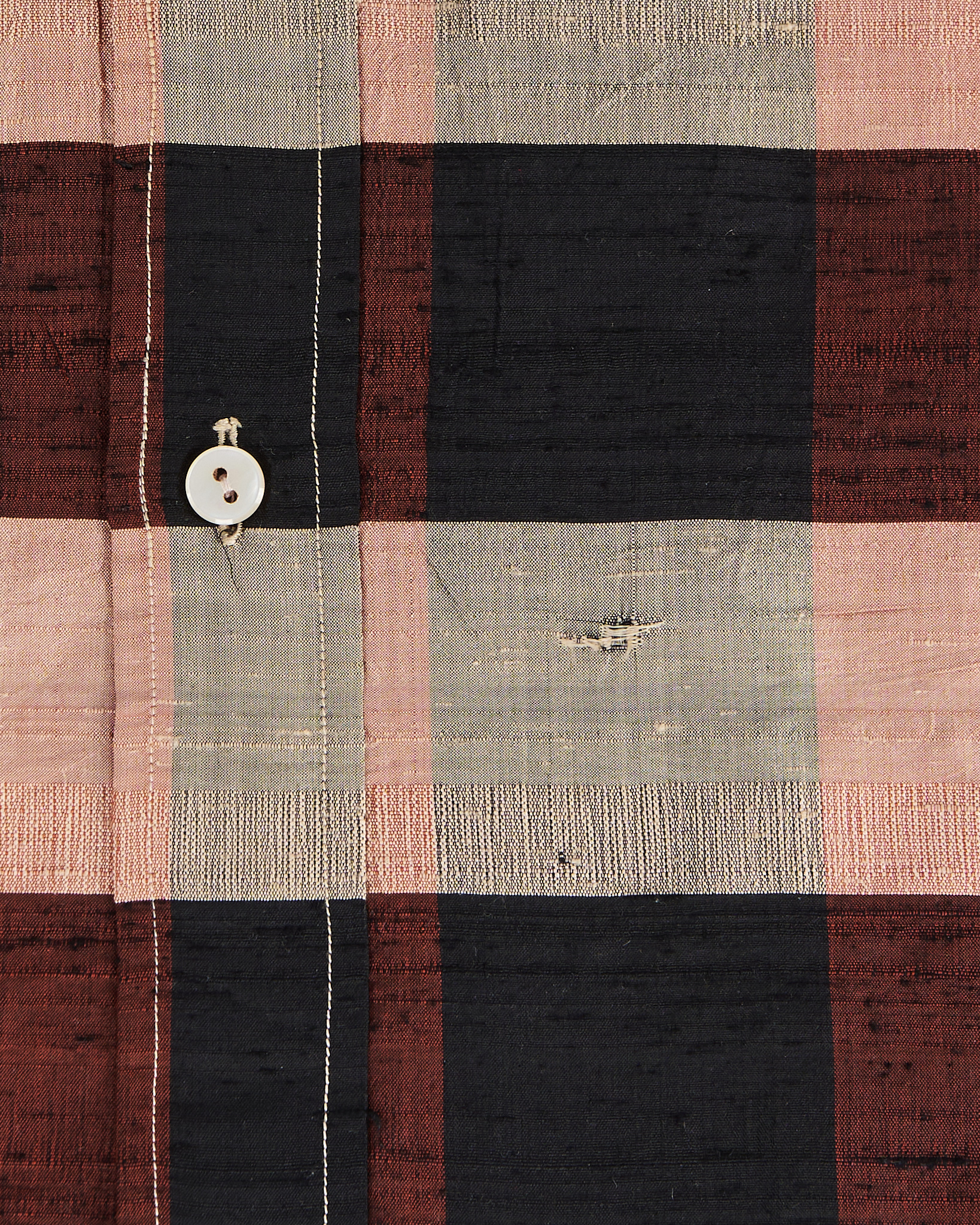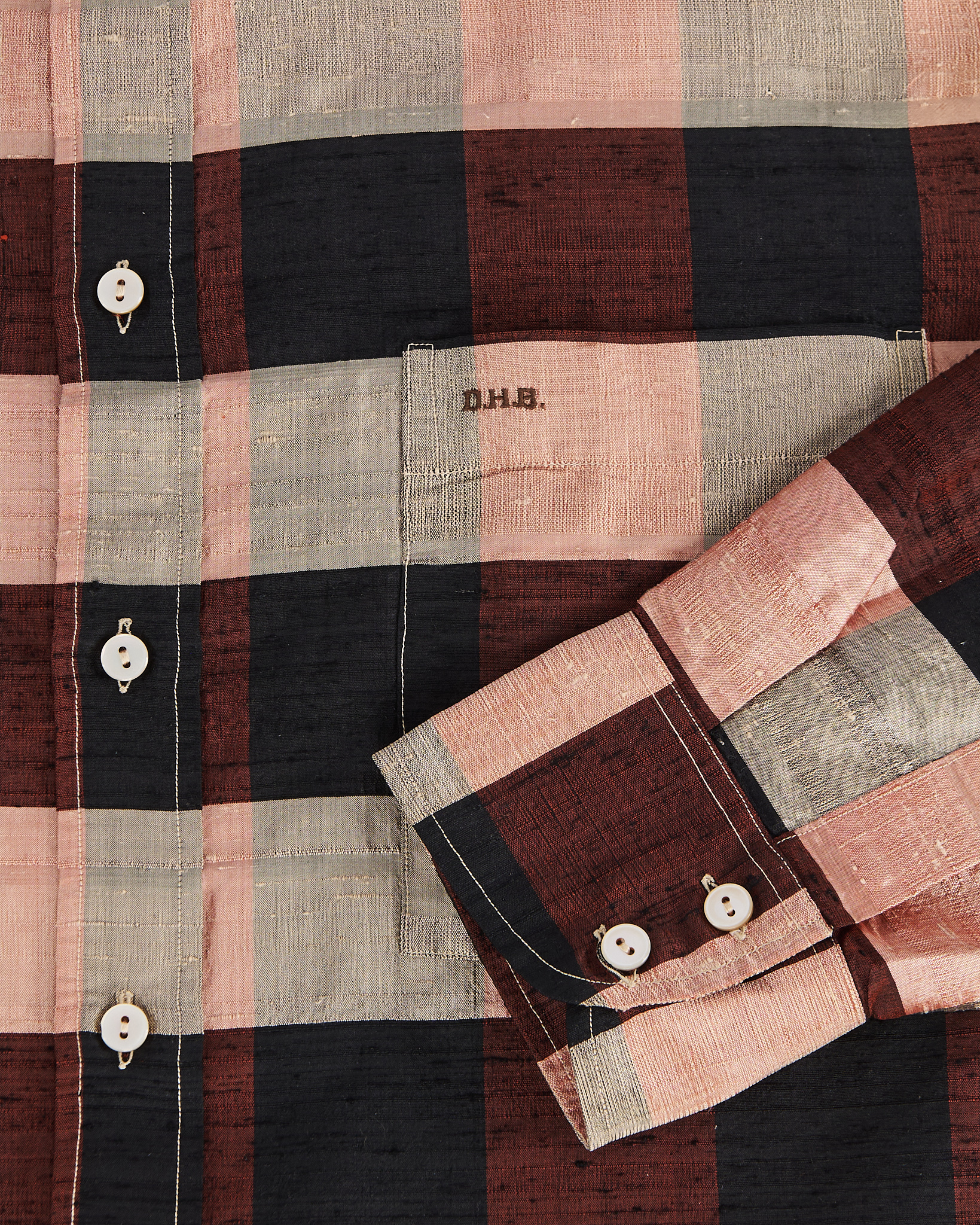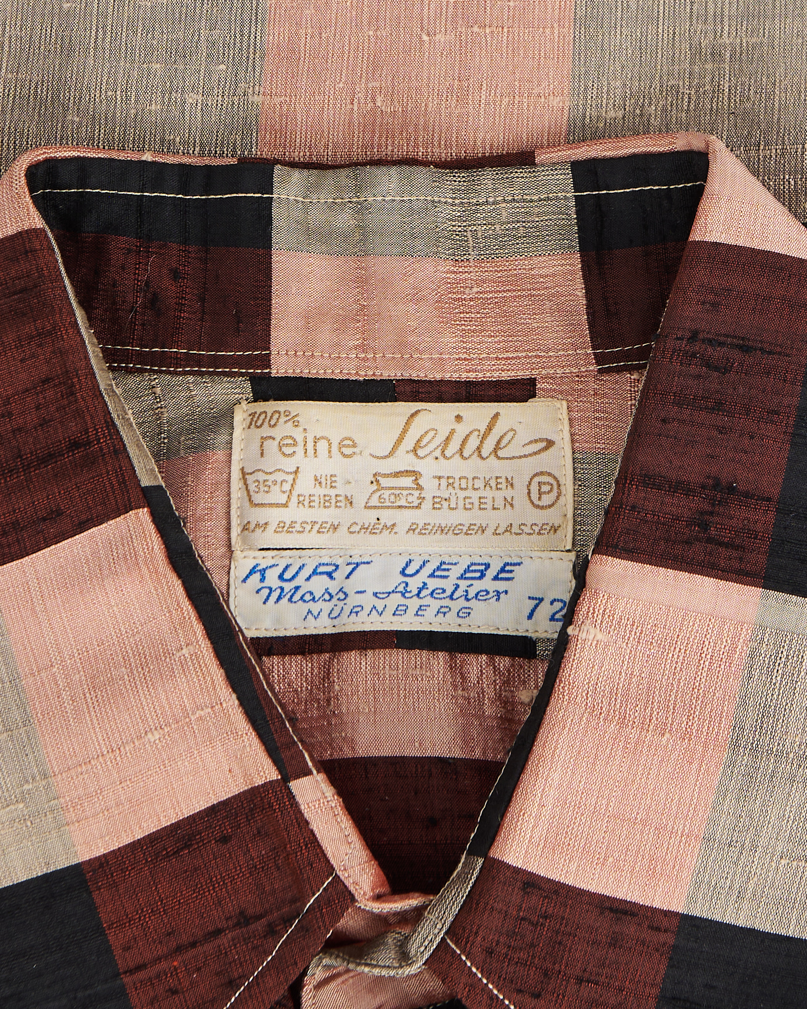 Рубашка Kurt Weber из 100% натурального шёлка. Посадка свободная, принт - крупная клетка в оттенках коричневого, бежевого и чёрного. Акцентная вышивка на груди.