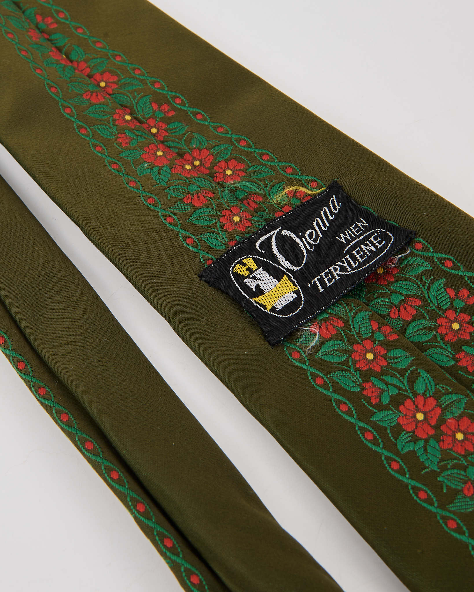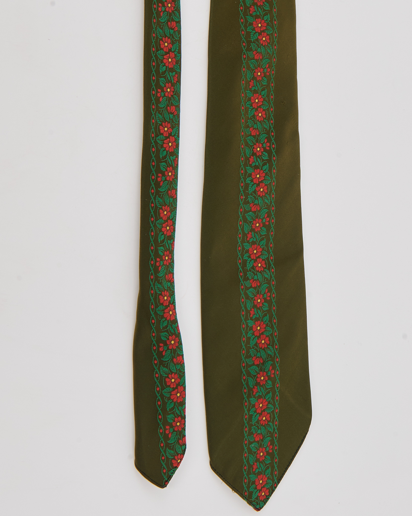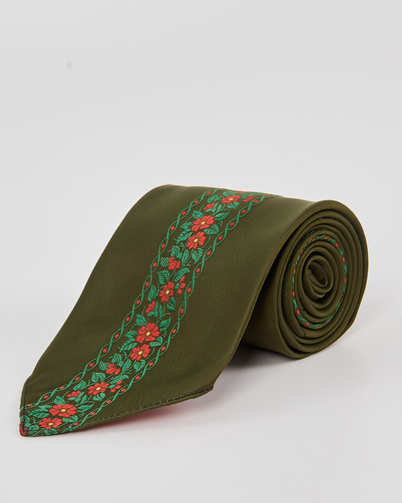 Выполнен из плотного шёлка глубокого оливкового оттенка с декоративной вышивкой с красными цветами и зелёным орнаментом.
