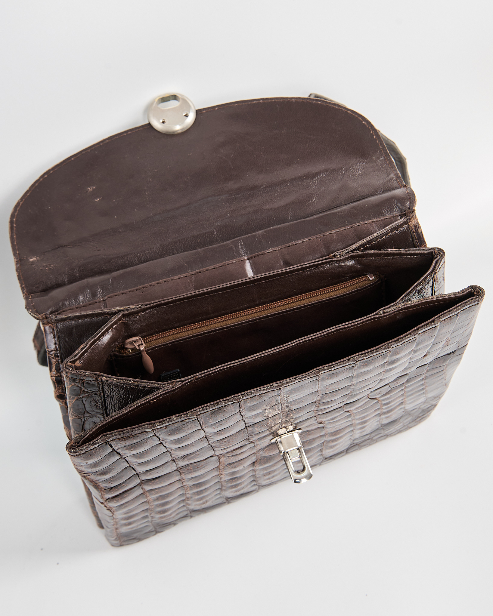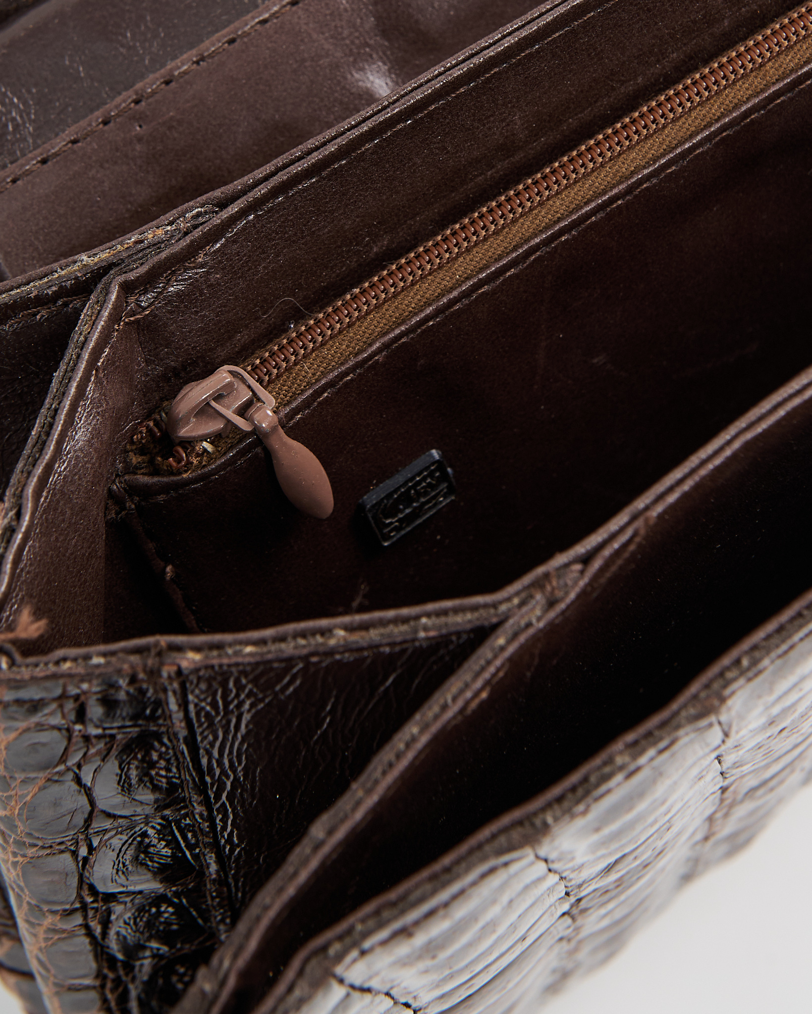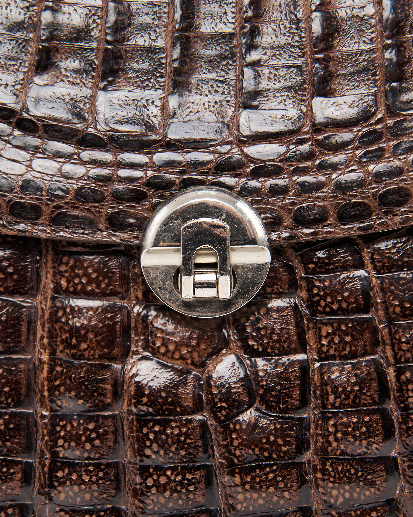 Модель из плотной тиснёной кожи с фактурой аллигатора в глубоком коричневом оттенке. Гладкая внутренняя отделка и несколько отделений. Металлическая ручка и надежный замок.