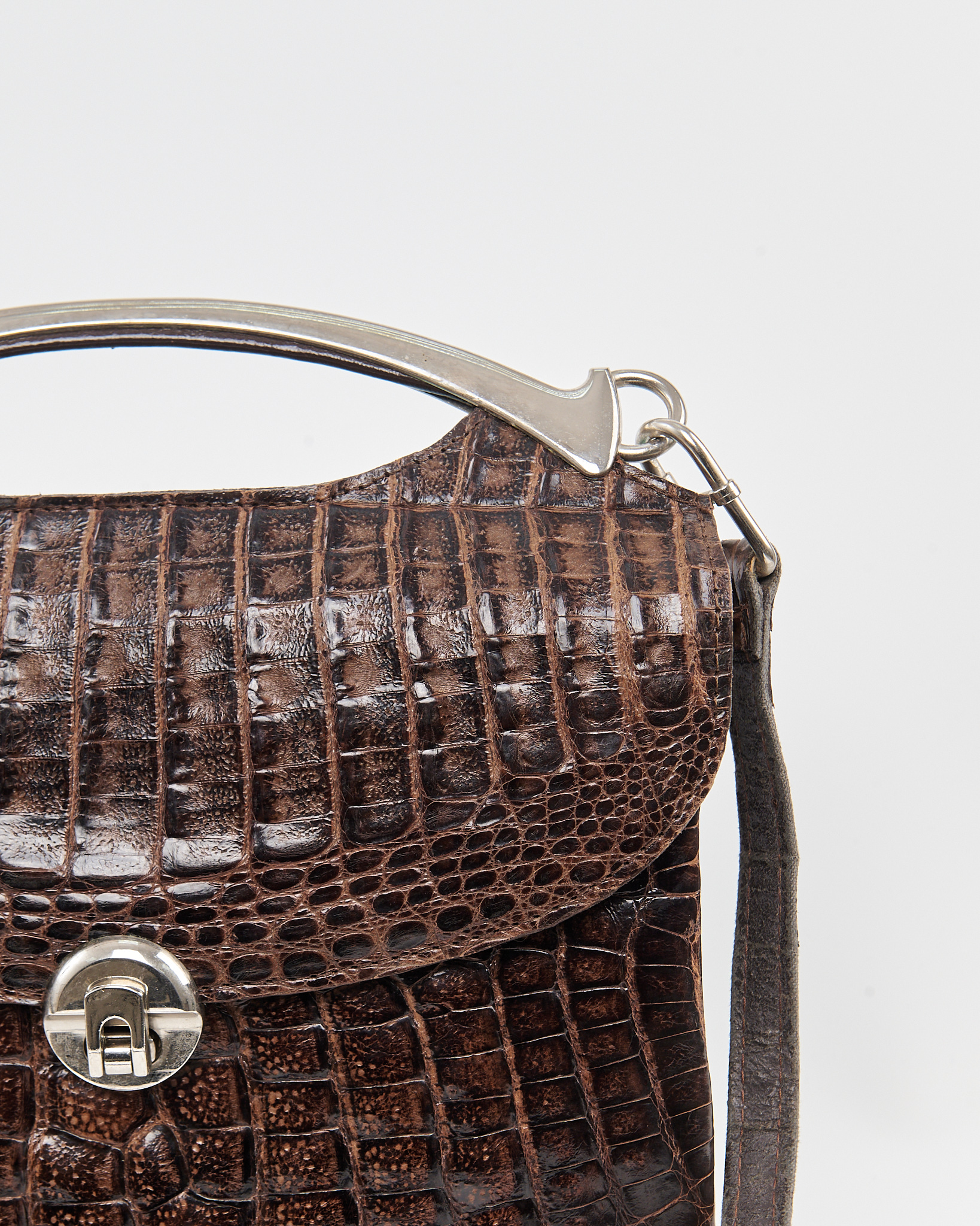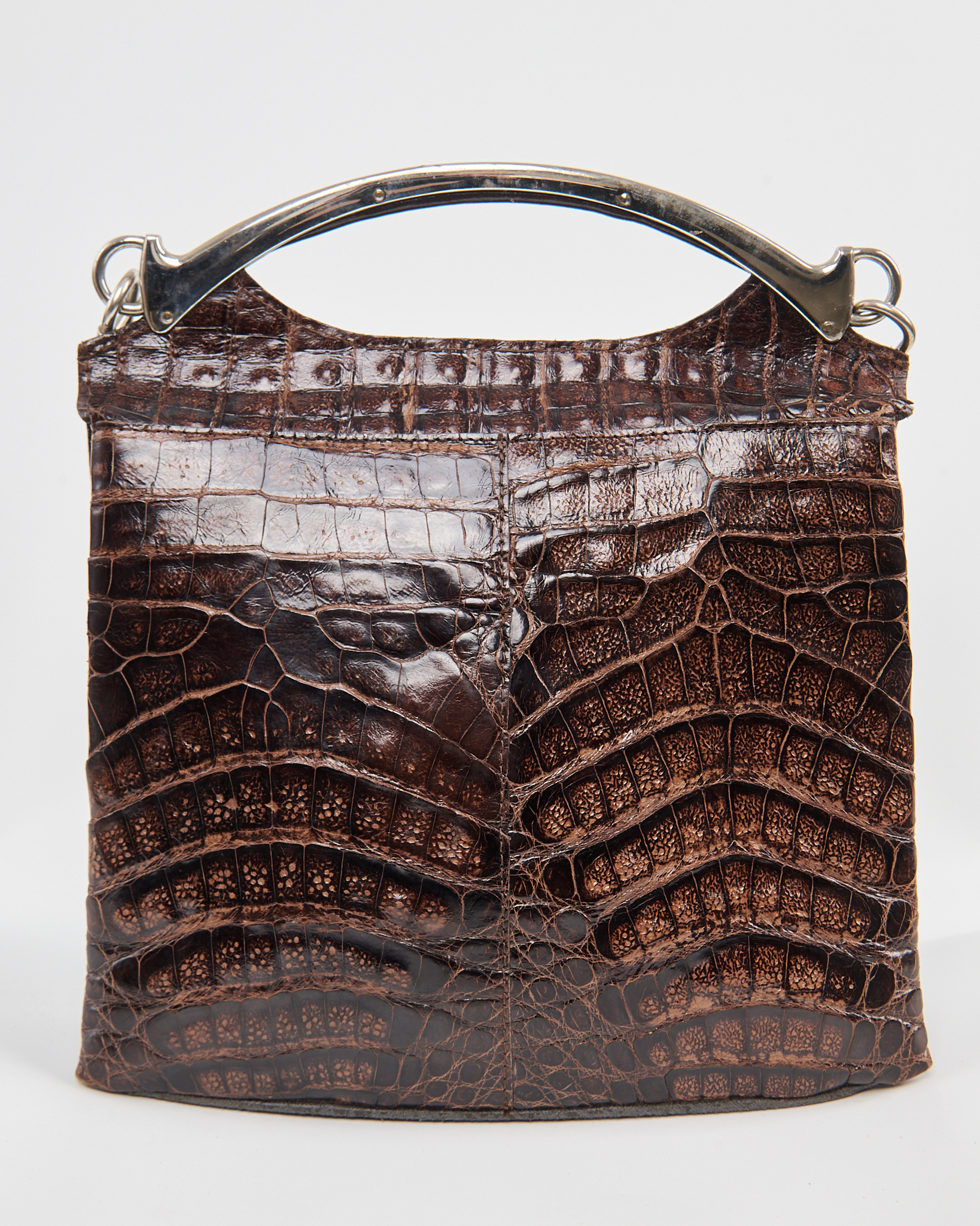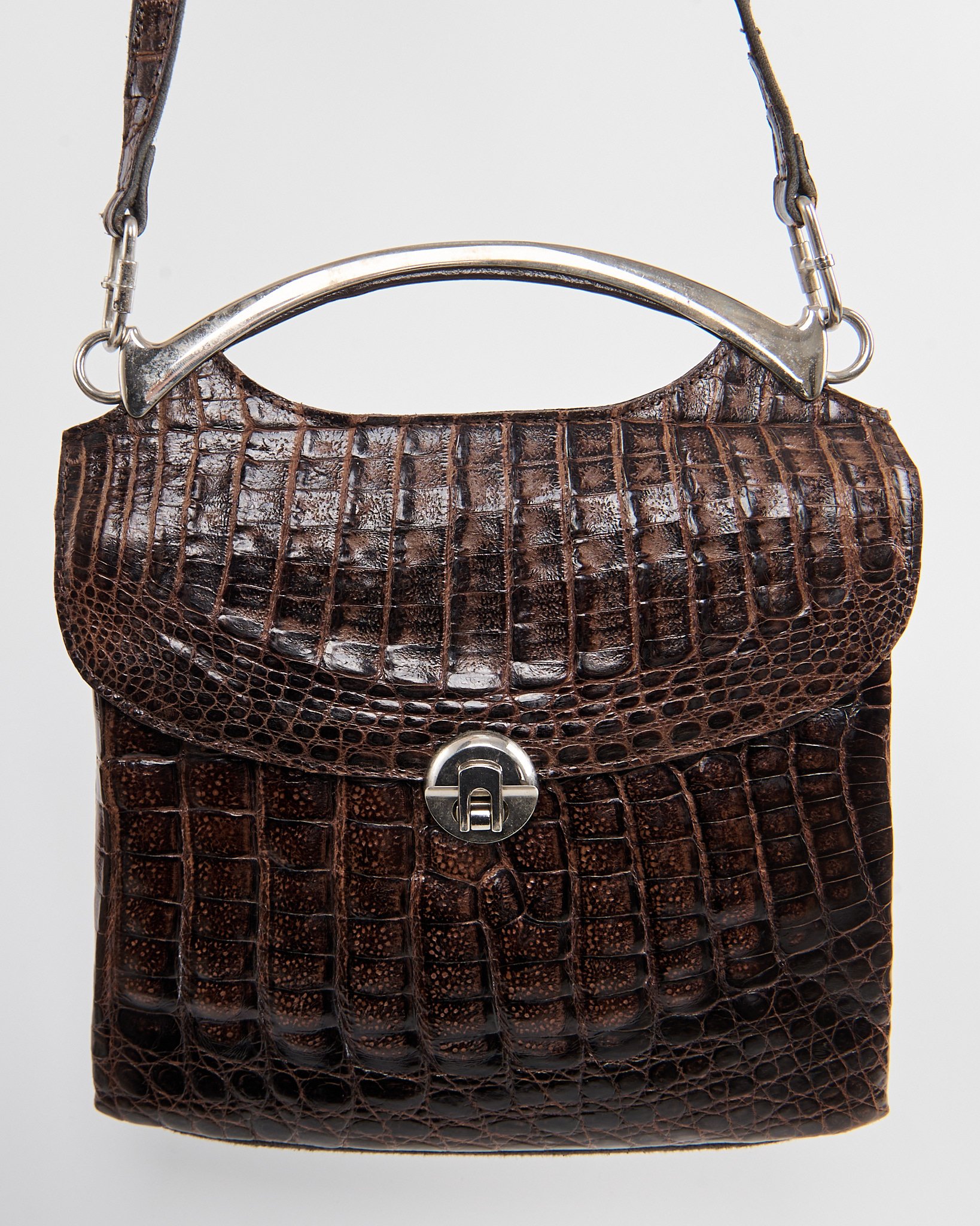 Модель из плотной тиснёной кожи с фактурой аллигатора в глубоком коричневом оттенке. Гладкая внутренняя отделка и несколько отделений. Металлическая ручка и надежный замок.