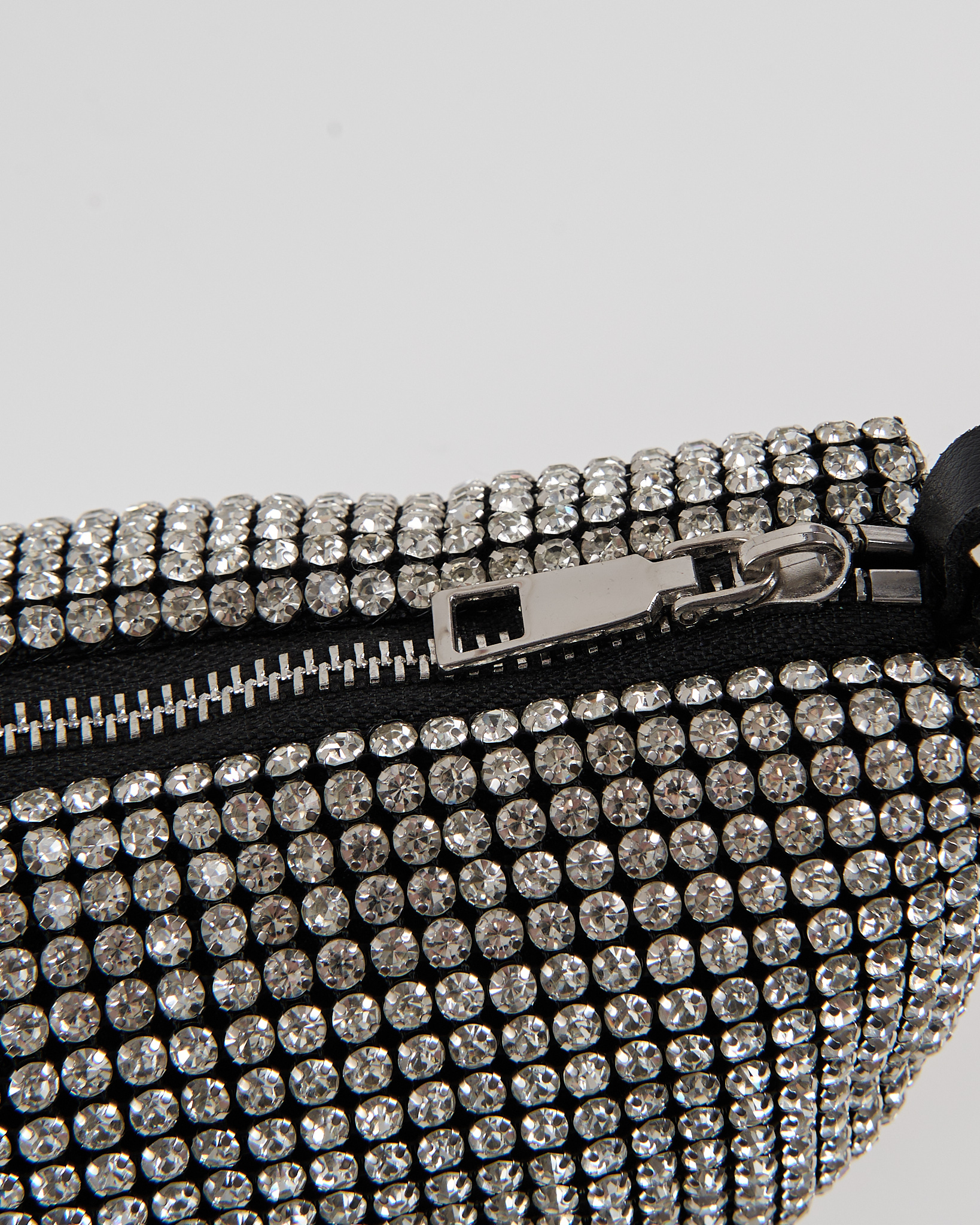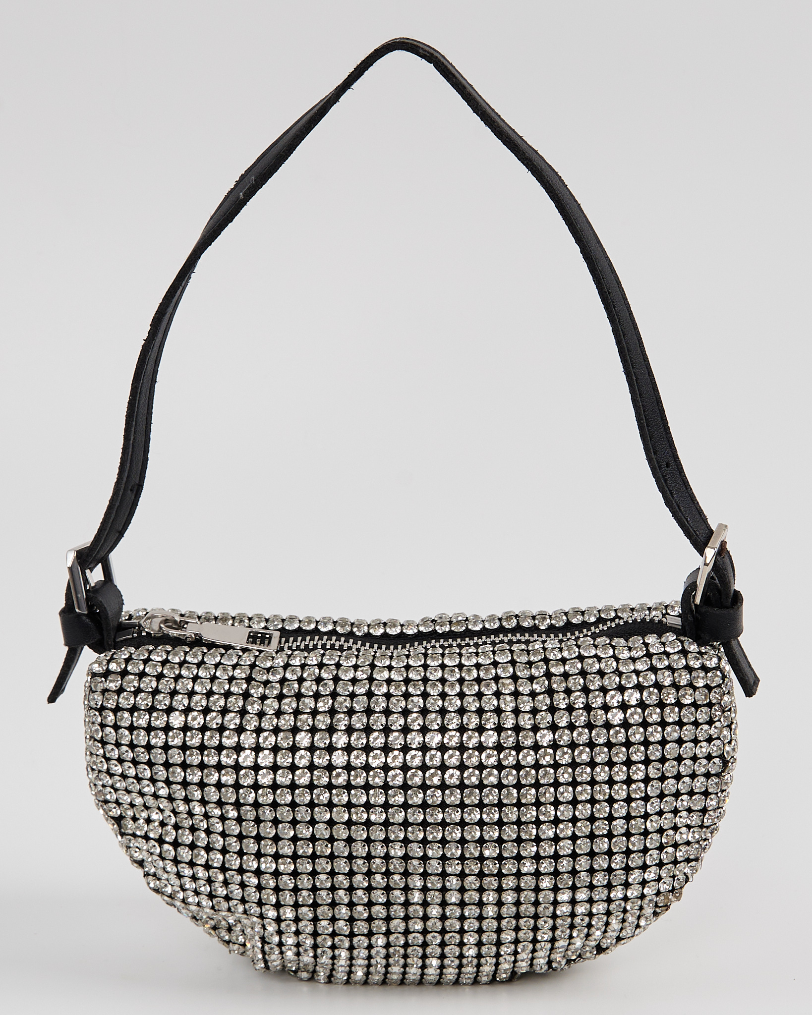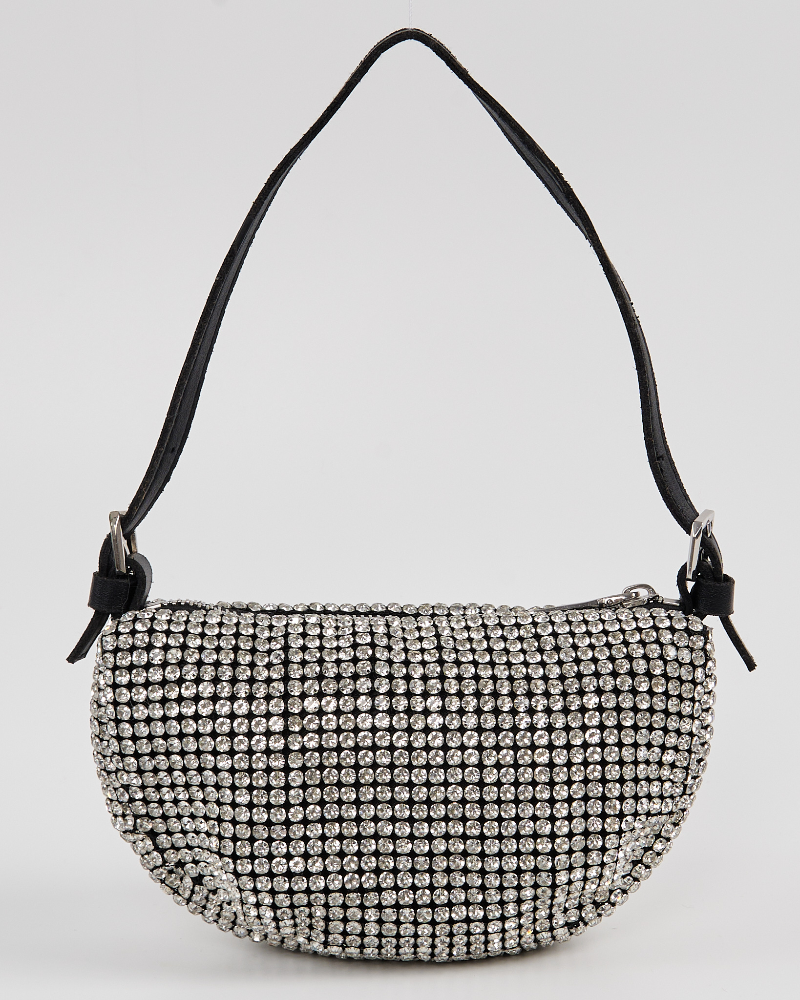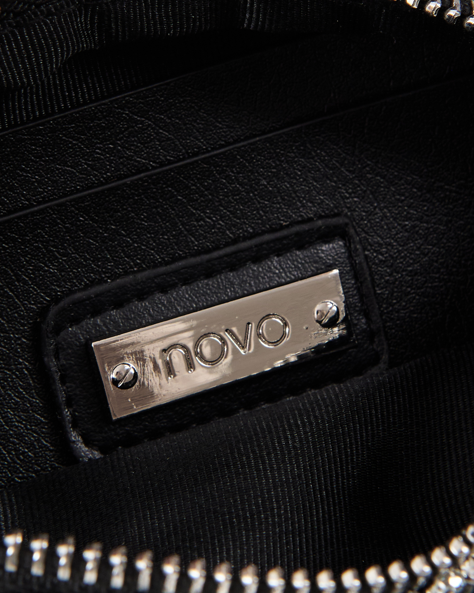 Компактная сумка NOVO с короткой ручкой. Поверхность украшена множеством сверкающих страз, небольшой формат удобно лежит в руке и аккуратно располагается на плече. Металлическая молния и кожаная ручка.