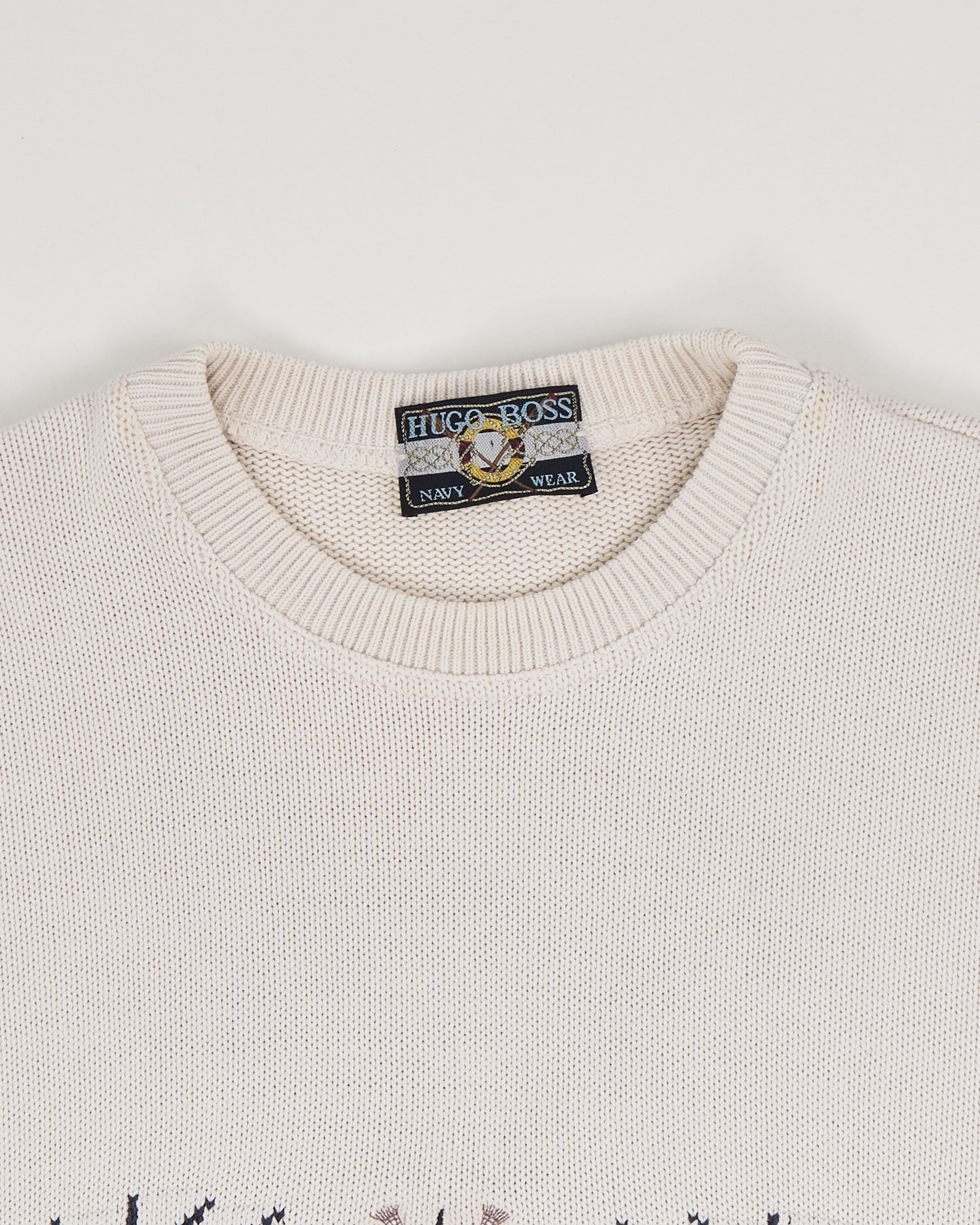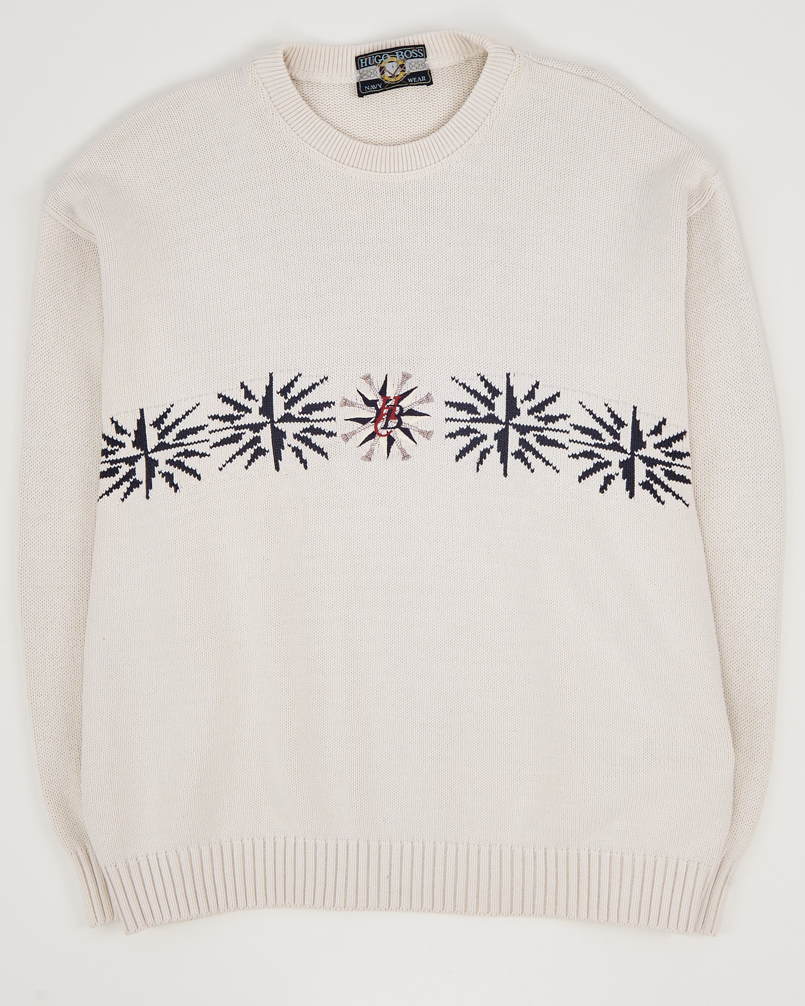 Свитер из 100% хлопка Hugo Boss Navy Wear с аккуратным круглым вырезом. Посадка свободная, контрастный орнамент по груди, фирменная нашивка.