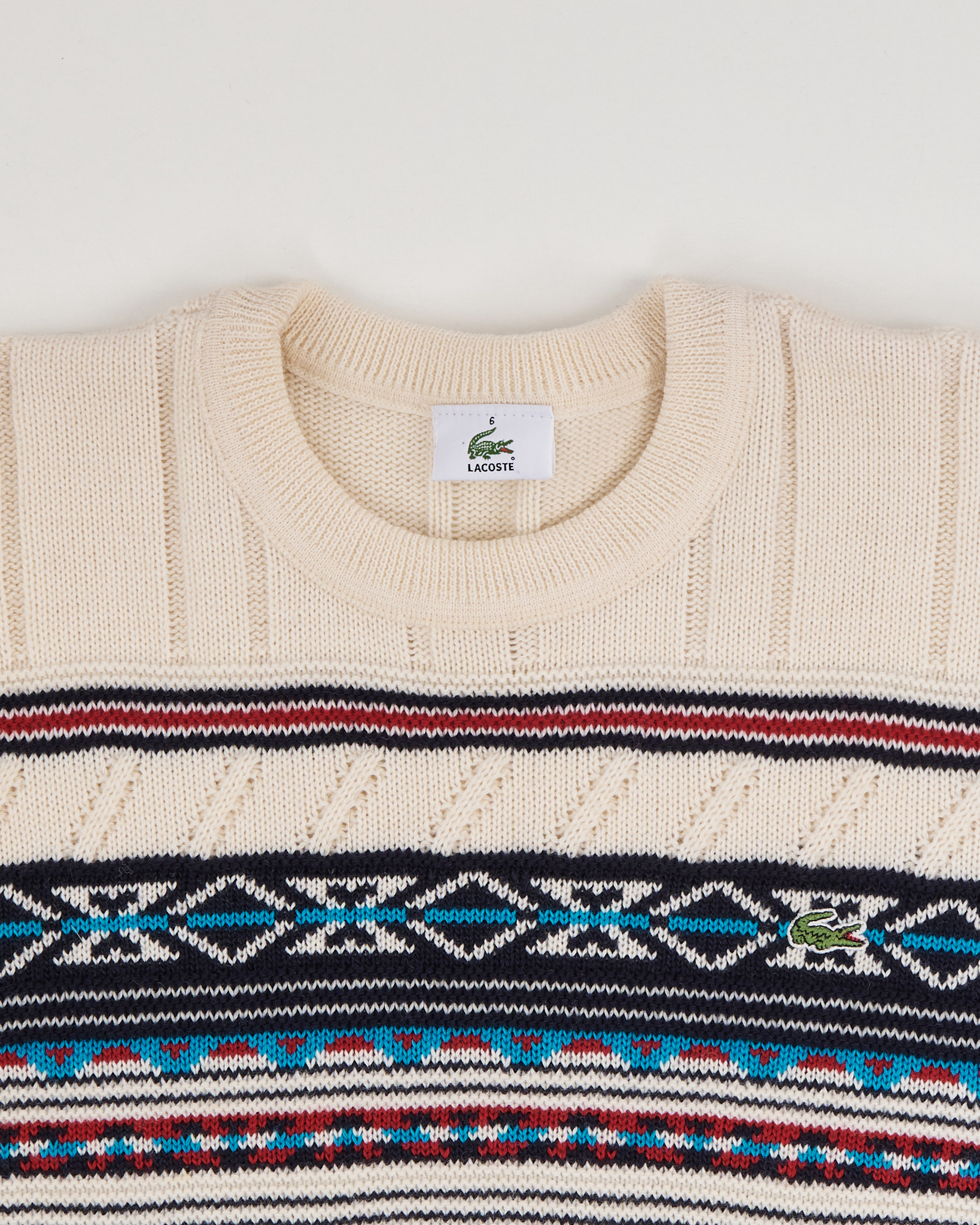 Lacoste свитер с орнаментом и фактурной вязкой. Свитер Lacoste выполнен из плотного трикотажа с выразительной вязкой и контрастным орнаментом в верхней части. Мягкая пряжа приятно ощущается на коже, сохраняет форму и держит структуру даже при активной носке. Прямой силуэт с аккуратной посадкой по плечам и эластичными манжетами создаёт собранный, уверенный образ. Фирменный логотип-крокодил и сложная комбинация узоров делают модель заметной в коллекции и подчёркивают её характер. Вещь для тех, кто ценит продуманные детали и качество исполнения культового бренда.