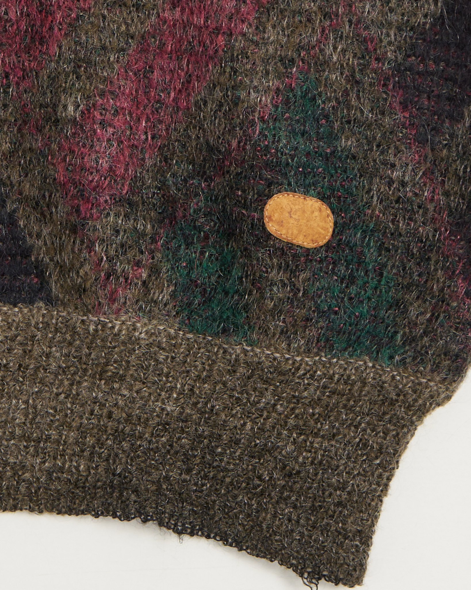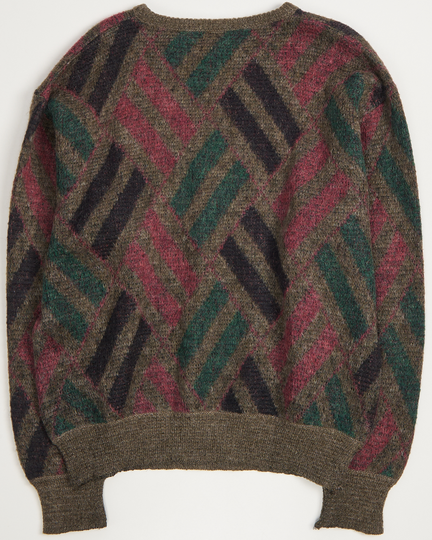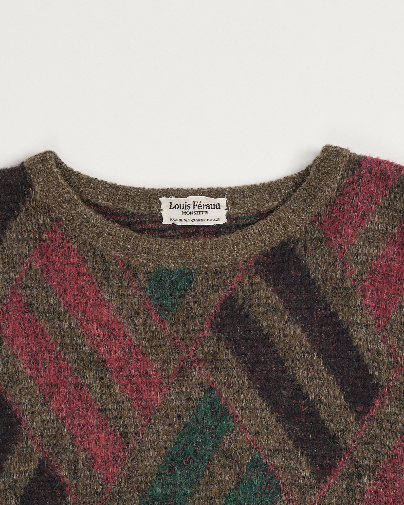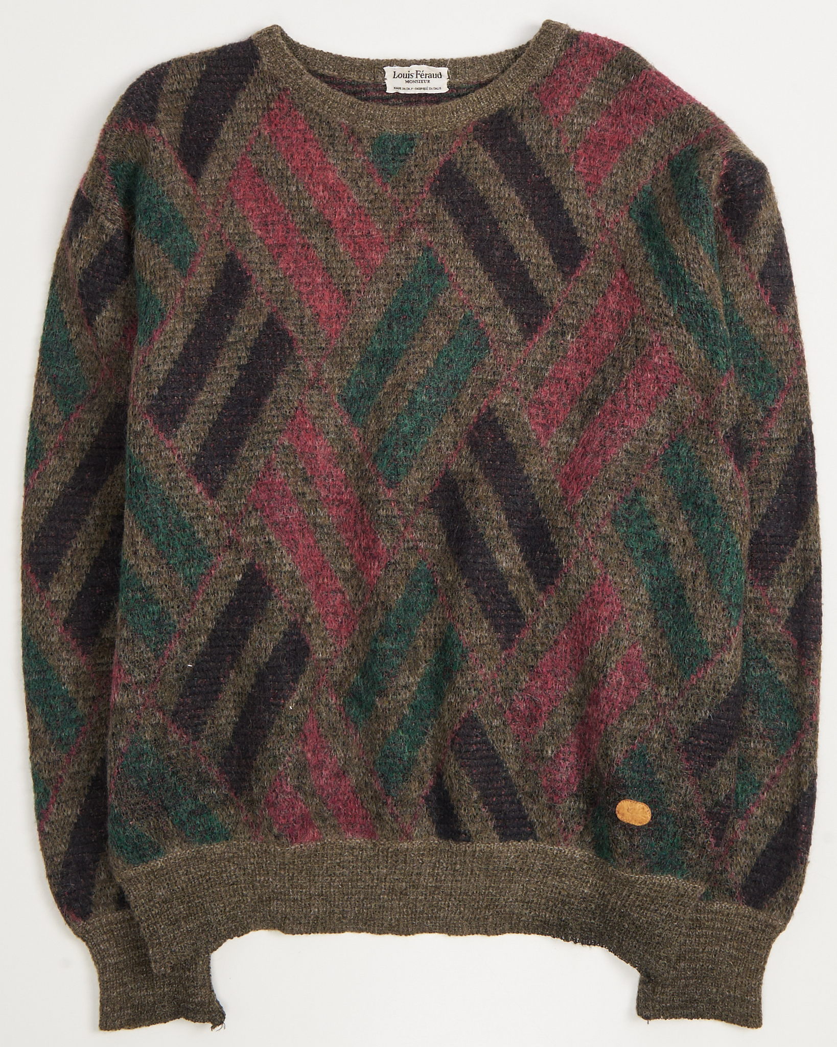 Свитер Louis Féraud из шерсти и мохера. Крупный диагональный узор со сложными оттенками оливкового, бордового и темно-синего. Свободная посадка оверсайз. Итальянское качество и фирменная кожаная нашивка.