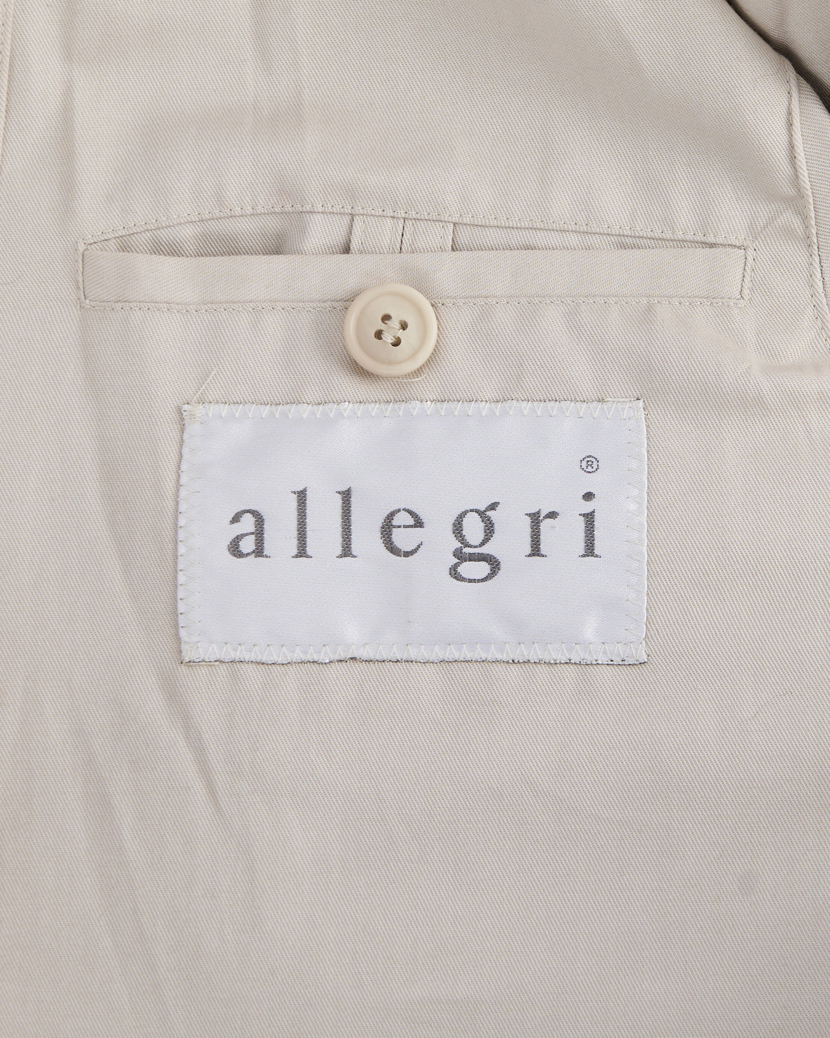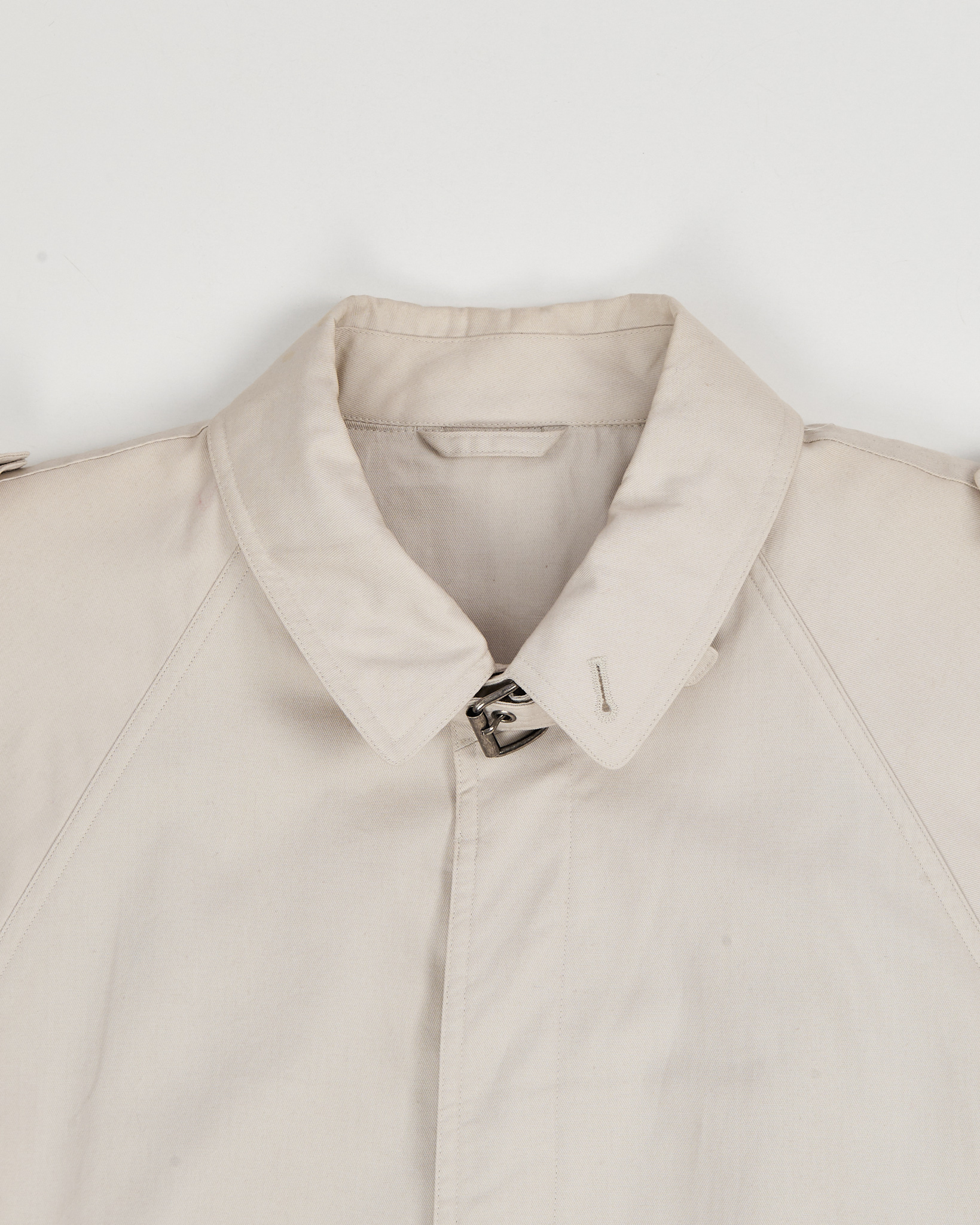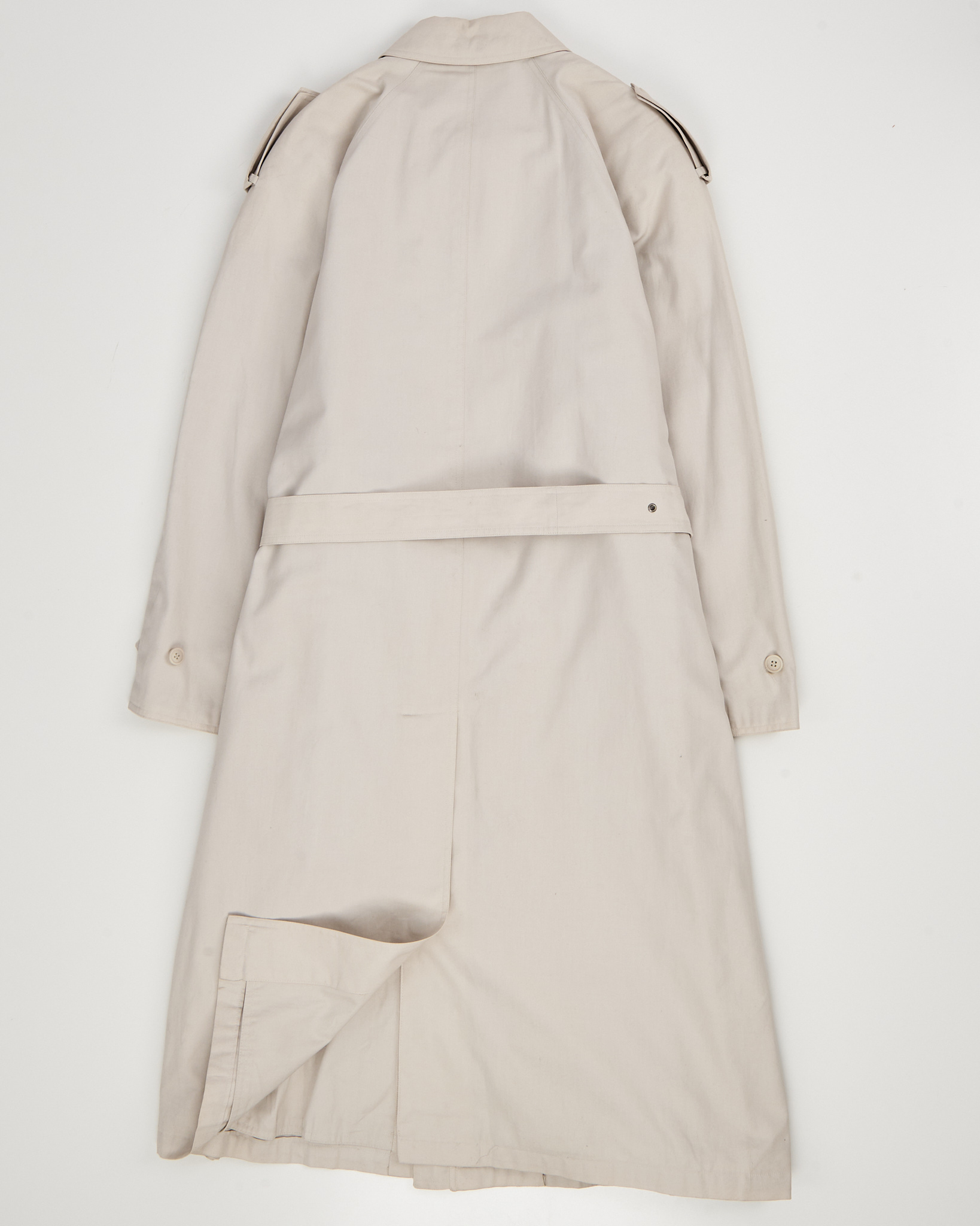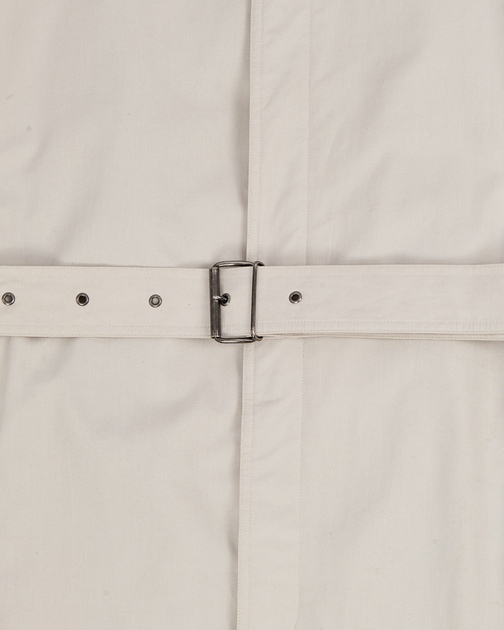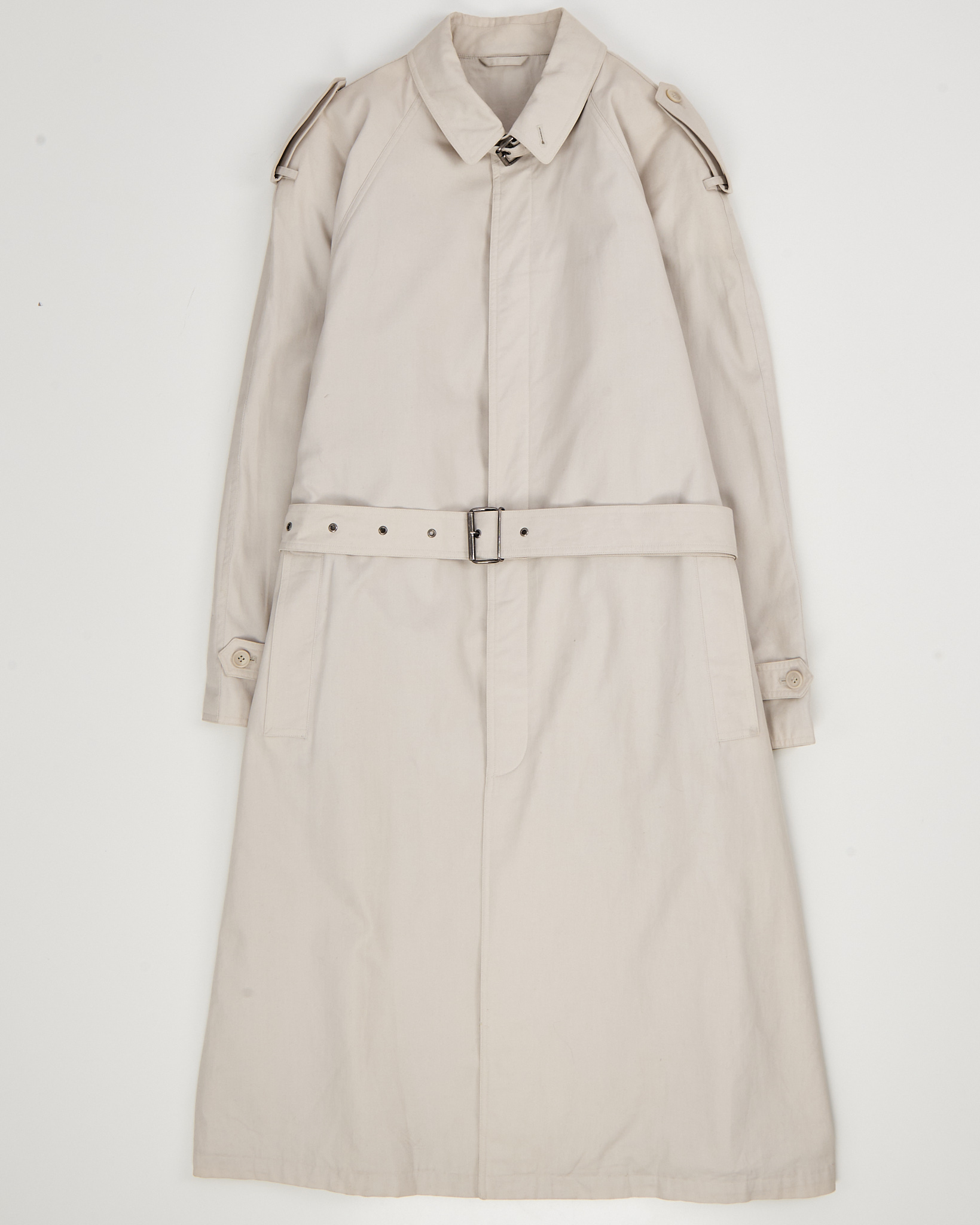 Тренч выполнен из плотного хлопкового материала светло-бежевого цвета. Посадка свободная, рукава с линией реглан. Пояс с металлической пряжкой, погоны на плечах и функциональные карманы.
