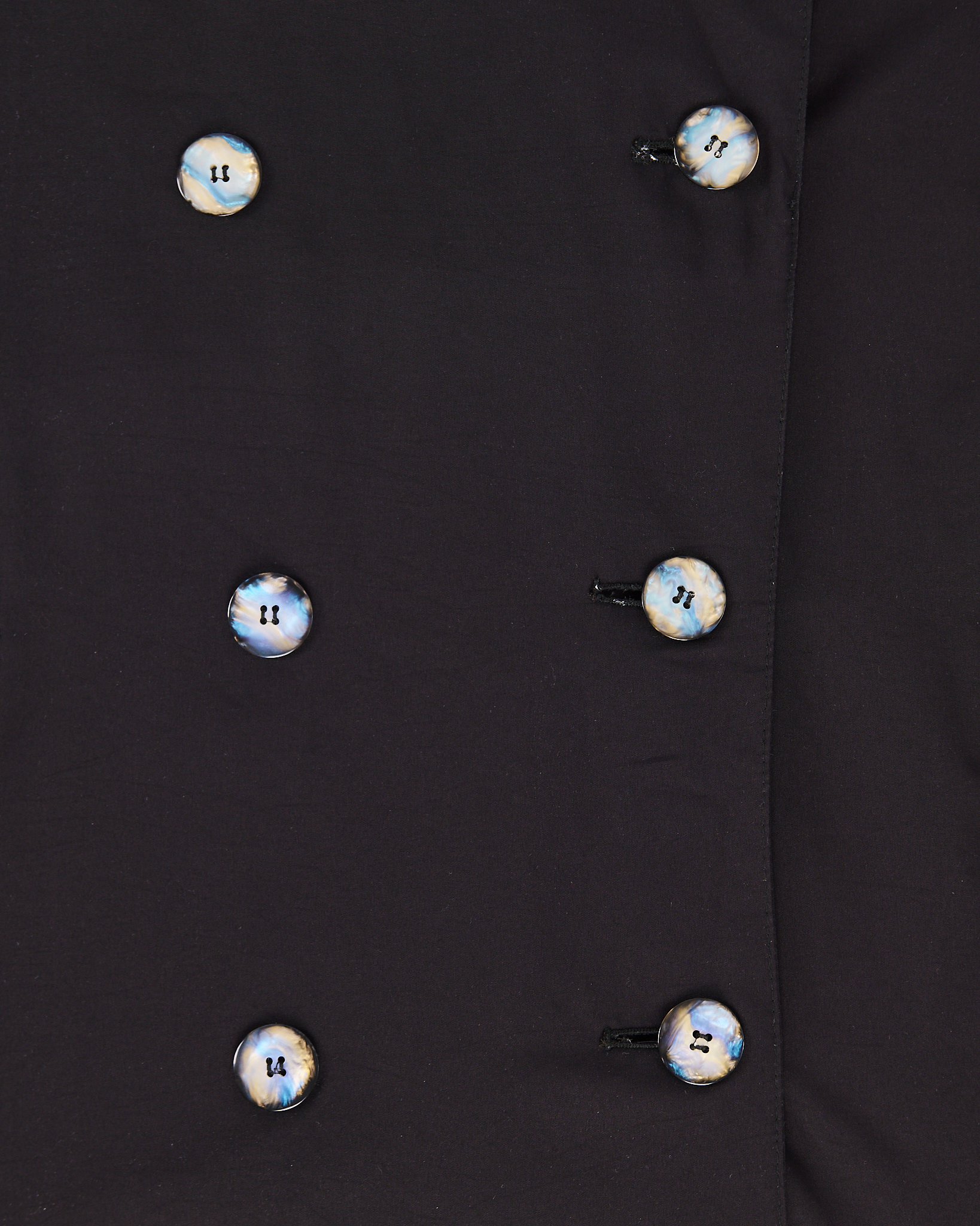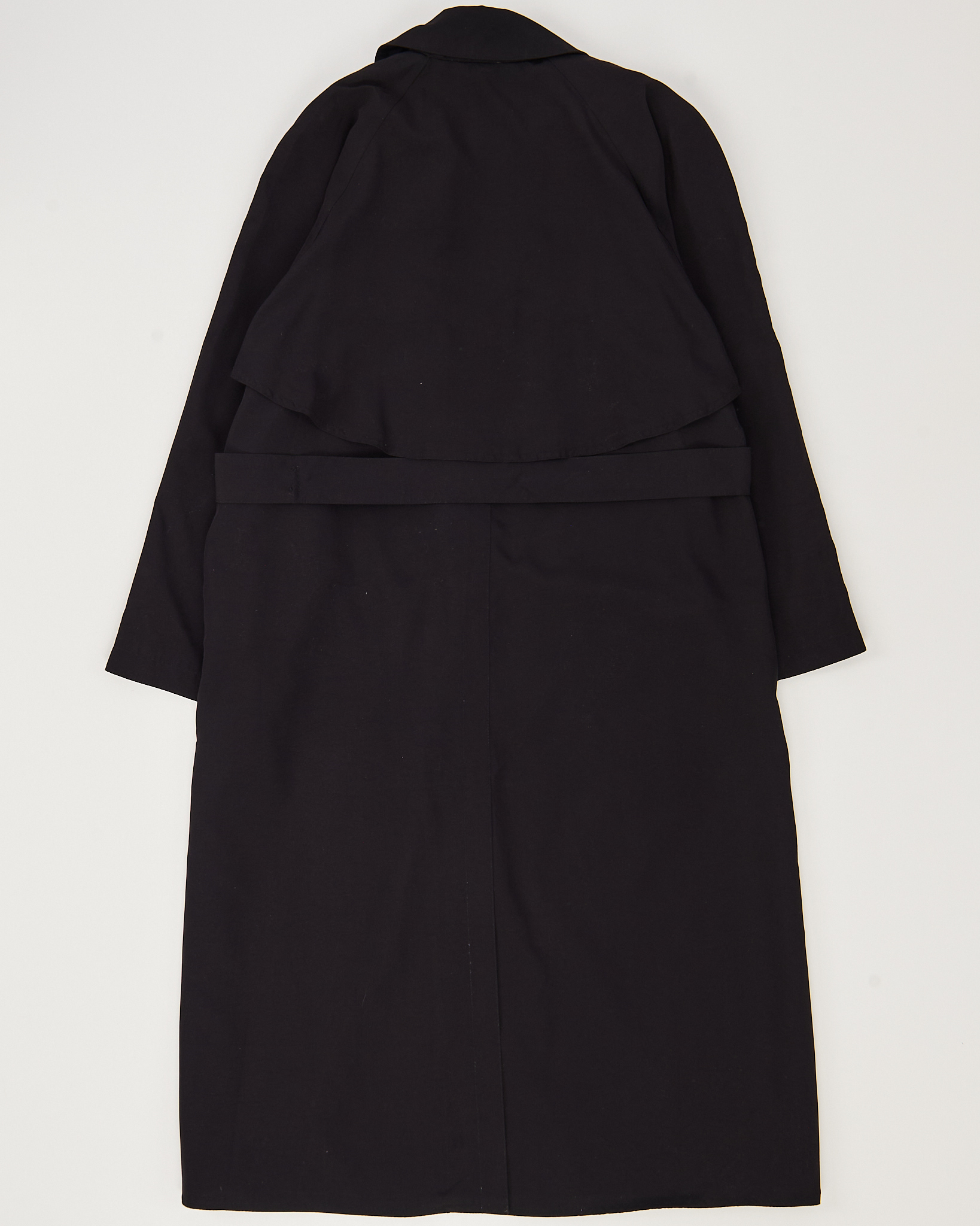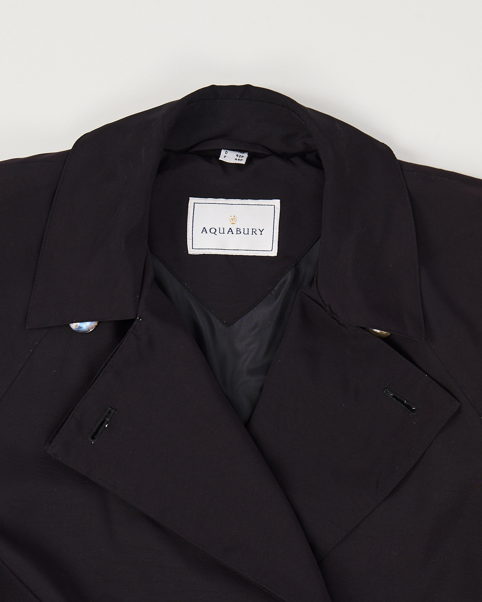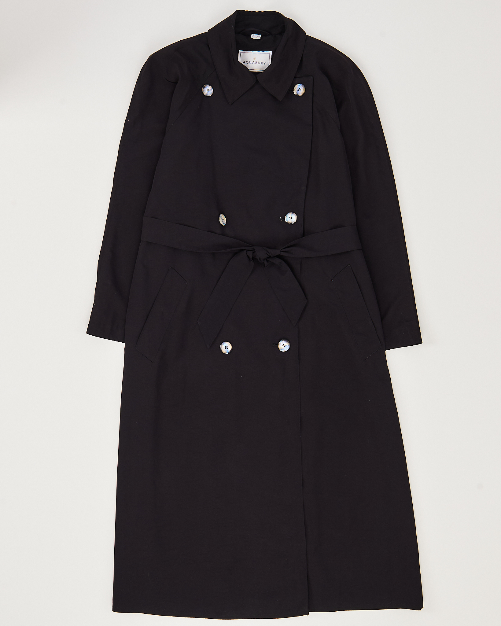 Тренч от бренда Aquabury из плотной гладкой ткани тёмного оттенка. Посадка прямая, пояс регулирует объём по талии. Двубортная застёжка с акцентными перламутровыми пуговицами выразительными пуговицами формирует строгую геометрию.