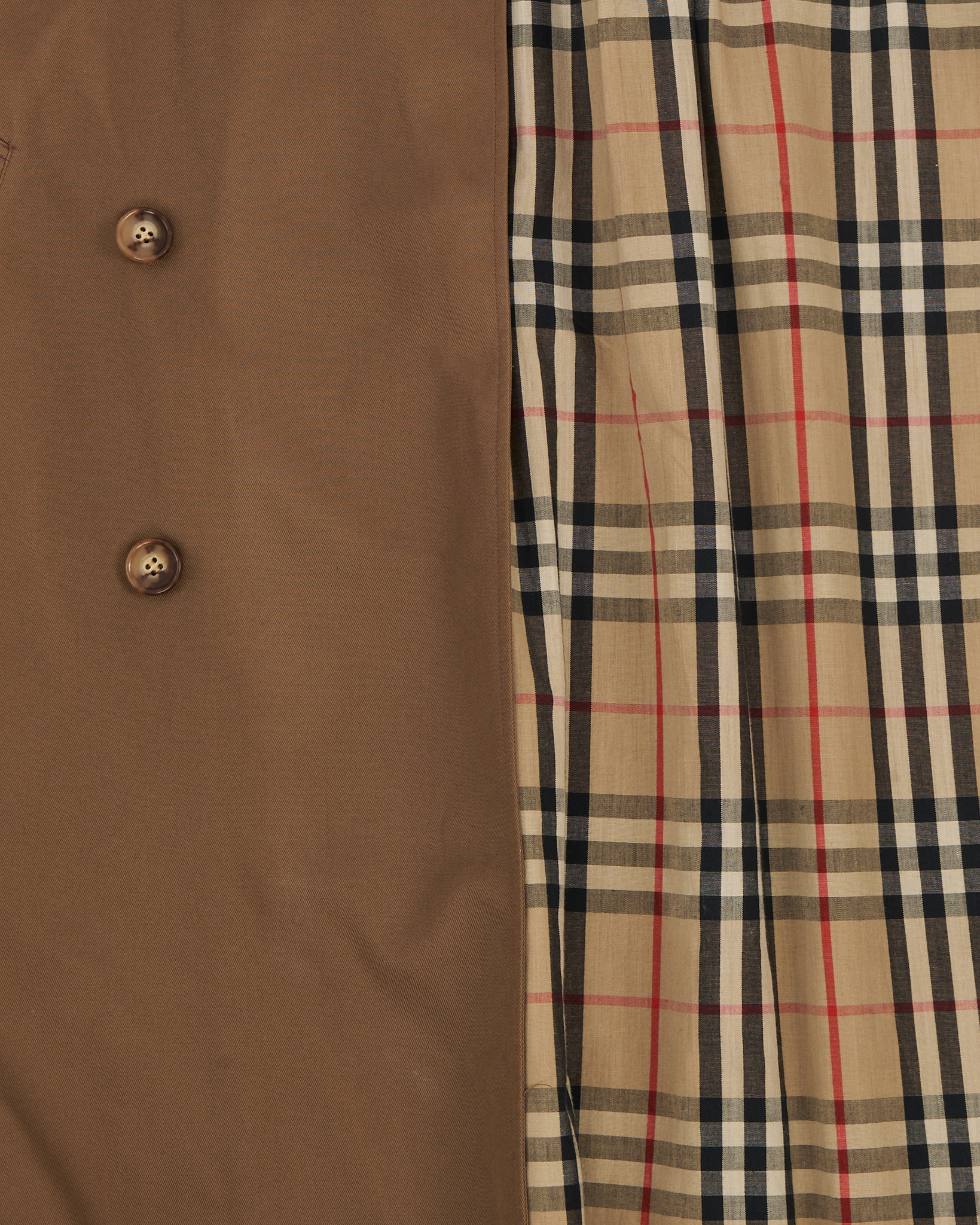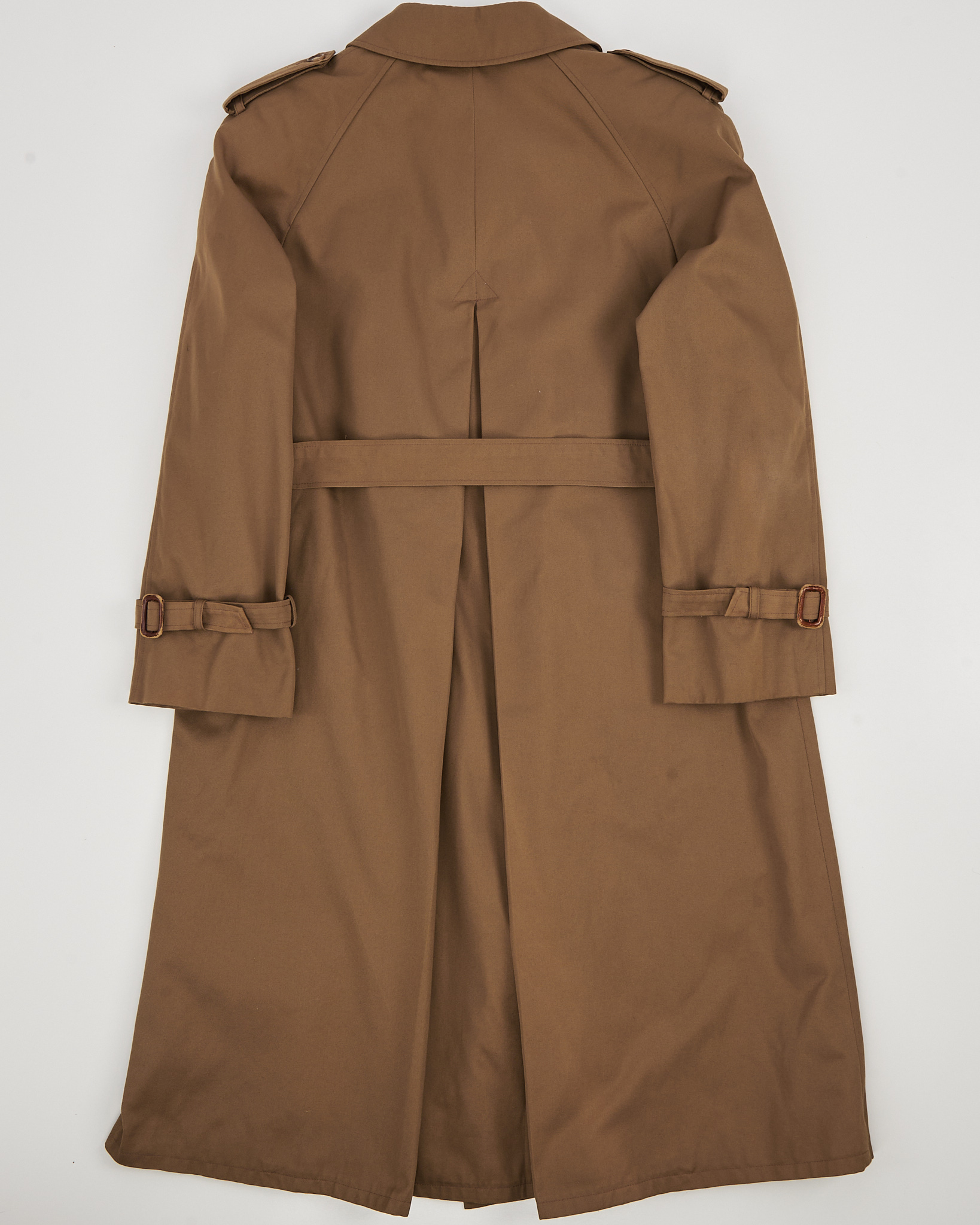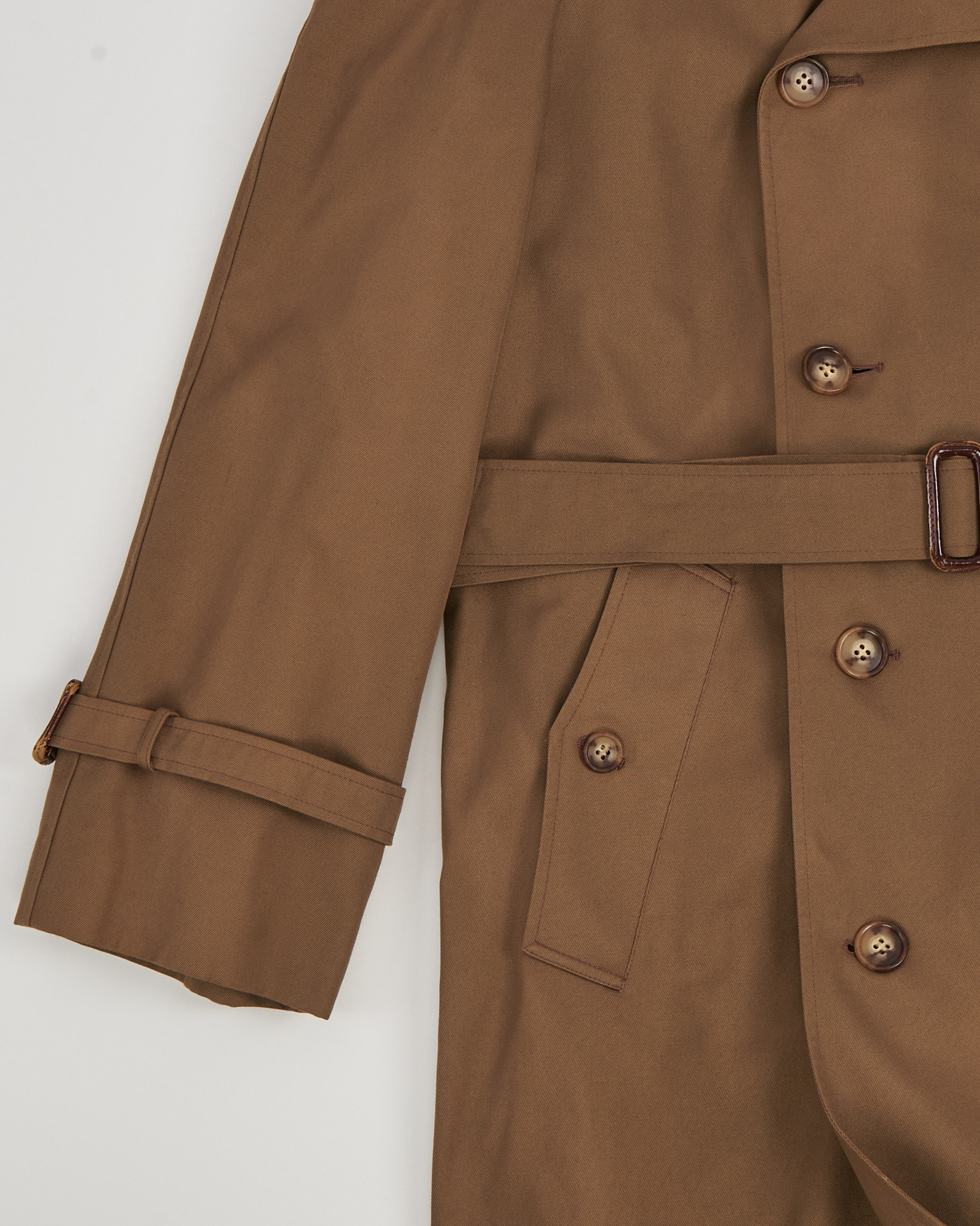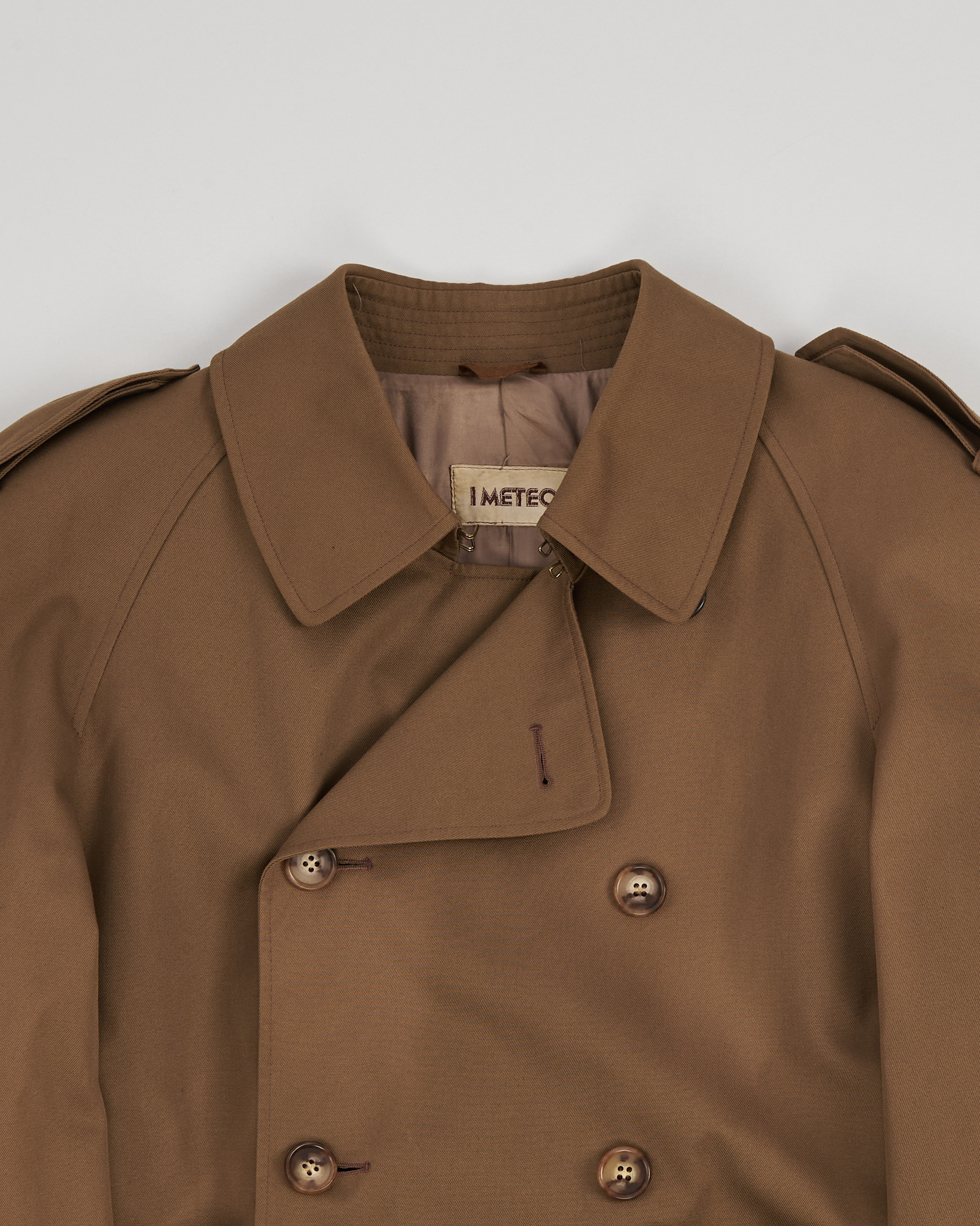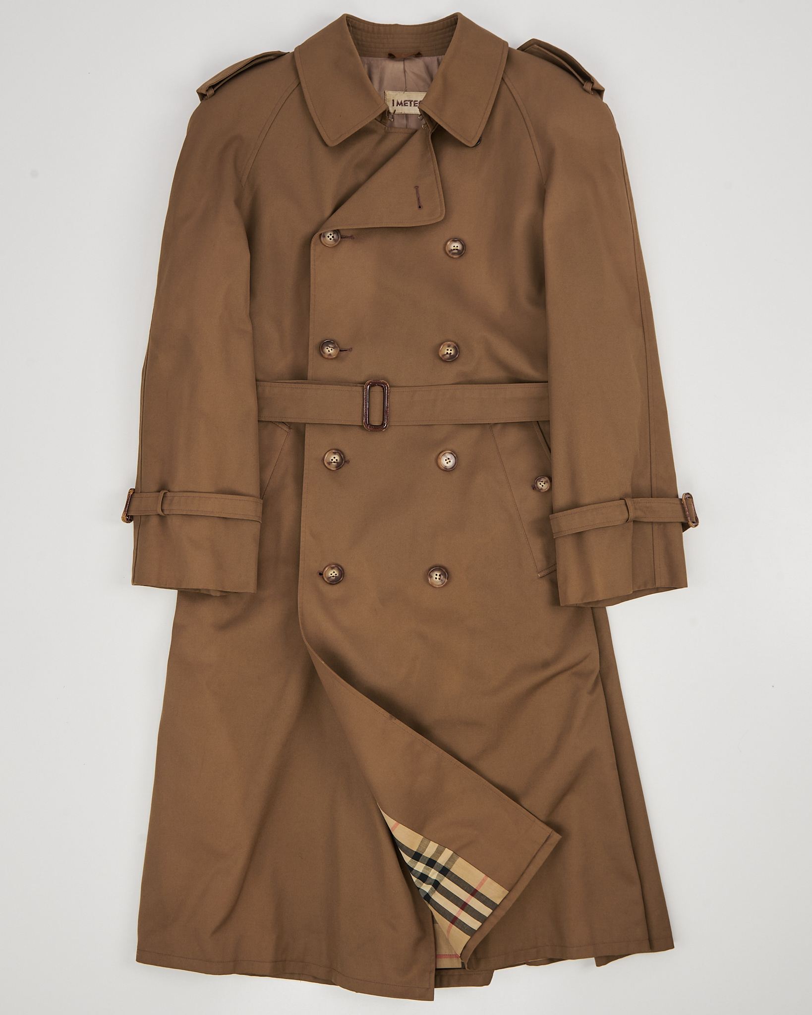 Тренч I Meteo из плотного хлопкового материала тёплого карамельного оттенка. Двубортная модель, погоны и пояс формируют чёткую посадку. Внутри — фирменная клетчатая подкладка, функциональные карманы.