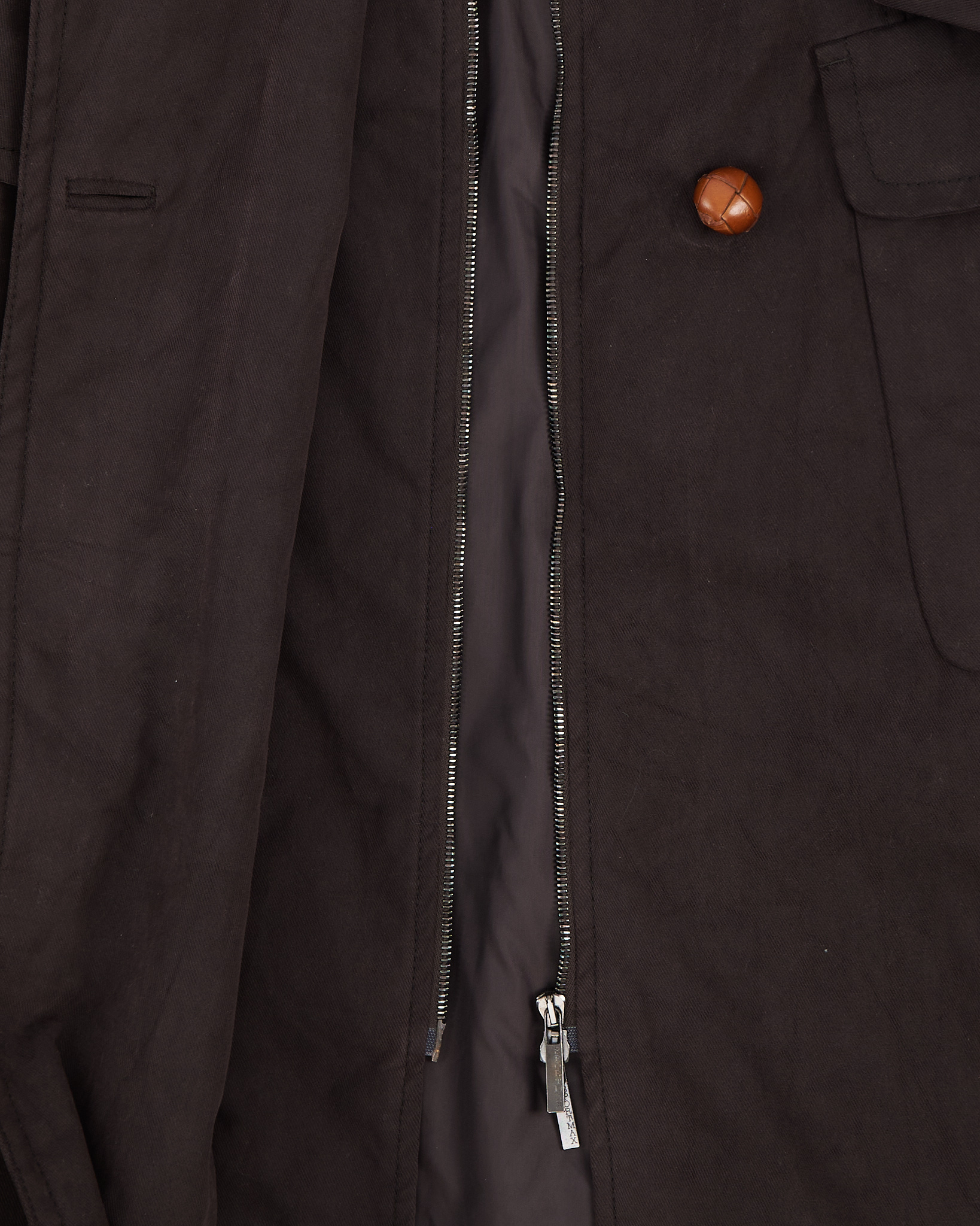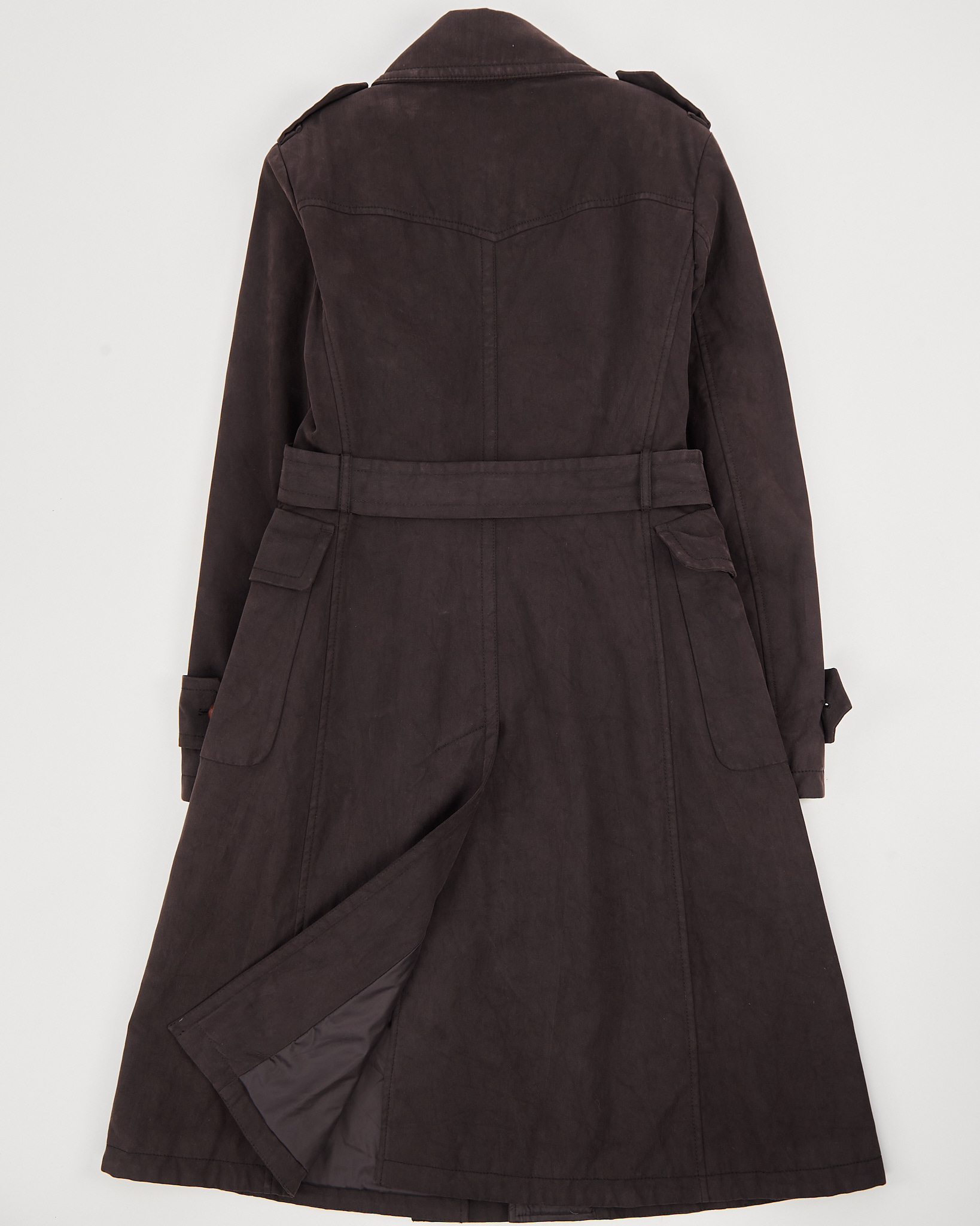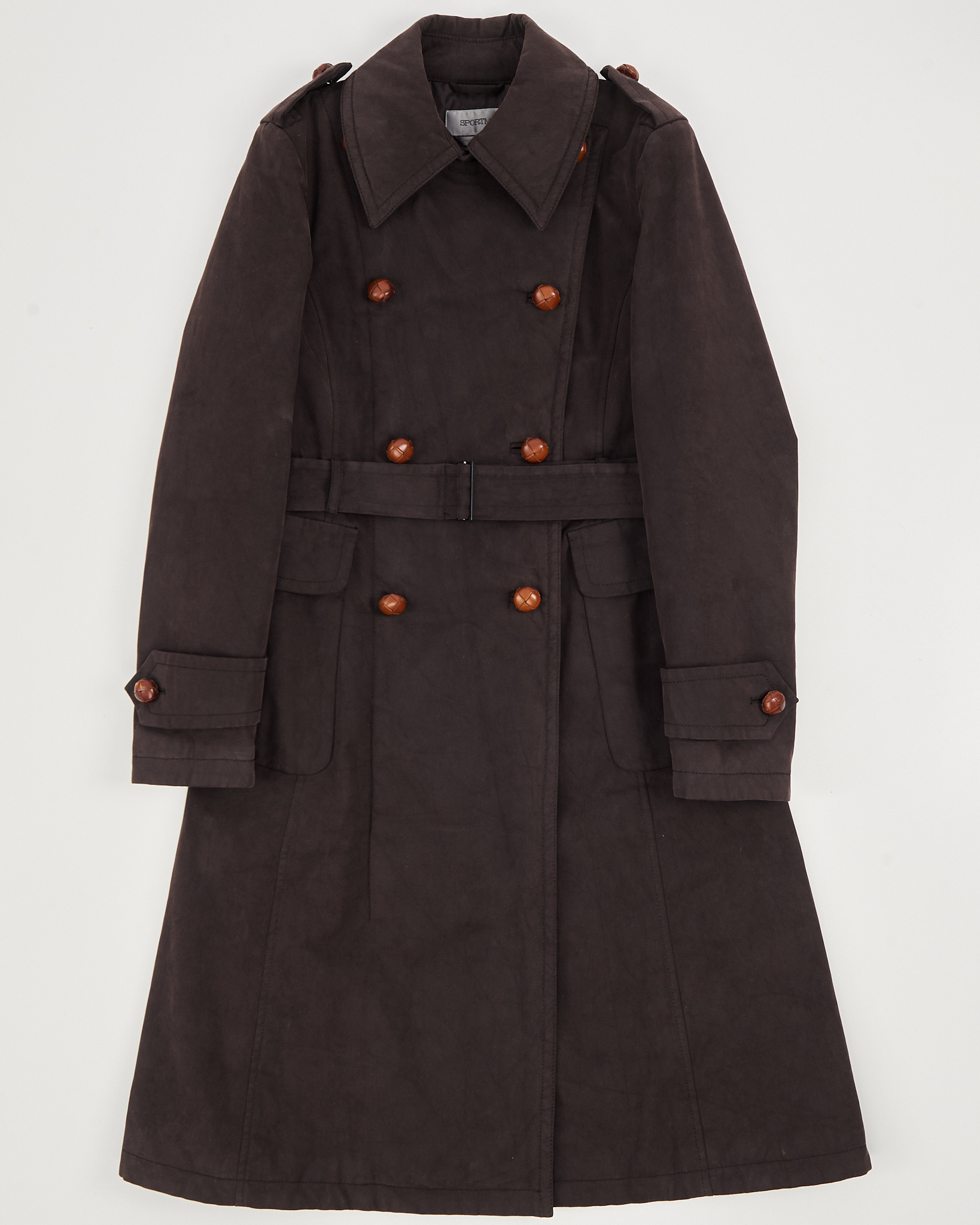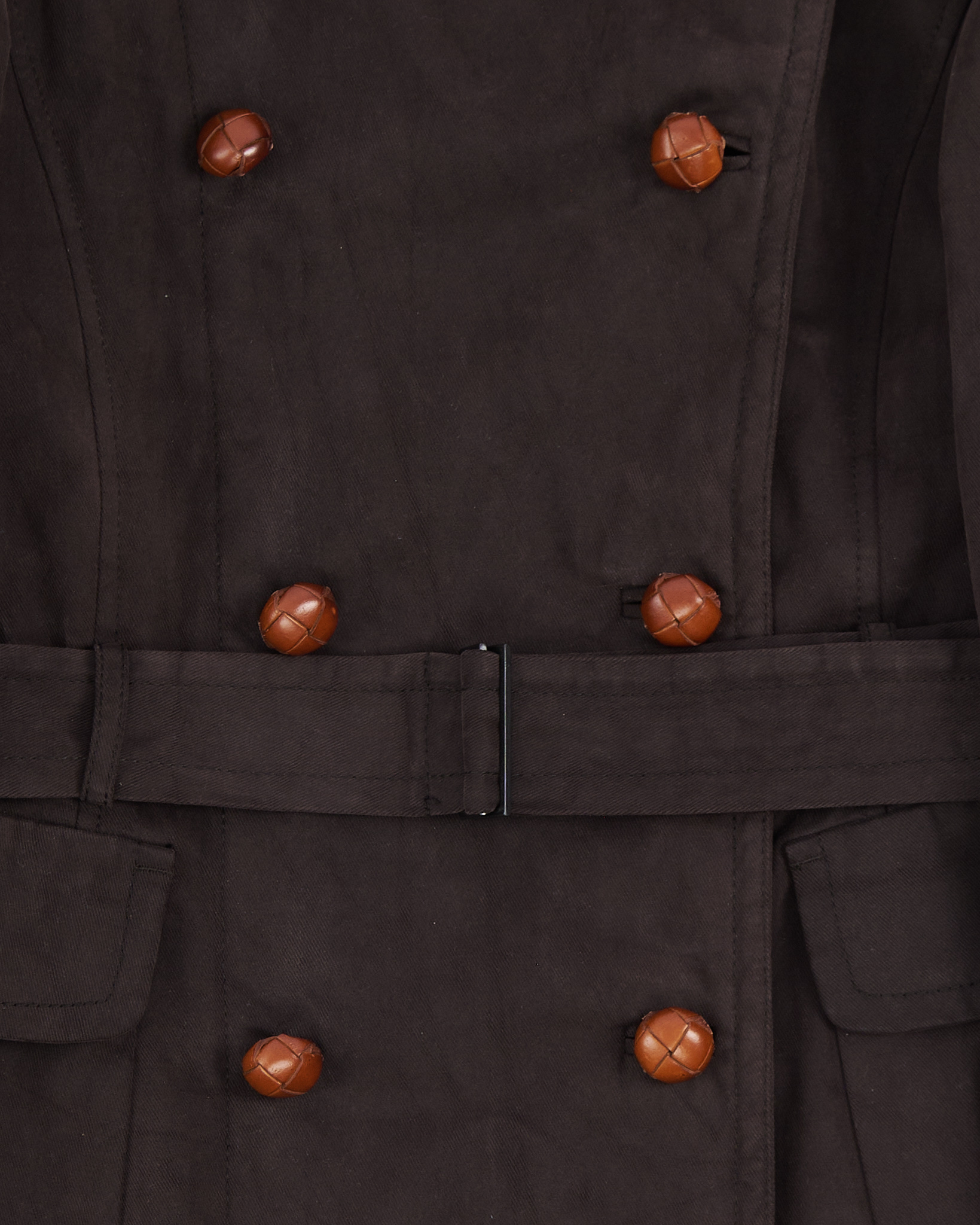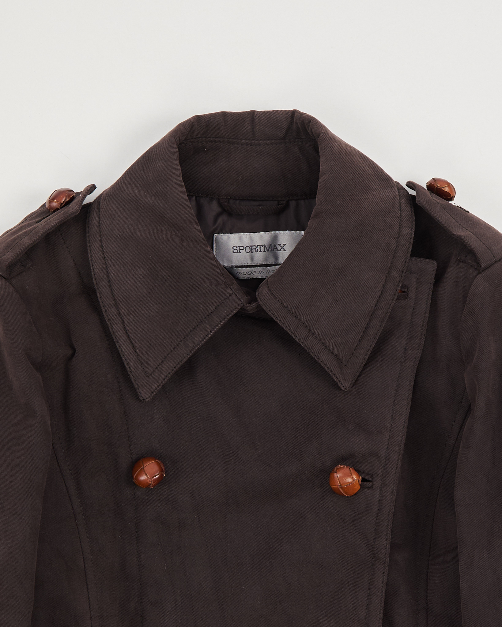 Тренч Sportmax из 100% хлопка. Двубортная модель, аккуратная посадка благодаря поясу. Фактурные пуговицы из кожи, скрытая застежка на молнию.