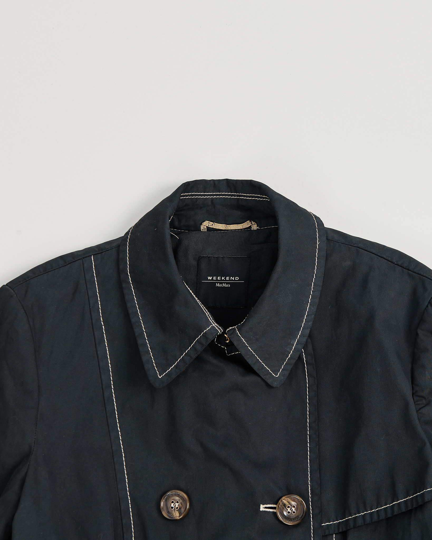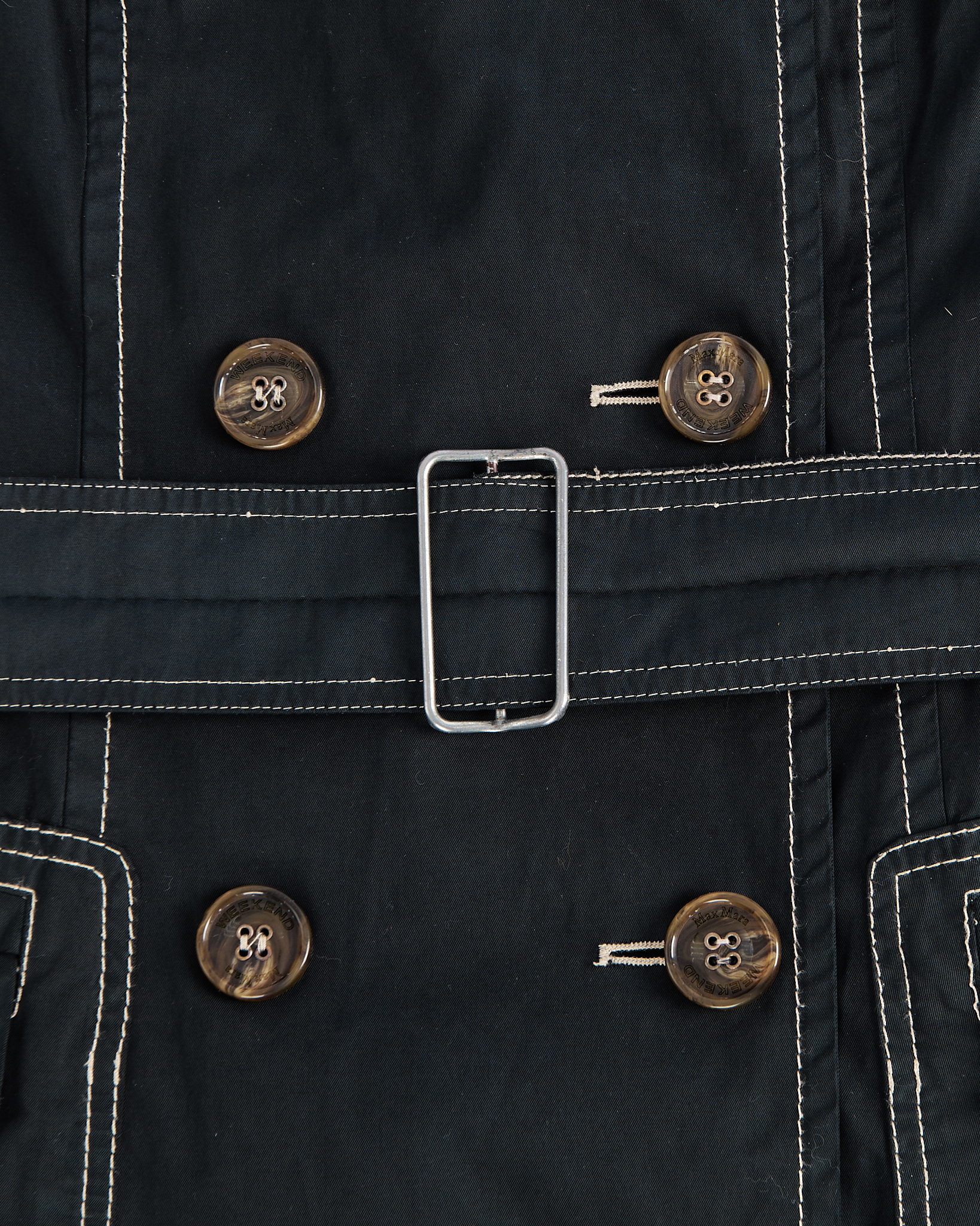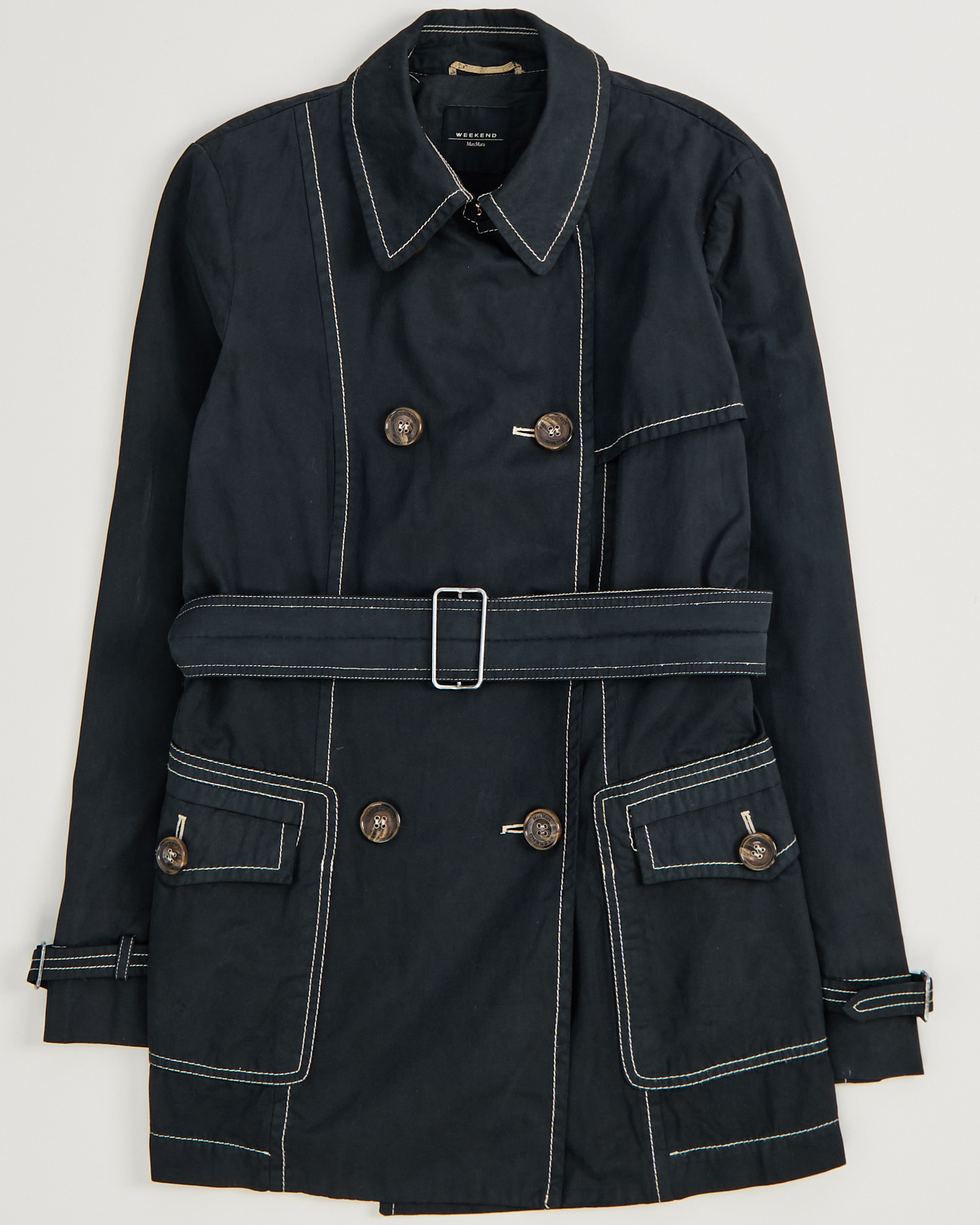 Тренч Weekend Max Mara из плотного хлопка. Двубортный крой, пояс, приталенная посадка. Контрастная строчка, крупные фирменные пуговицы.