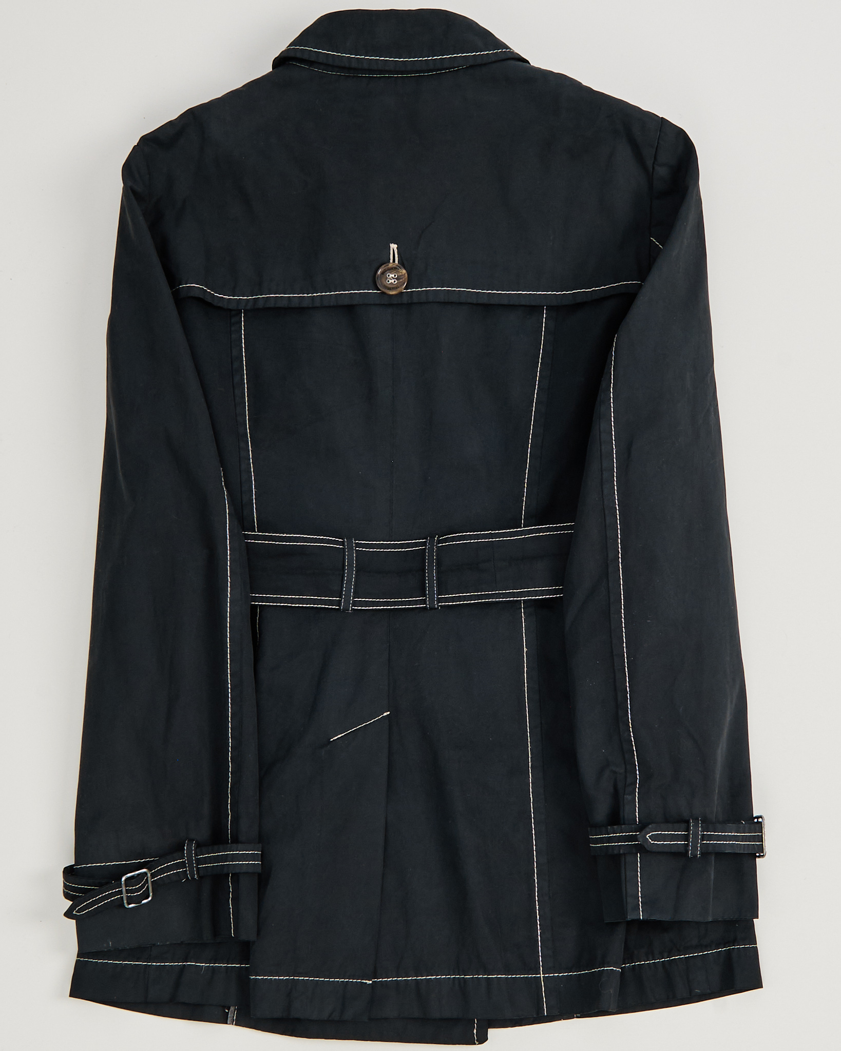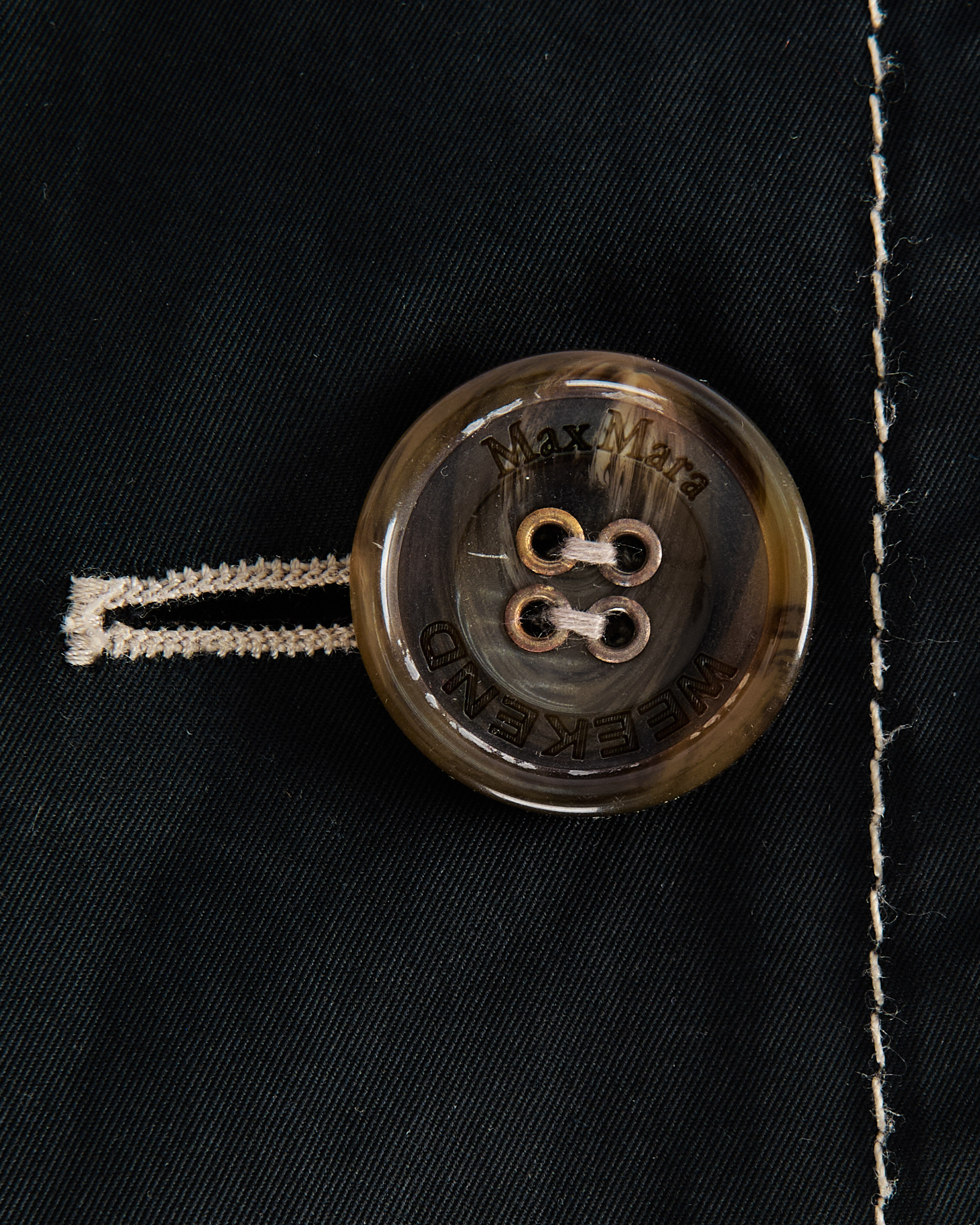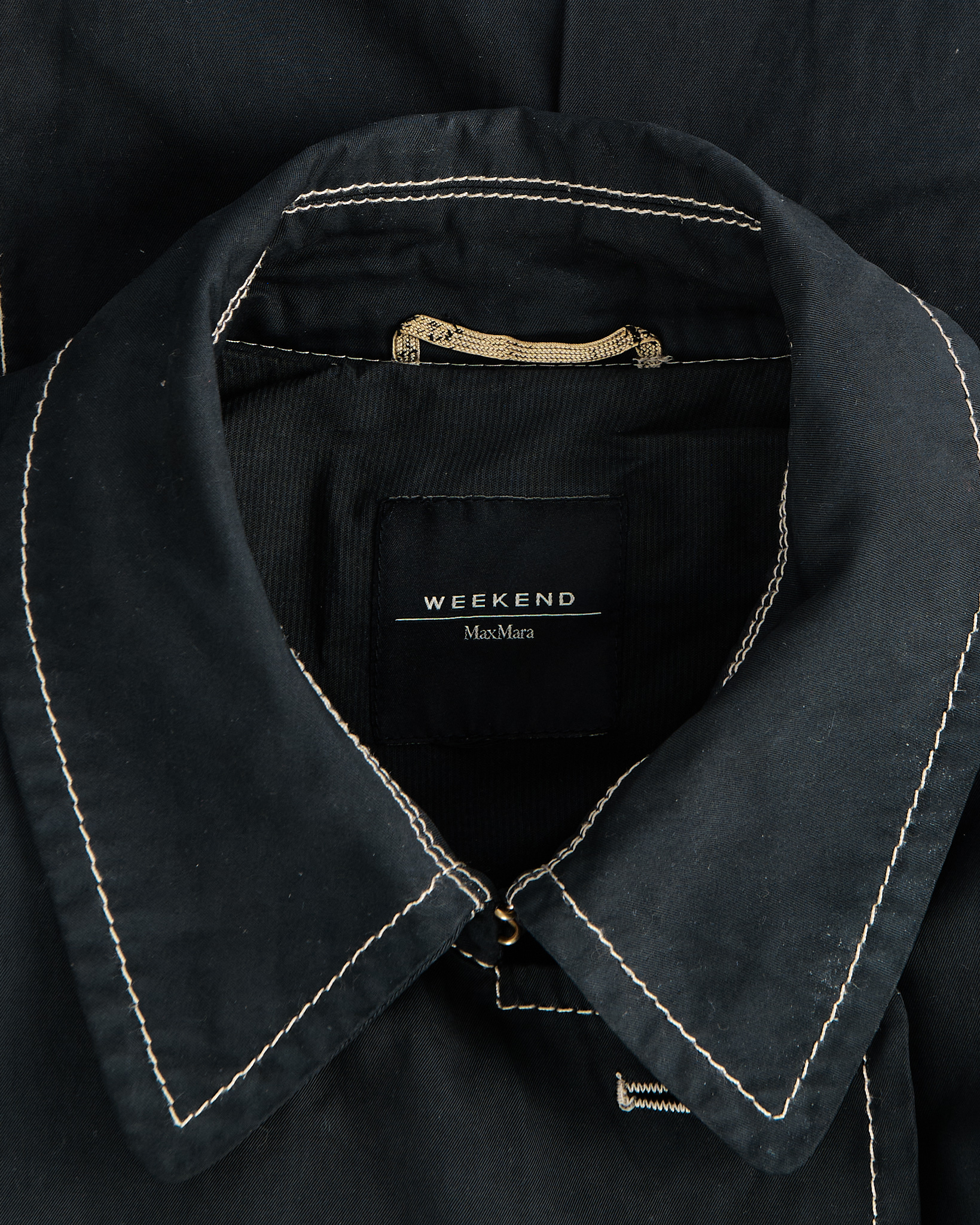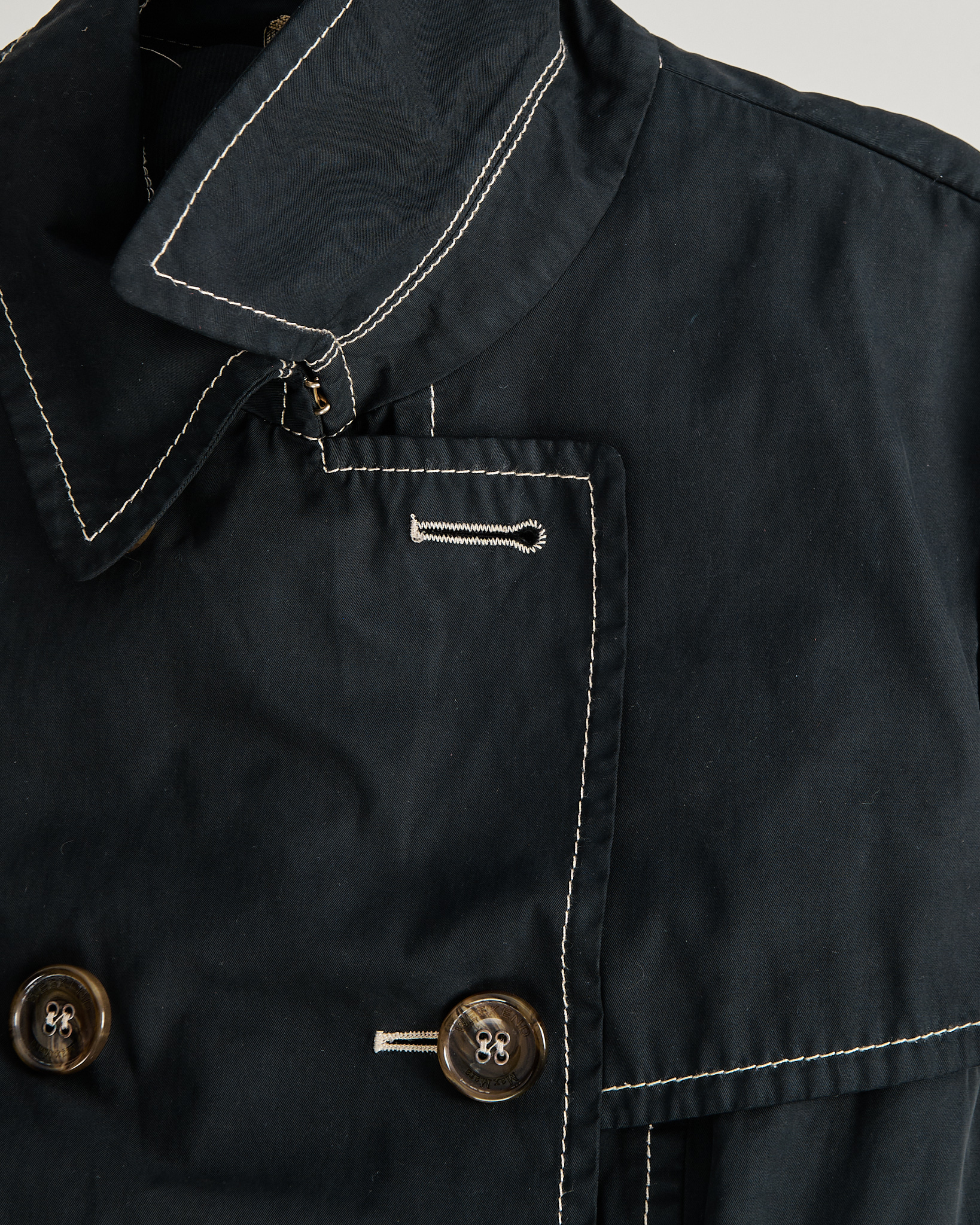 Тренч Weekend Max Mara из плотного хлопка. Двубортный крой, пояс, приталенная посадка. Контрастная строчка, крупные фирменные пуговицы.