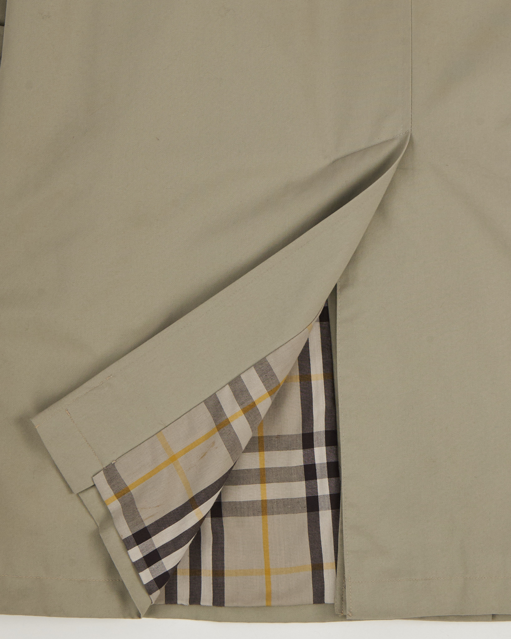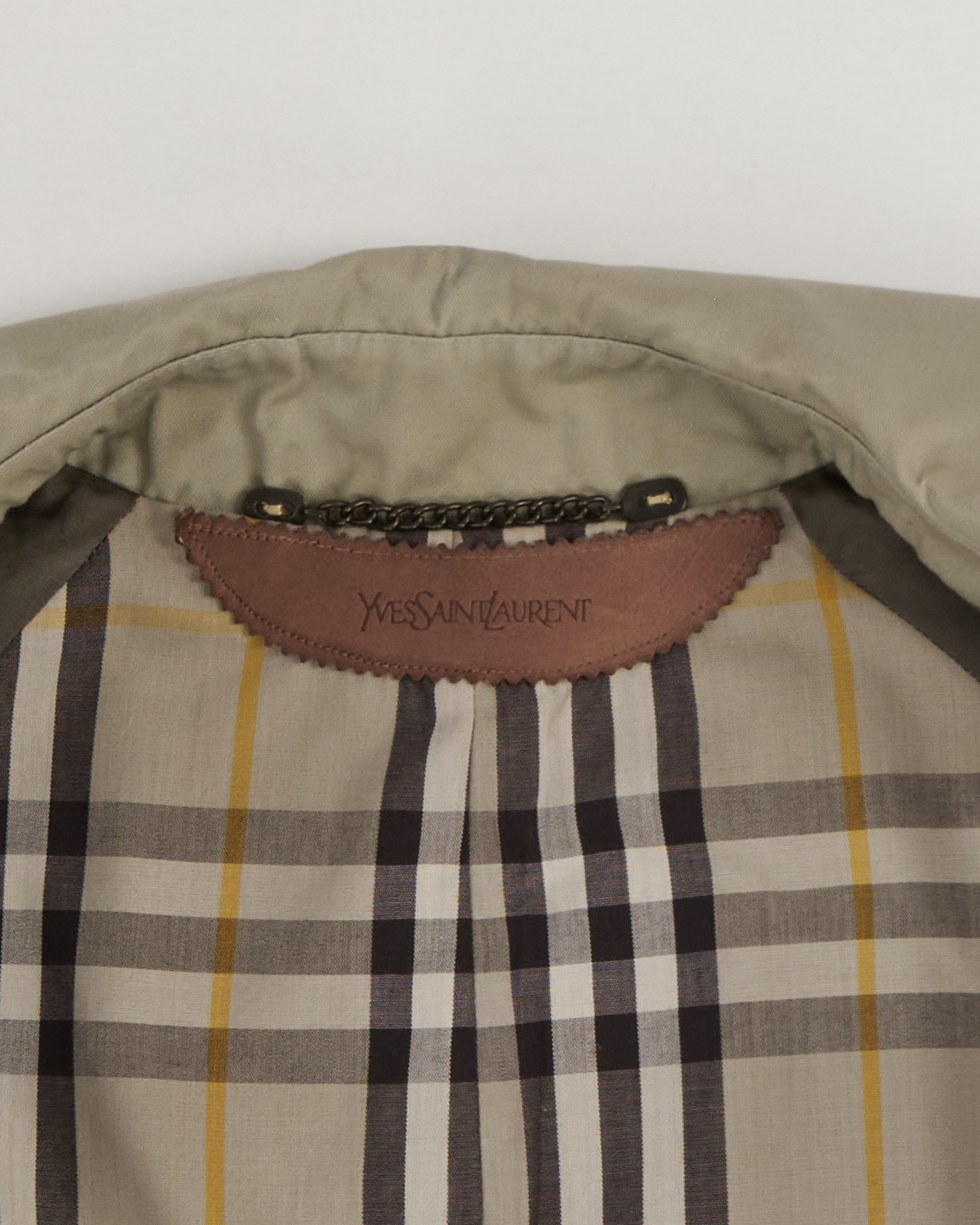 Тренч Yves Saint Laurent из плотной хлопковой ткани. Собранный силуэт, регулируемая посадка с помощью пояса. Аккуратный воротник, скрытая застёжка и кожаная деталь с логотипом бренда, клетчатая подкладка.