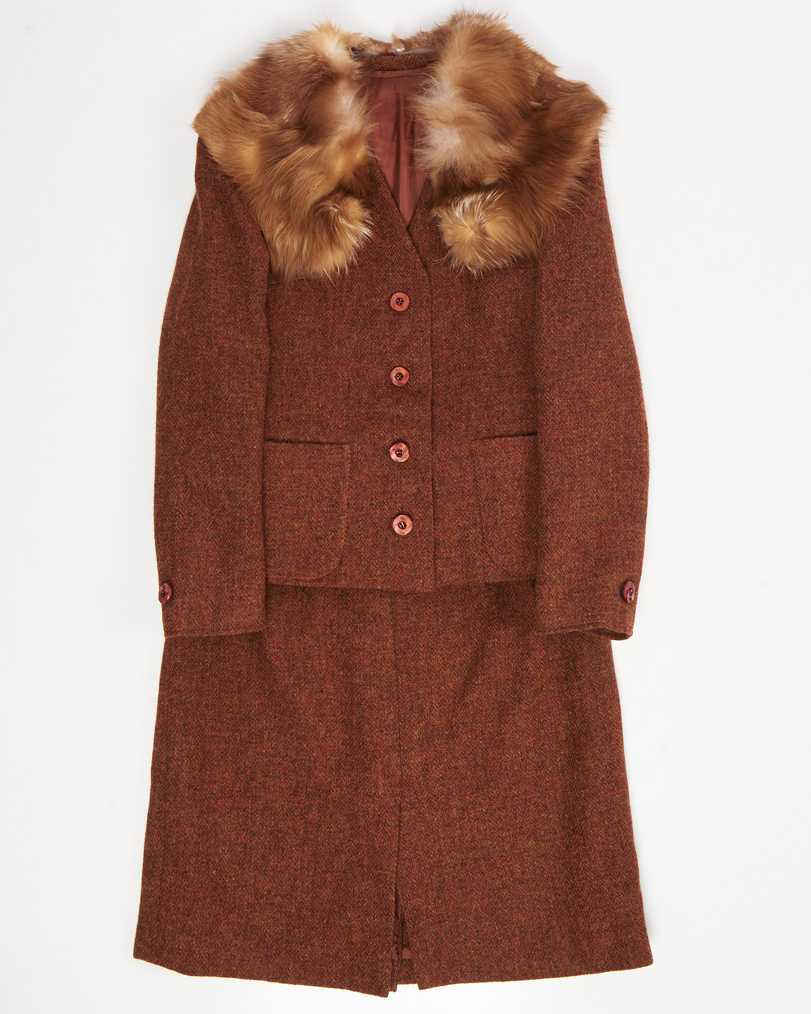 Костюм из плотной шерсти отсылает к благородной эстетике загородных прогулок. Жакет прямого кроя четко садится по плечам. Удобный съемный меховой, акцентные витые пуговицы.