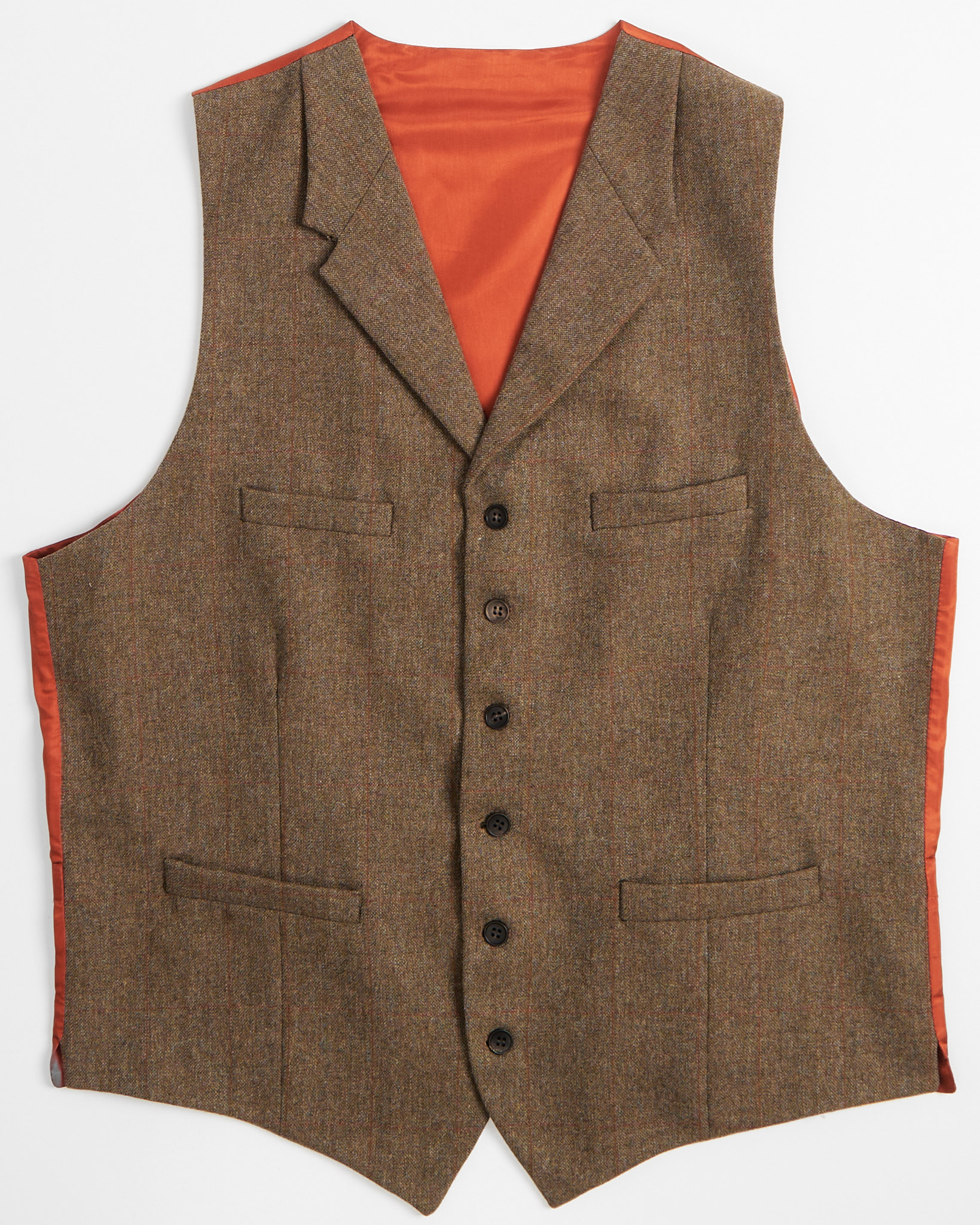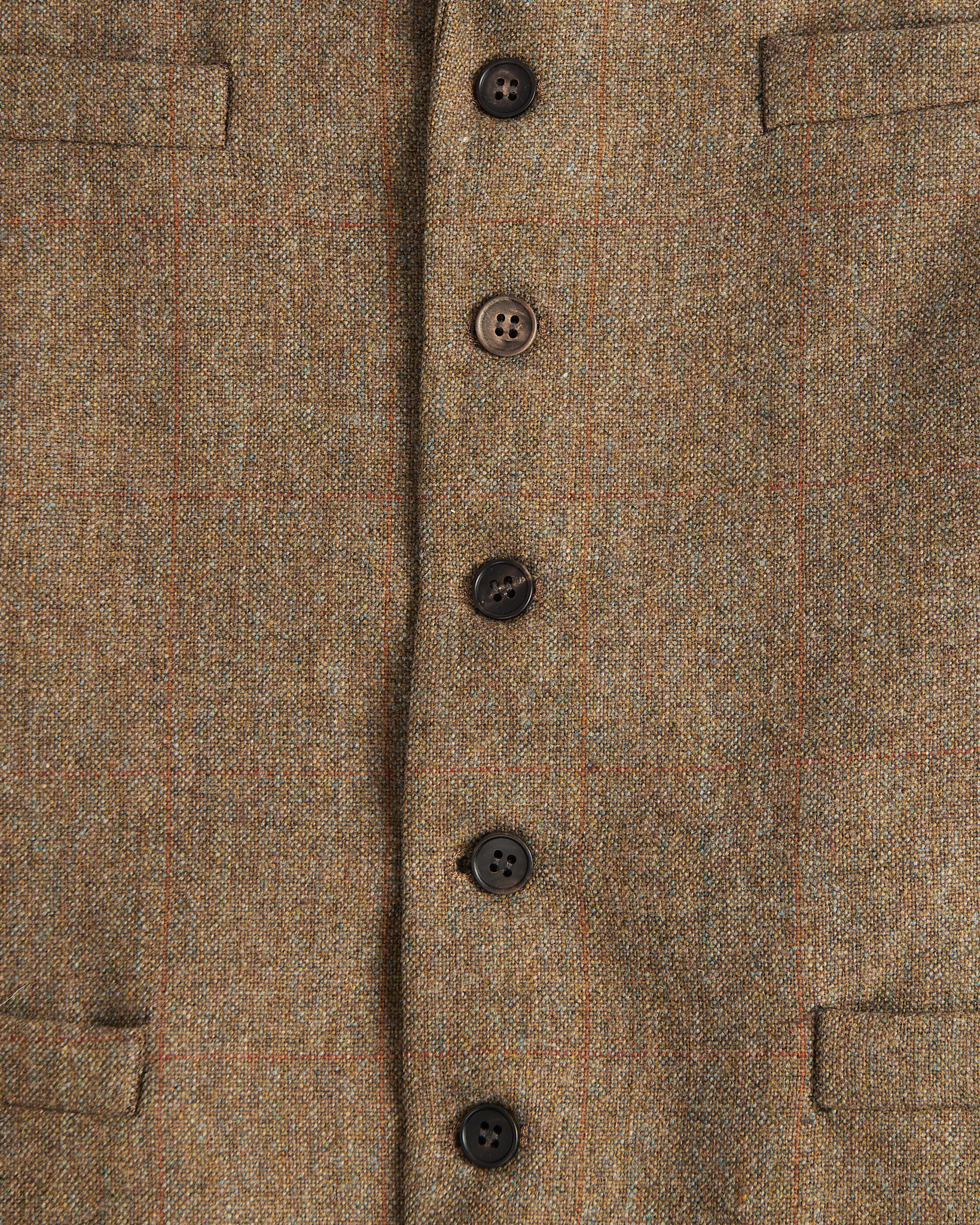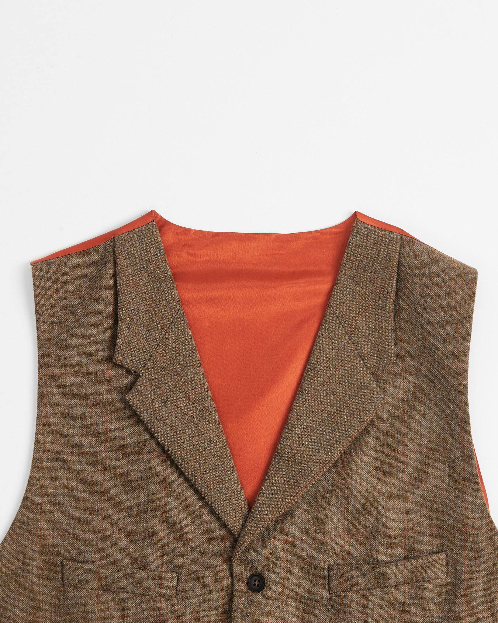 Твидовый жилет John Crocket из 100% шерсти. Акцентные лацканы и сложный оттенок клетки, качественная фурнитура и яркая подкладка.
