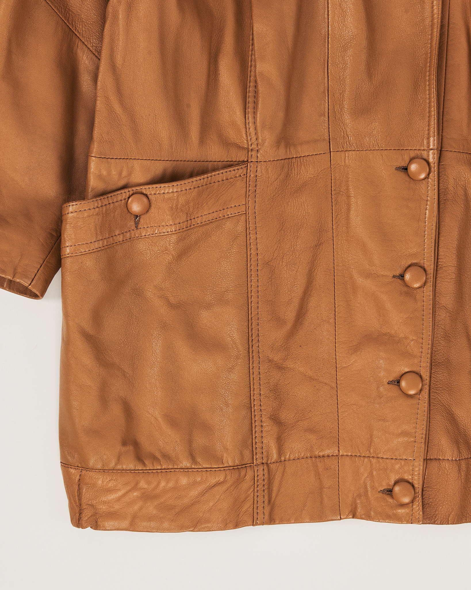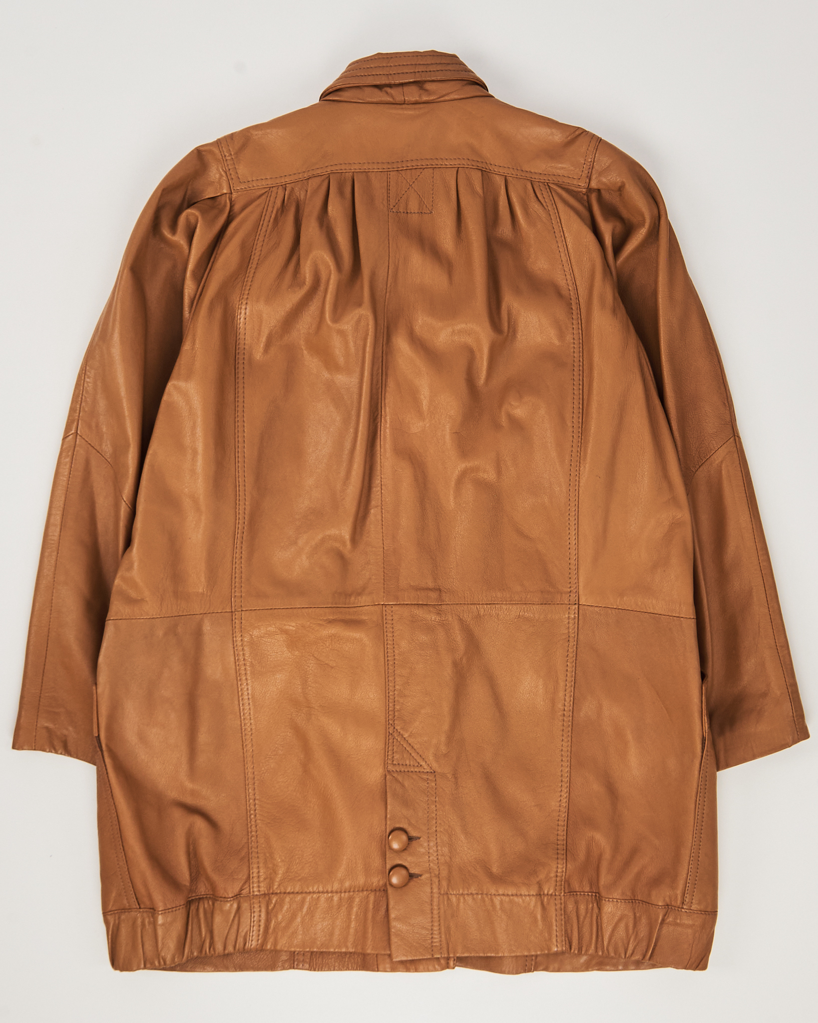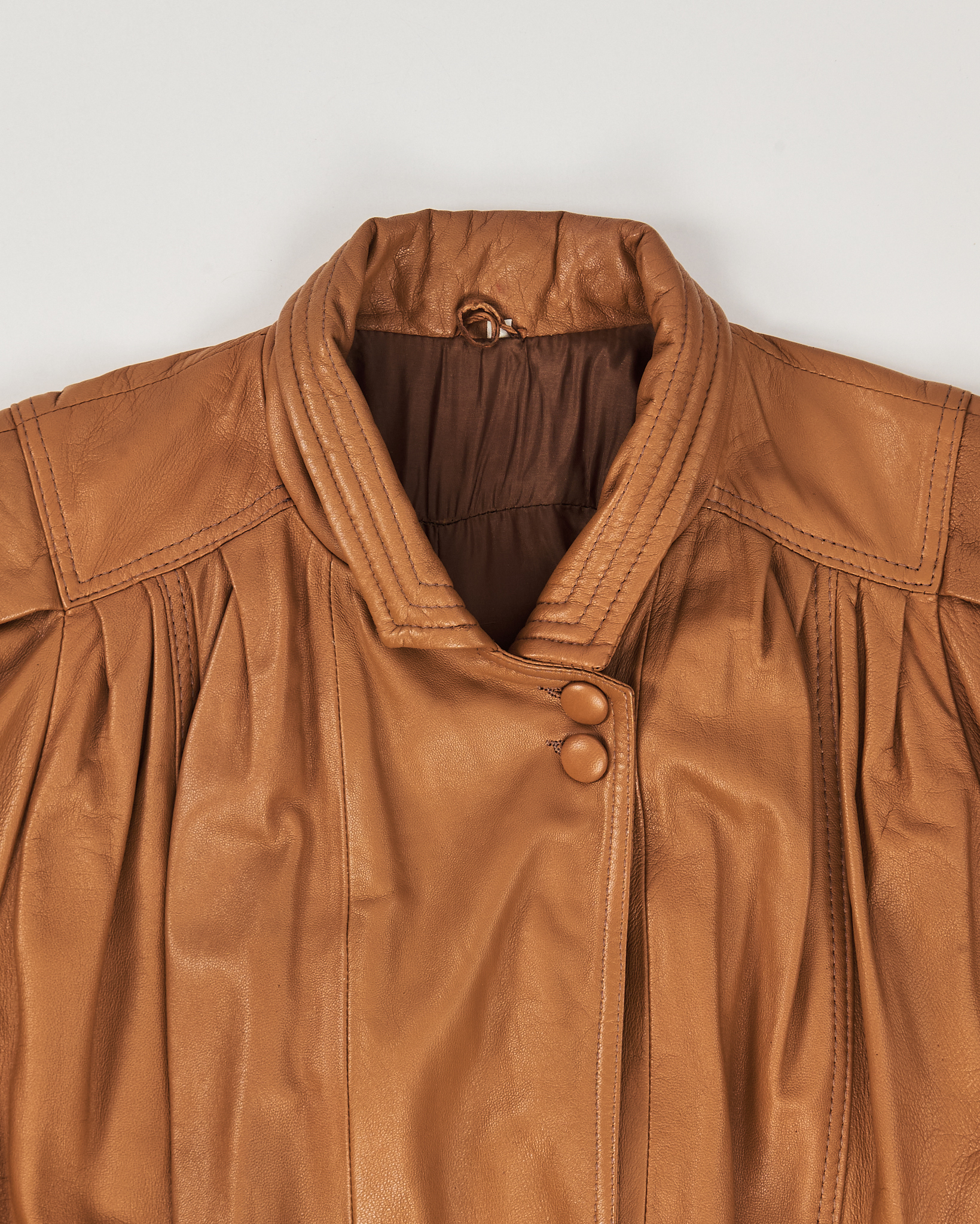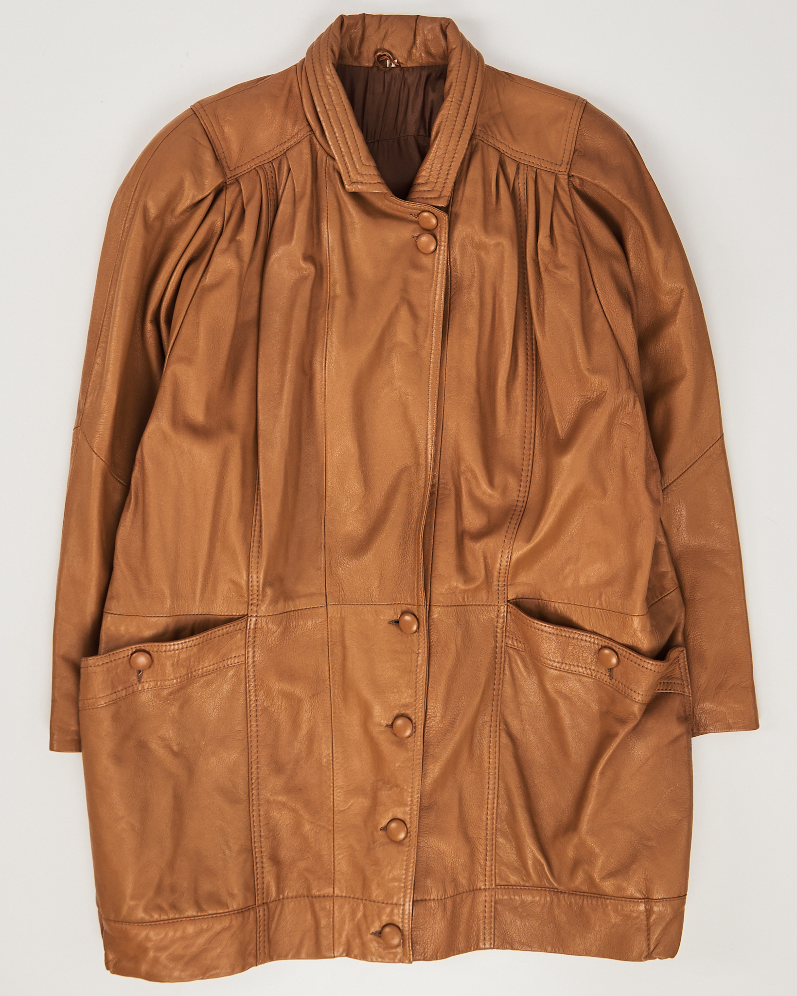 Куртка из мягкой натуральной кожи теплого карамельного оттенка. Прямой силуэт, свободная посадка. Застежка на пуговицы. Два боковых кармана. Модель с акцентом на складках в верхней области