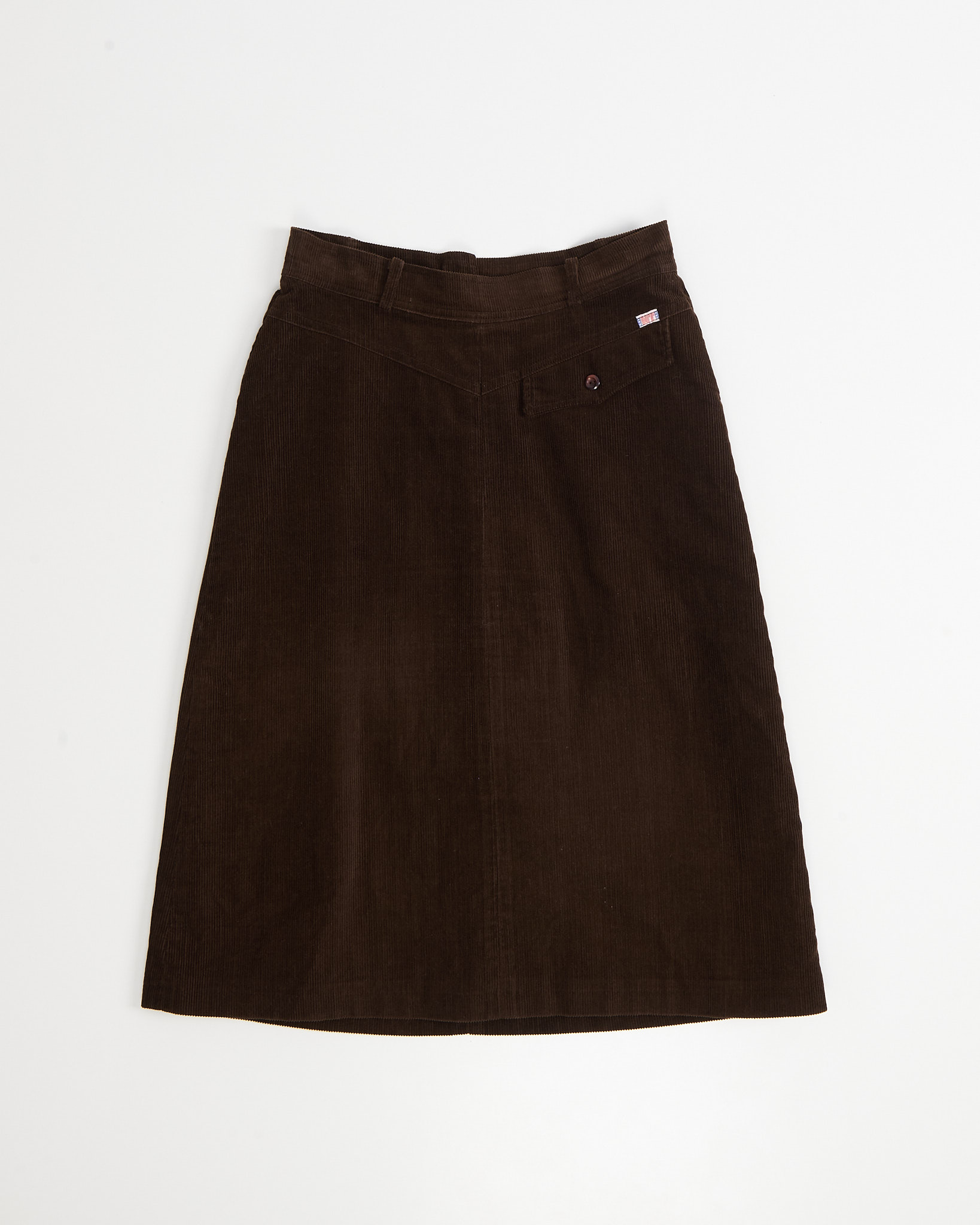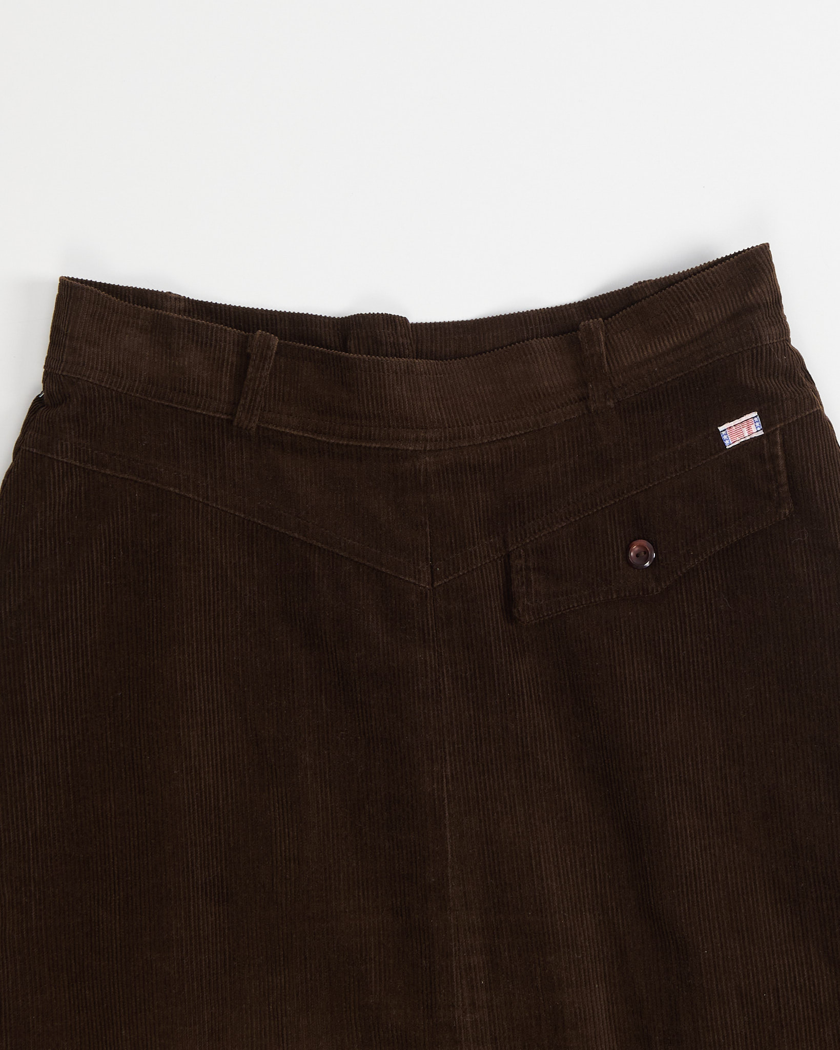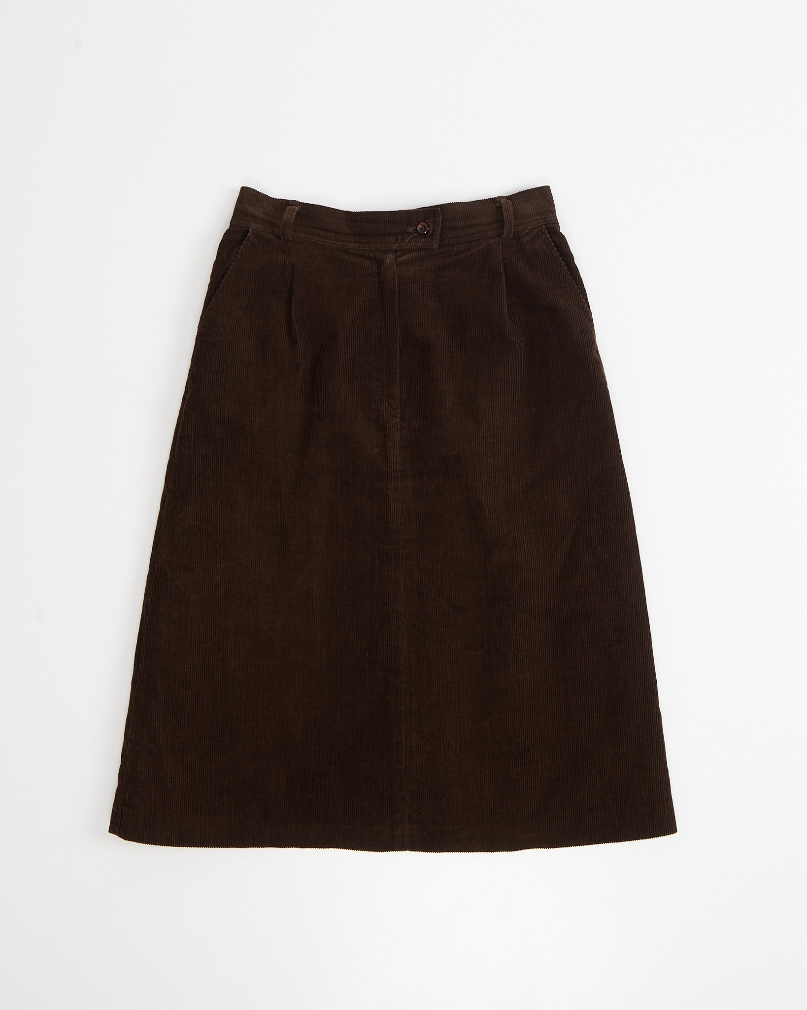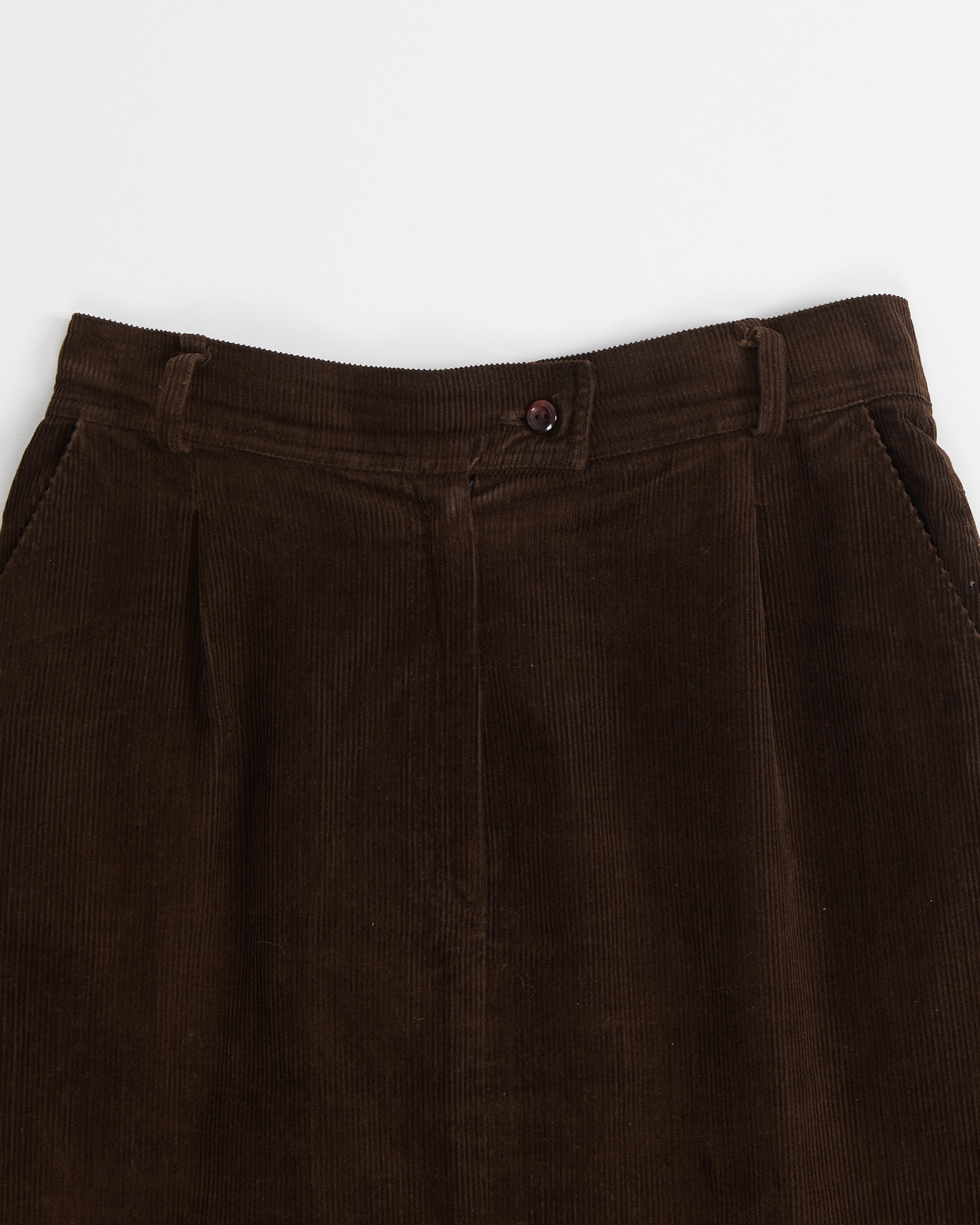 Юбка выполнена из плотного вельвета глубокого шоколадного оттенка. Материал мягкий на ощупь, тактильно приятный с выраженным рубчиком. Посадка высокая, силуэт - трапеция.