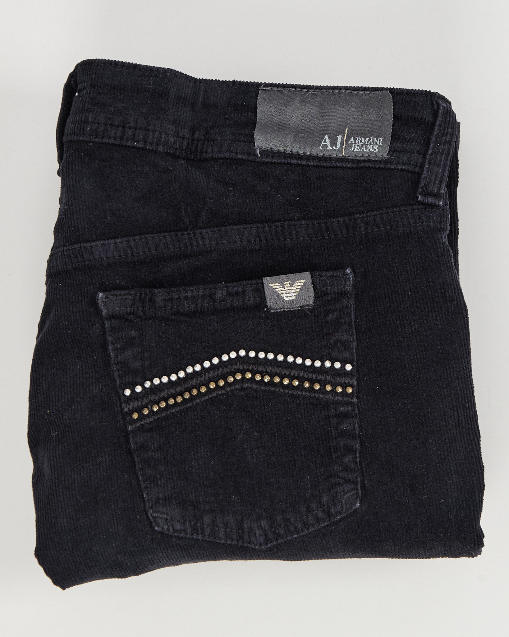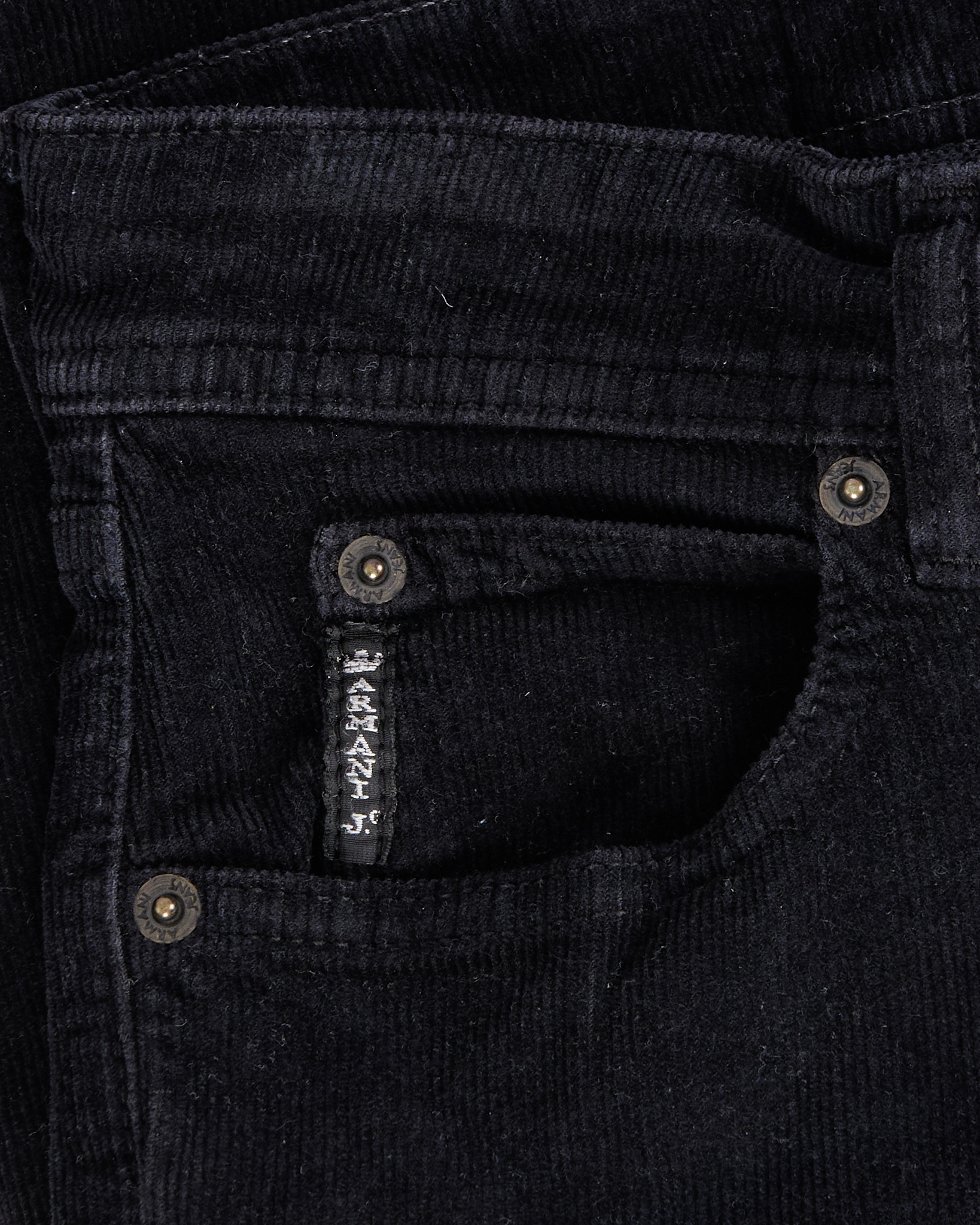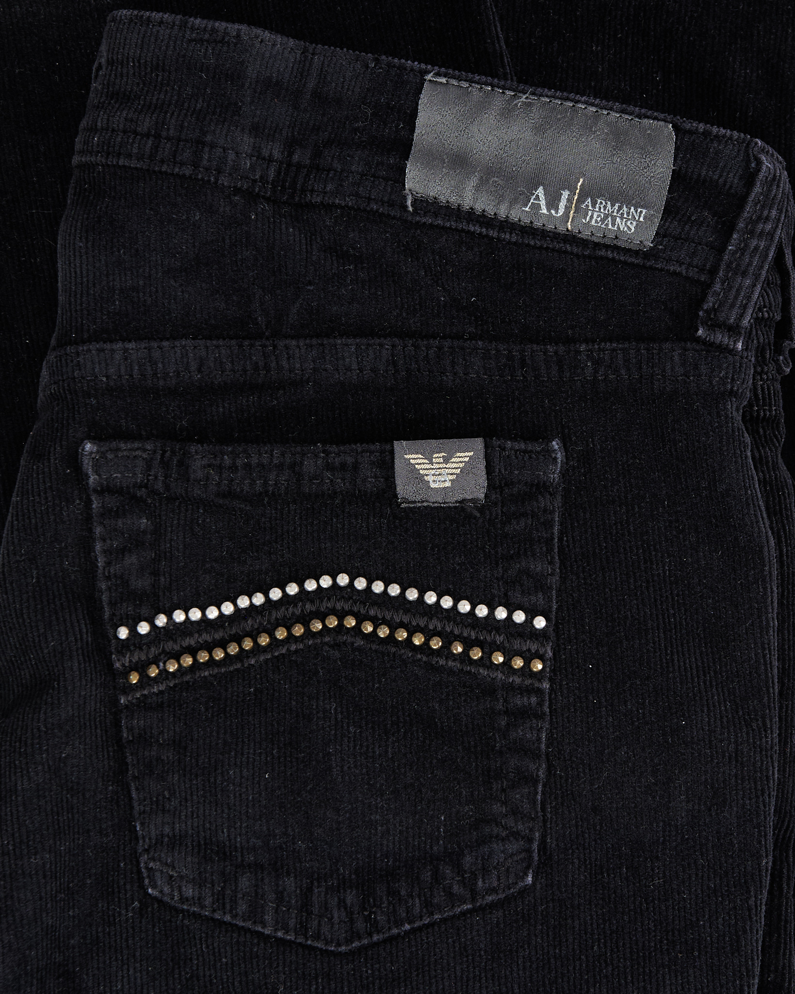 Брюки Armani Jeans из 99% хлопка глубокого чёрного цвета. Материал мягкий и бархатистый на ощупь, с фактурным рубчиком. Прямая посадка, классическая модель с пятью карманами. Декор на заднем кармане из металлических страз.