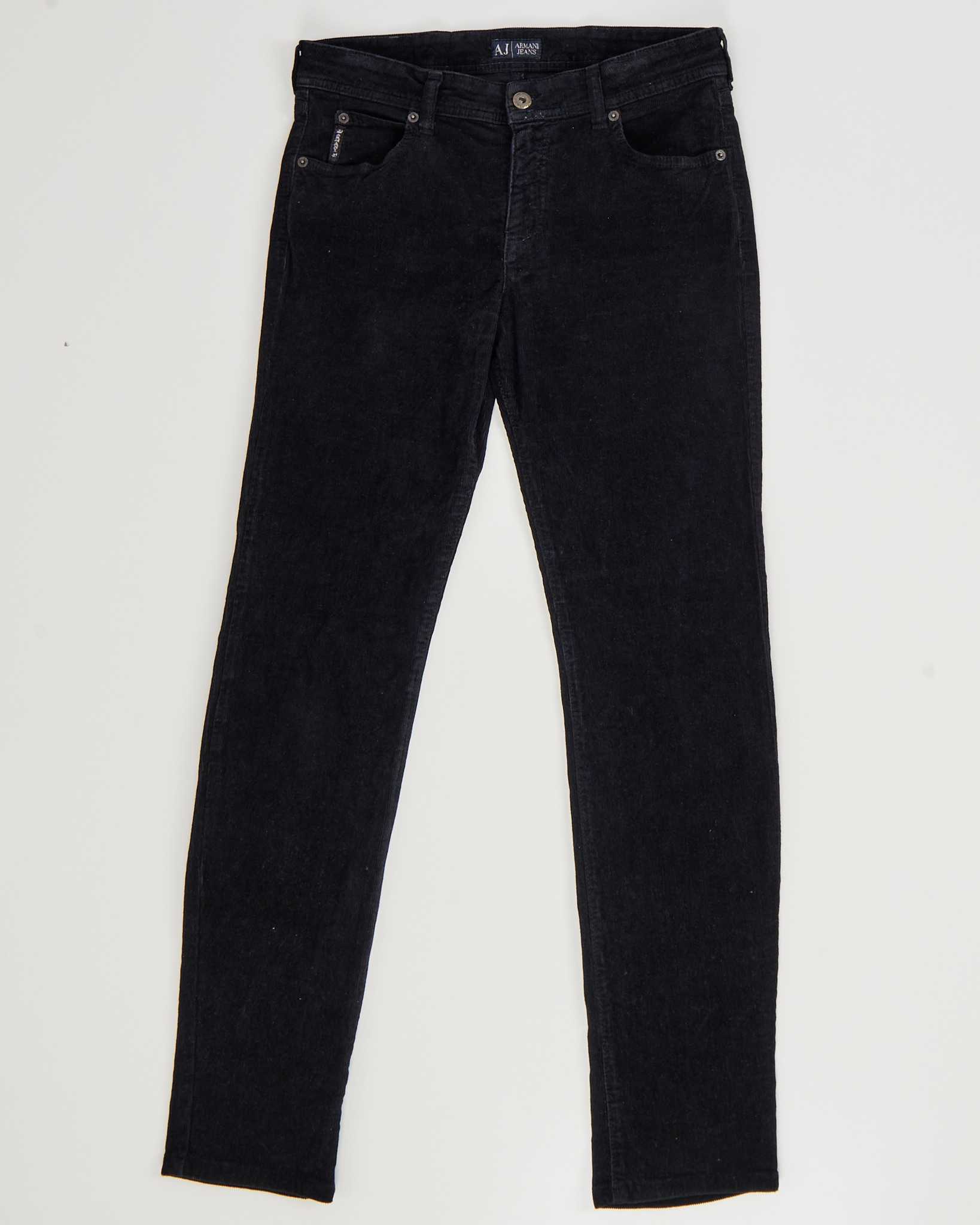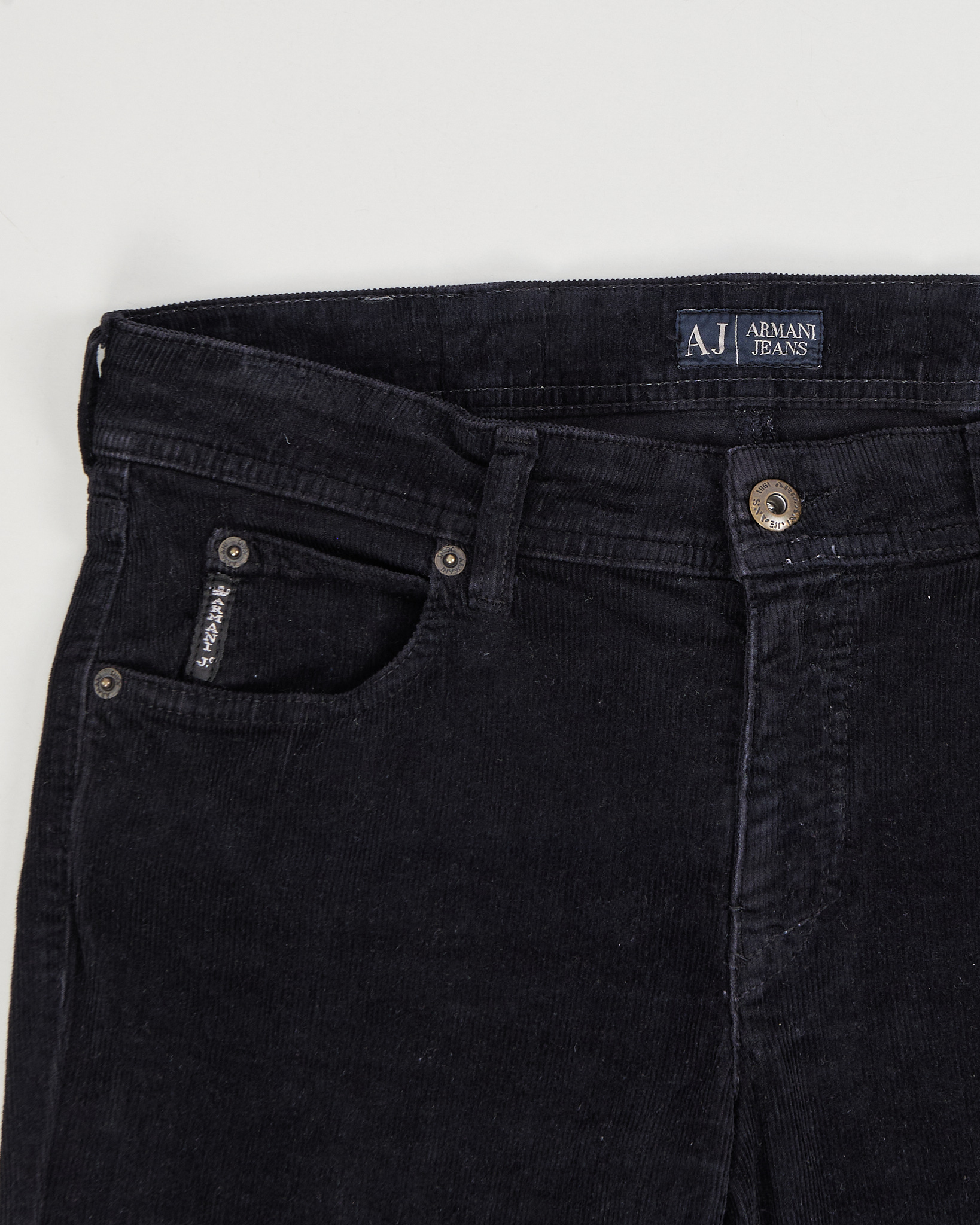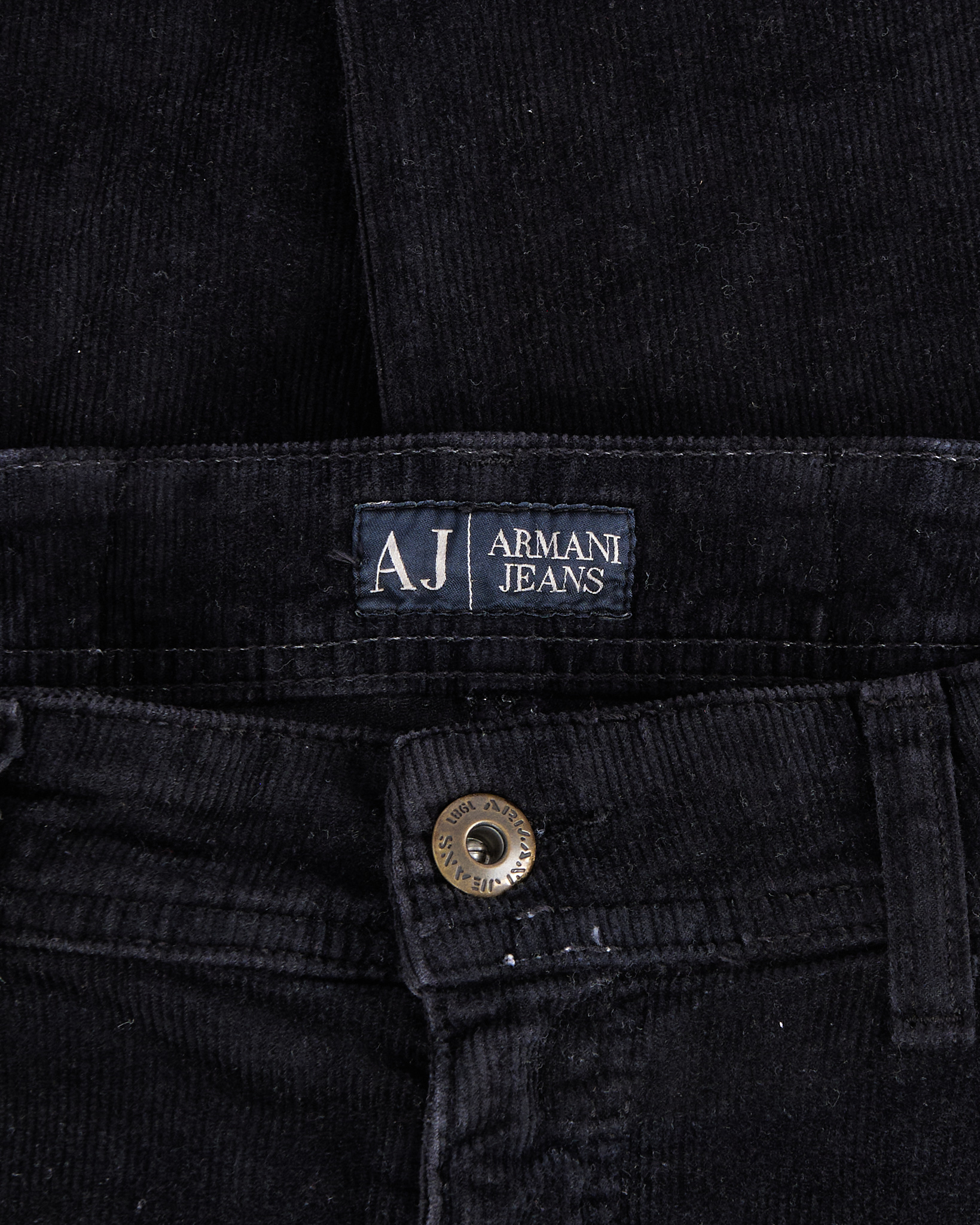 Брюки Armani Jeans из 99% хлопка глубокого чёрного цвета. Материал мягкий и бархатистый на ощупь, с фактурным рубчиком. Прямая посадка, классическая модель с пятью карманами. Декор на заднем кармане из металлических страз.