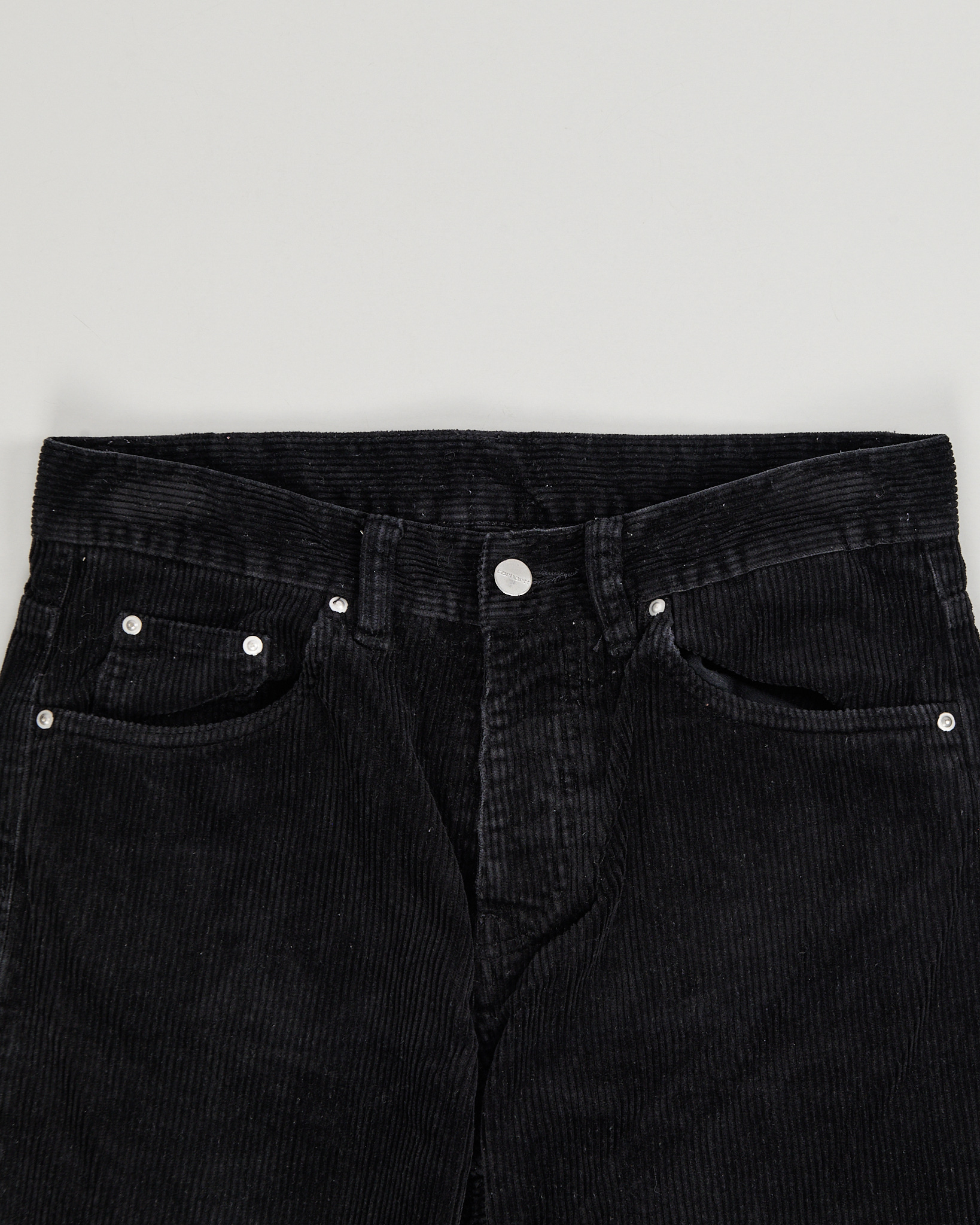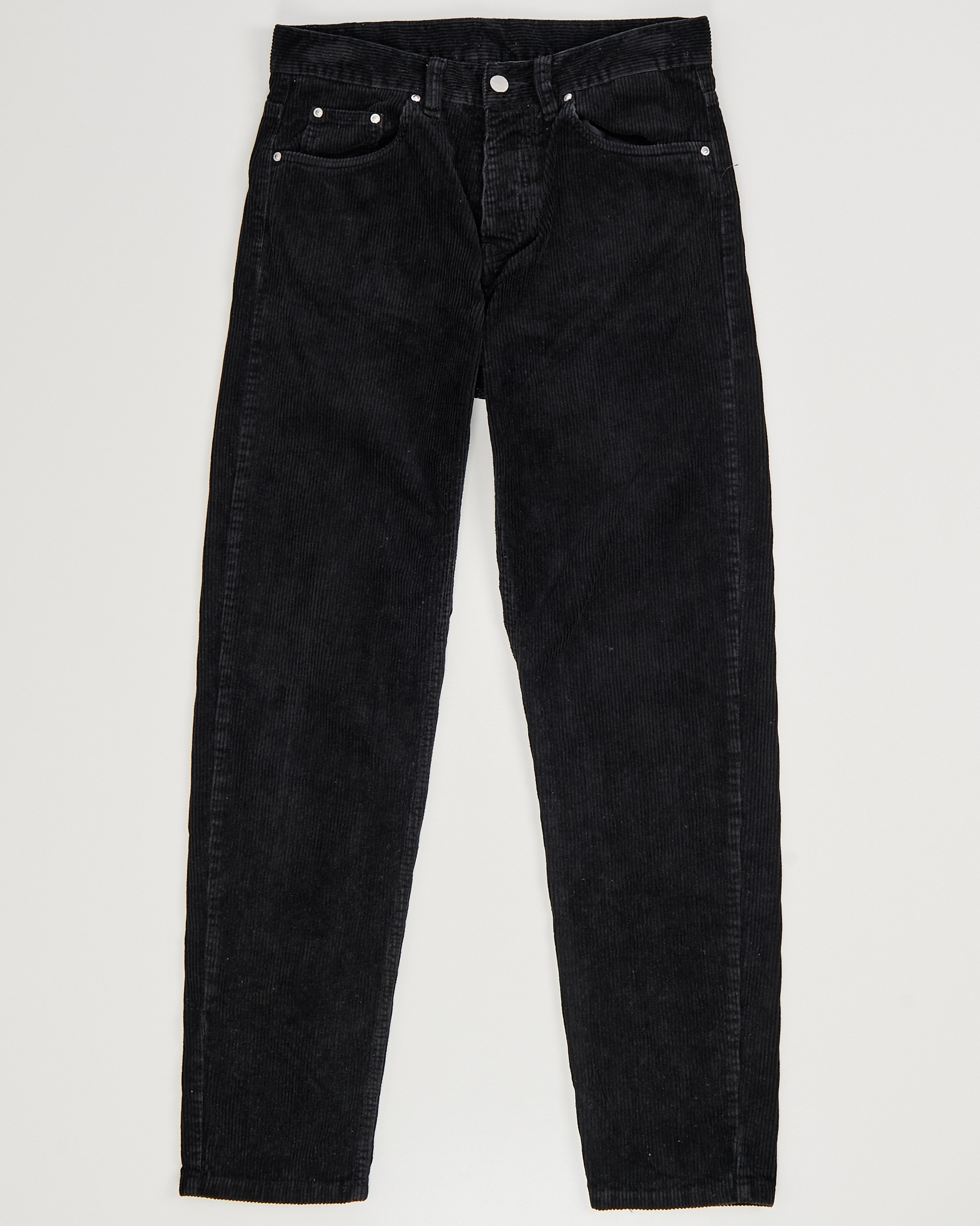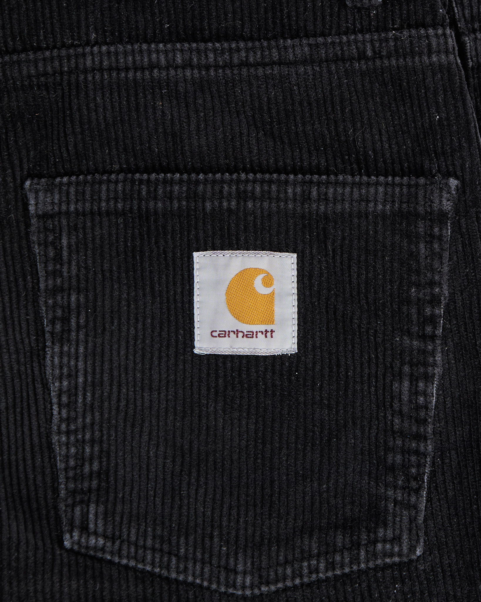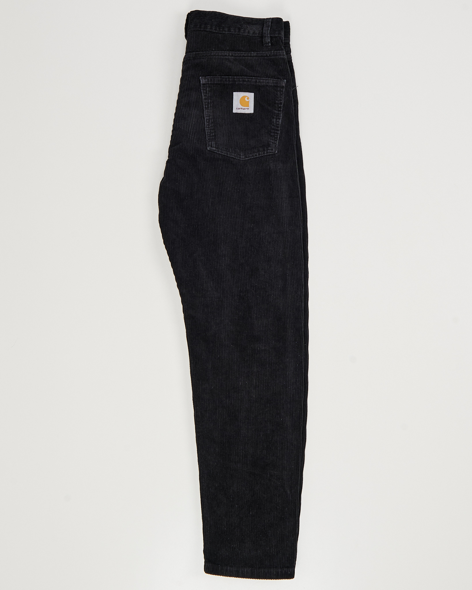 Брюки Carhartt из плотного хлопкового вельвета чёрного цвета. Материал мягкий на ощупь, с фактурным рубчиком. Посадка прямая, силуэт выглядит собранно и уверенно. Классическая модель с пятью карманами, фирменный патч Carhartt на заднем кармане.