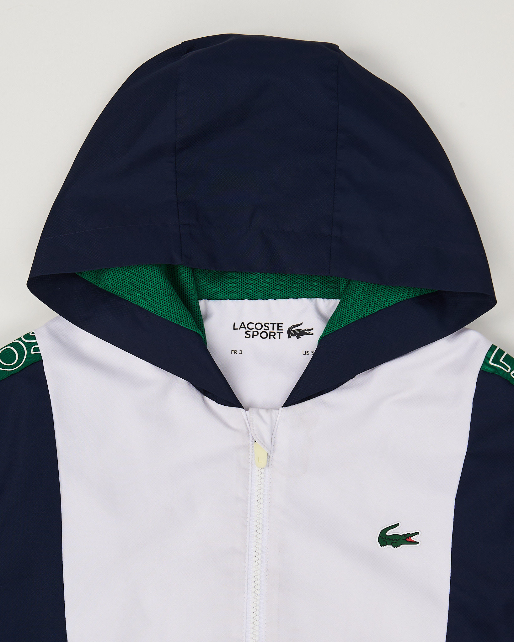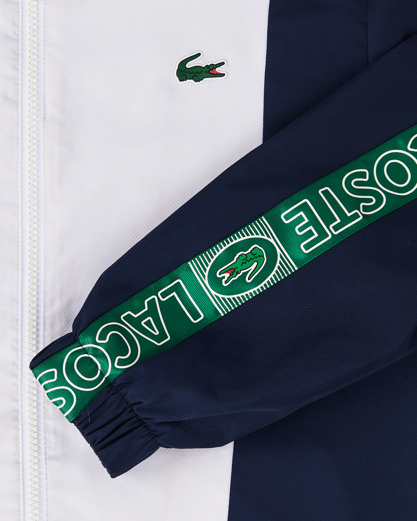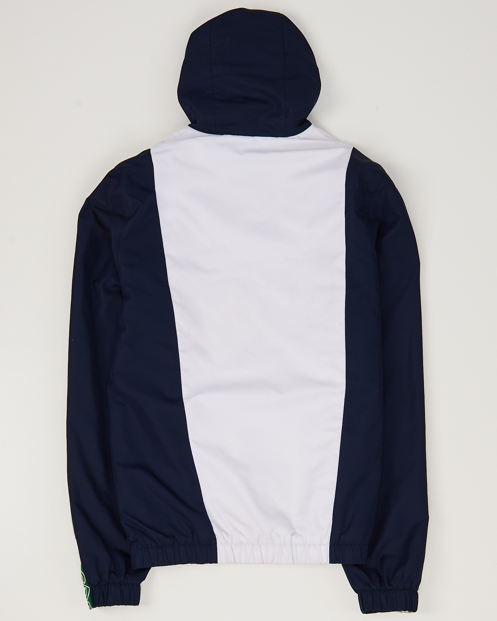 Ветровка Lacoste в контрастных цветах - белый и темно-синий. Вставки и фирменные лампасы с логотипом. Свободный крой. Капюшон, два функциональных боковых кармана