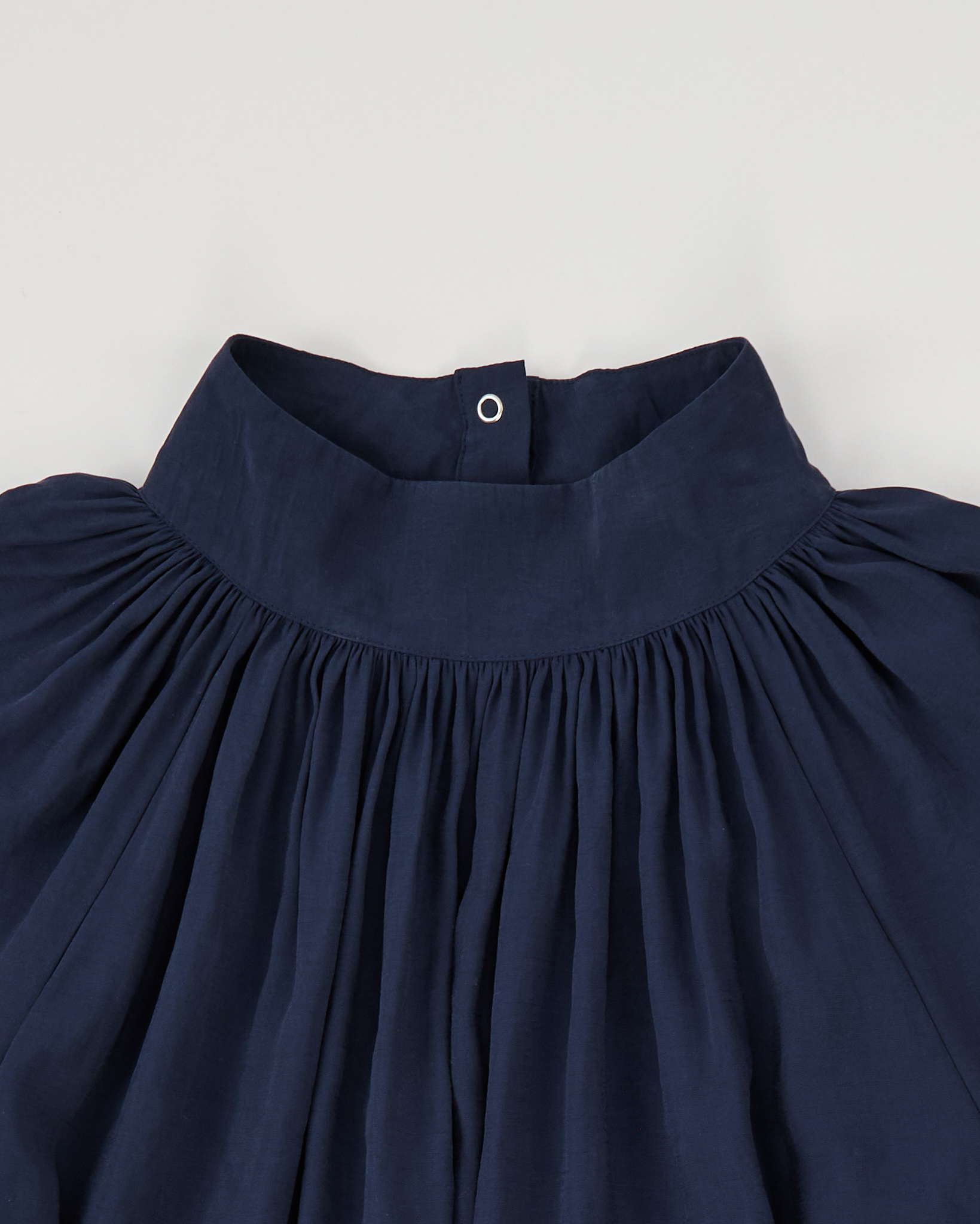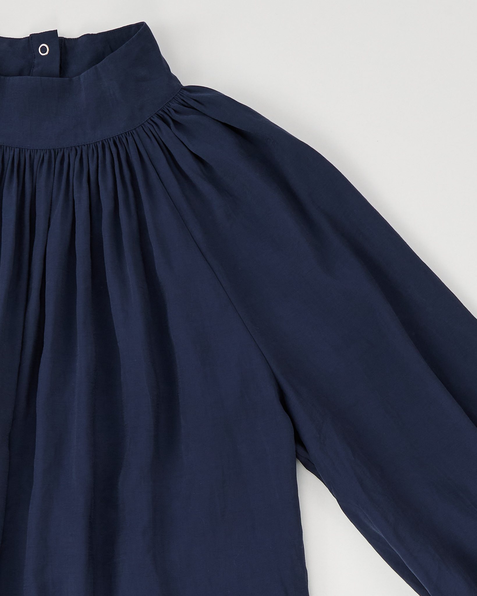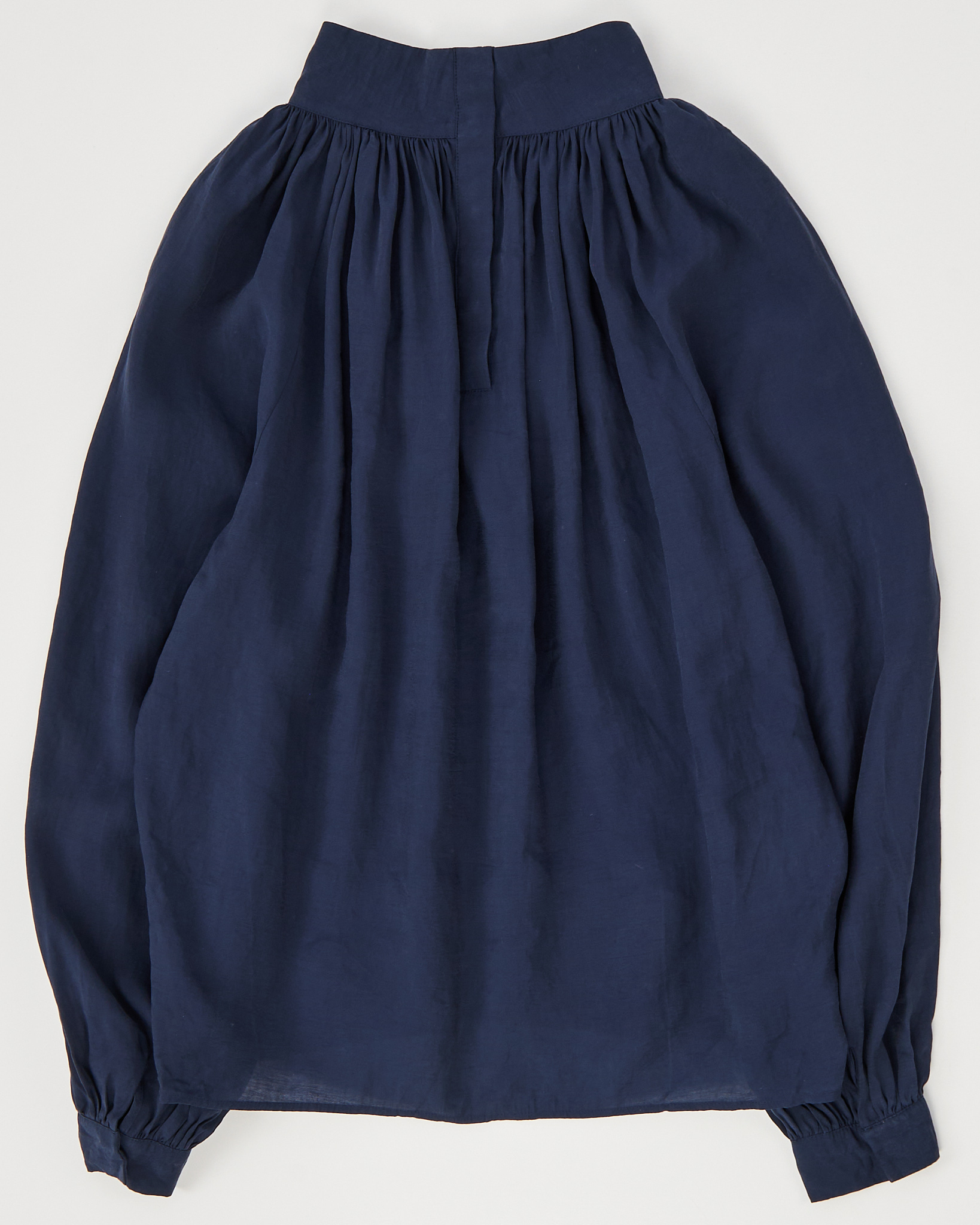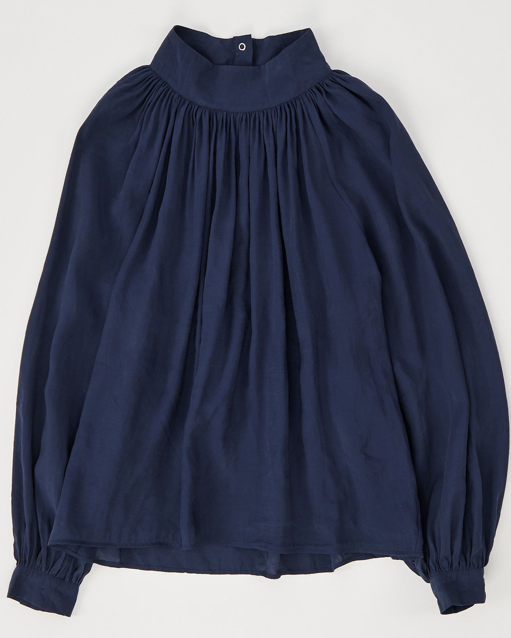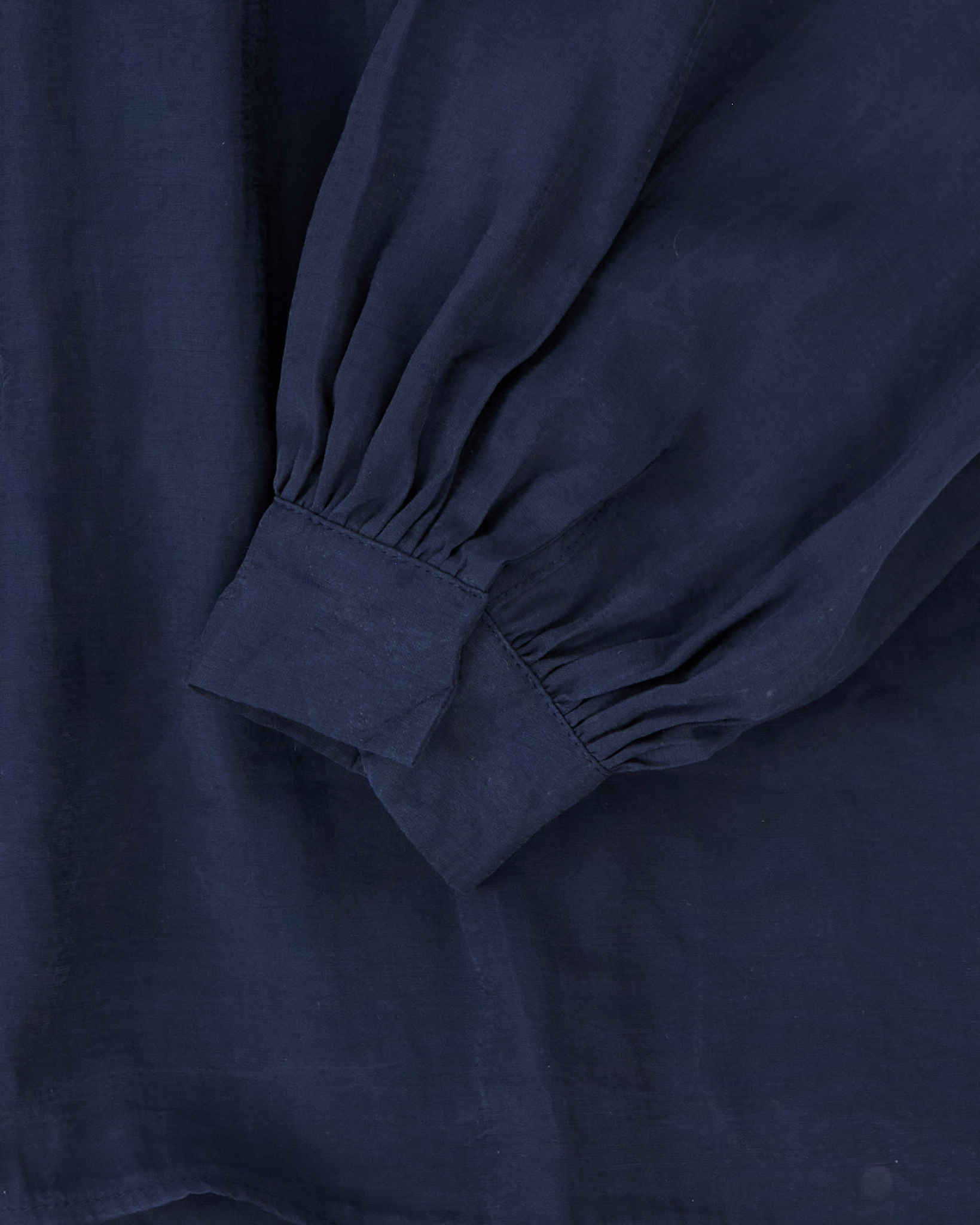 Блуза с объёмными рукавами в глубокем синем оттенке. Свободная посадка, сборка у горловины и манжетах.