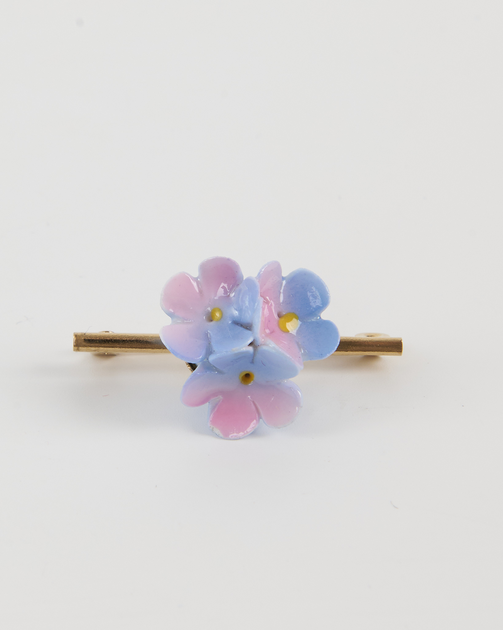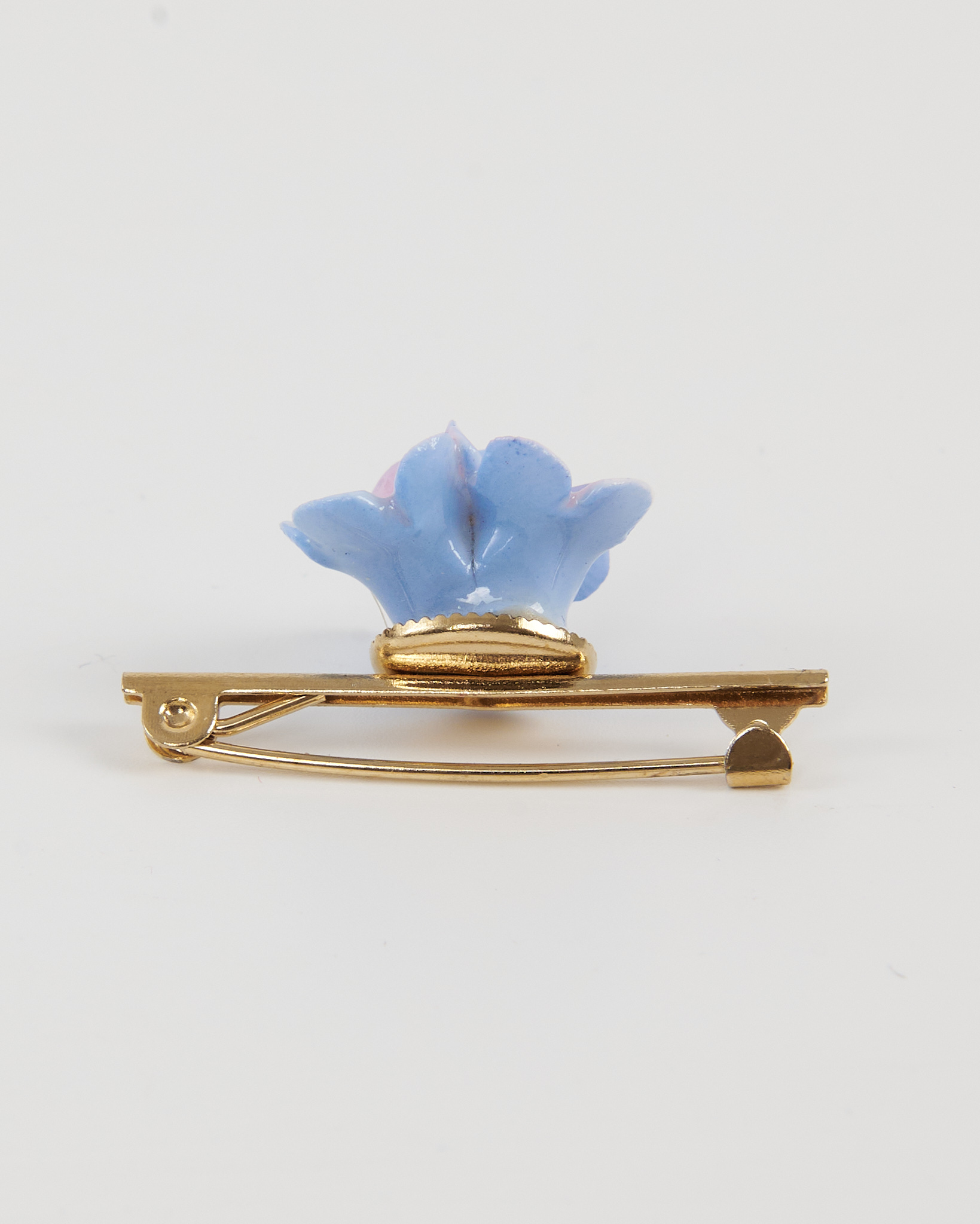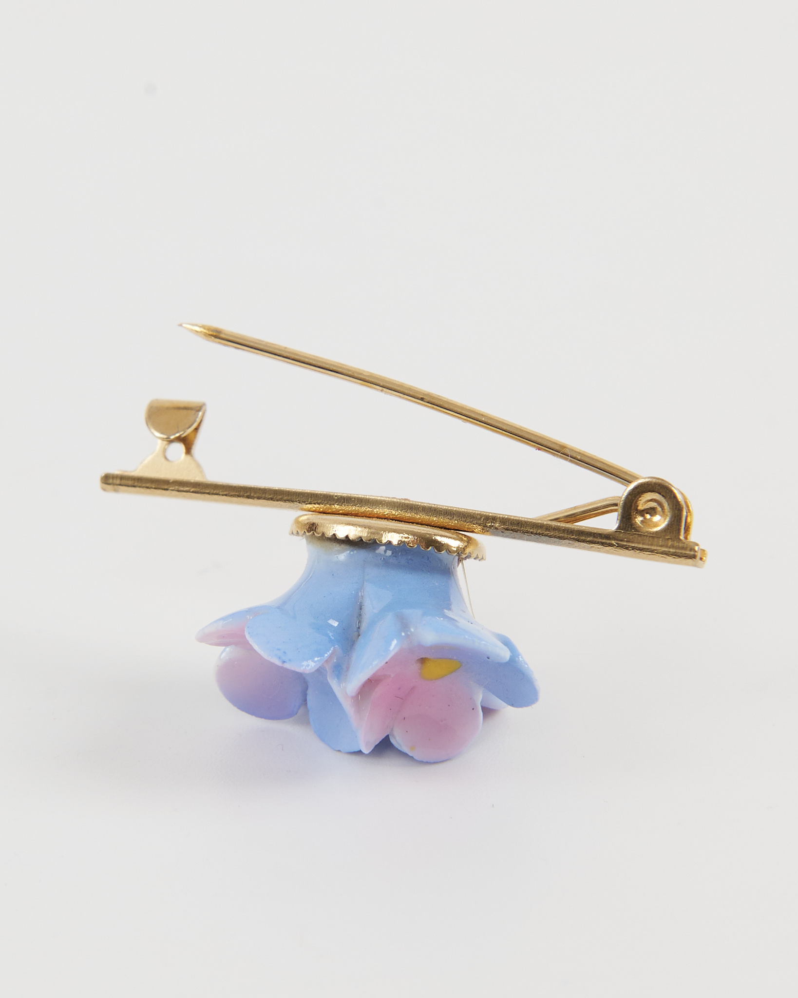 Брошь золотистого оттенка с объёмной декоративной вставкой в форме цветов пастельно-голубого и розового цвета. Композиция из трёх бутонов придаёт изделию акцент.