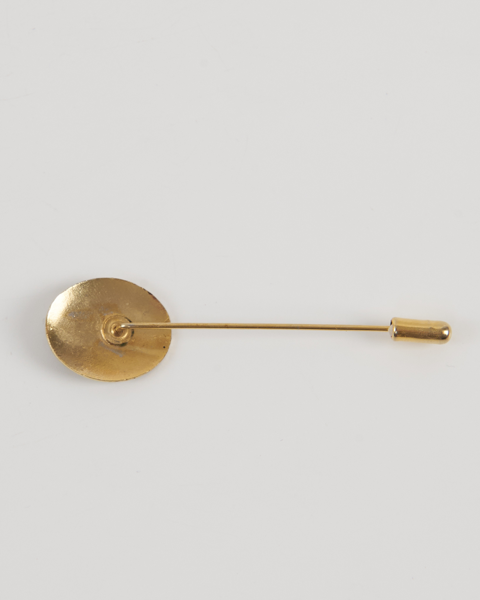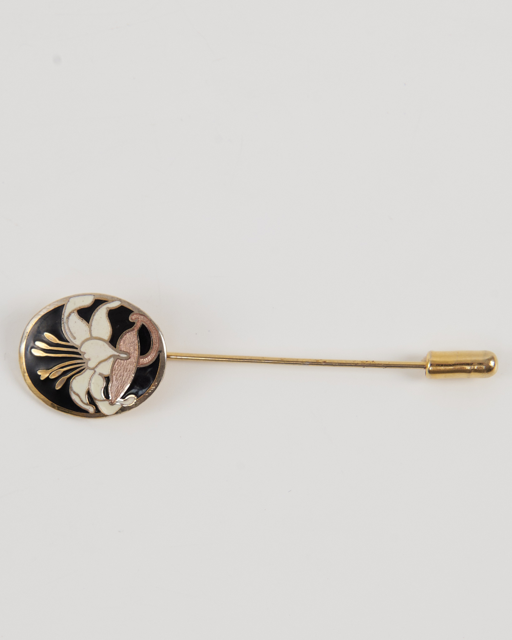 Винтажная брошь-булавка с эмалью и цветочным мотивом. Брошь выполнена из металла золотистого оттенка с декоративной эмалью. Тонкая игла обеспечивает аккуратную посадку на ткани и фиксируется надёжным наконечником.