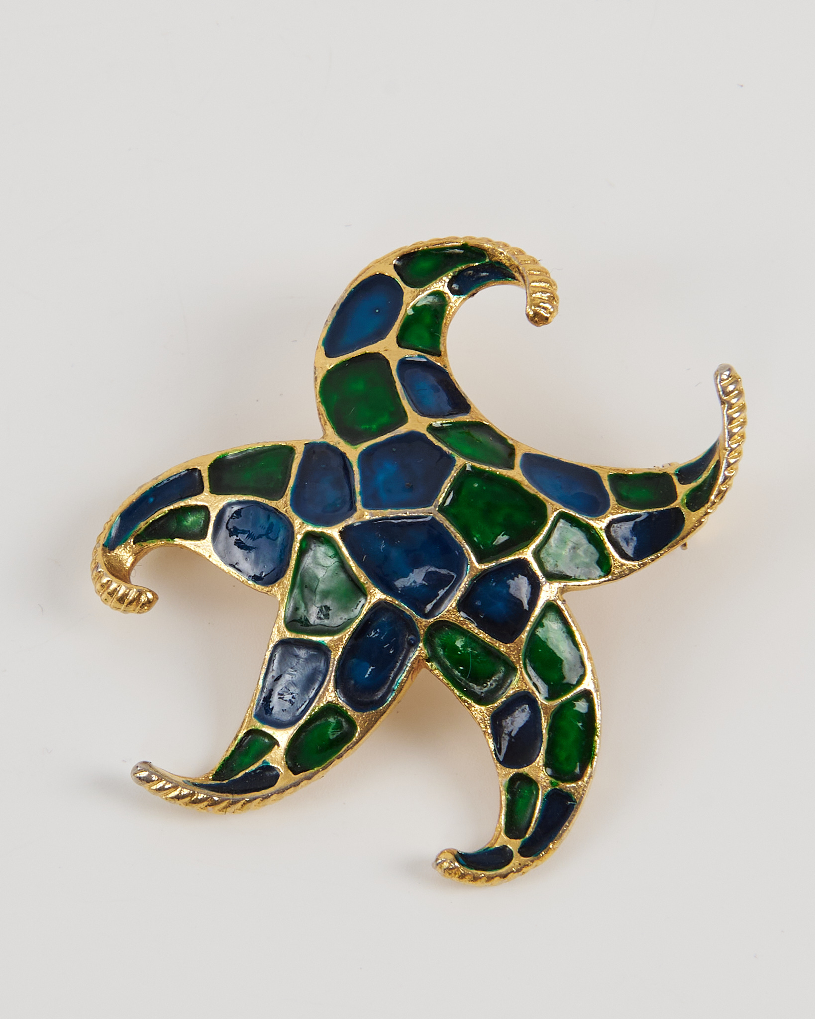 Брошь из металла золотистого оттенка с вставками эмали в синих и зелёных тонах. Надёжная посадка за счёт прочной застёжки. Мозаичный рисунок из разноцветных сегментов создаёт яркий акцент.