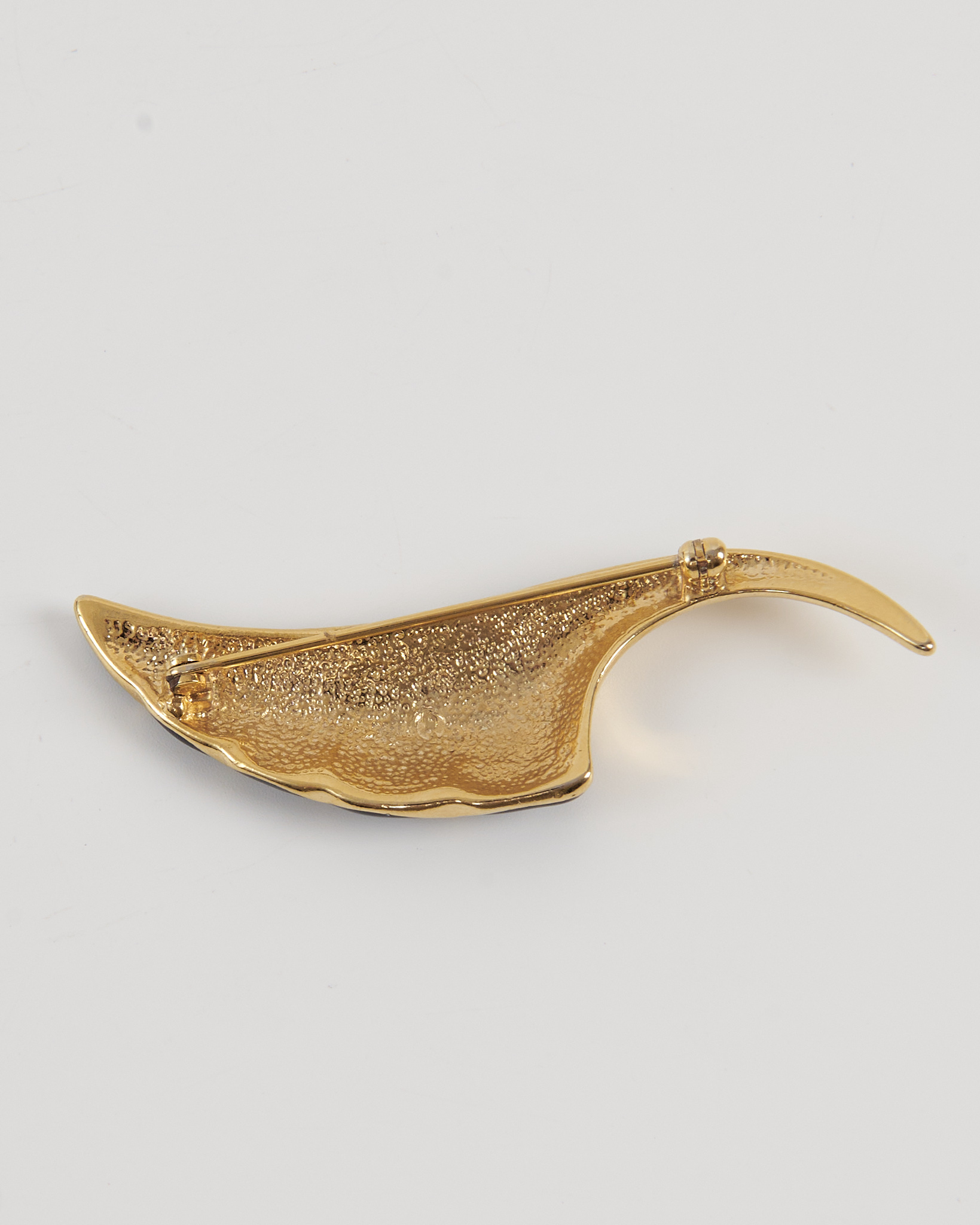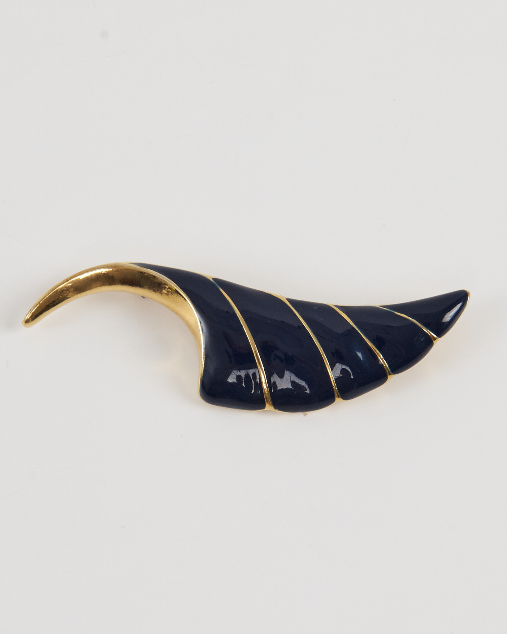 Брошь из металла с золотистым покрытием и тёмно-синей эмалью. Удобная застёжка фиксирует изделие ровно и стабильно. Золотые перегородки подчёркивают рельеф броши и придают изделию акцент.
