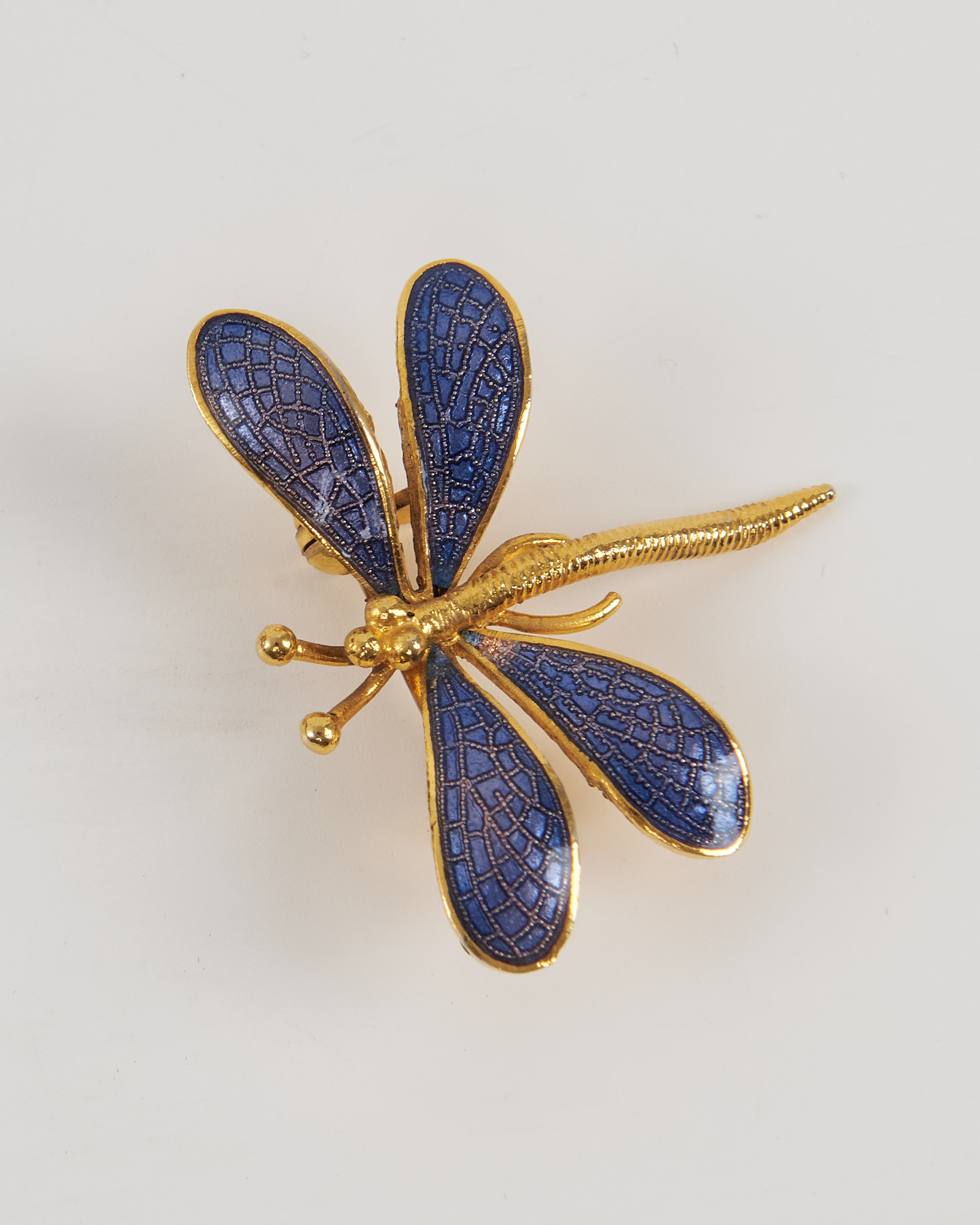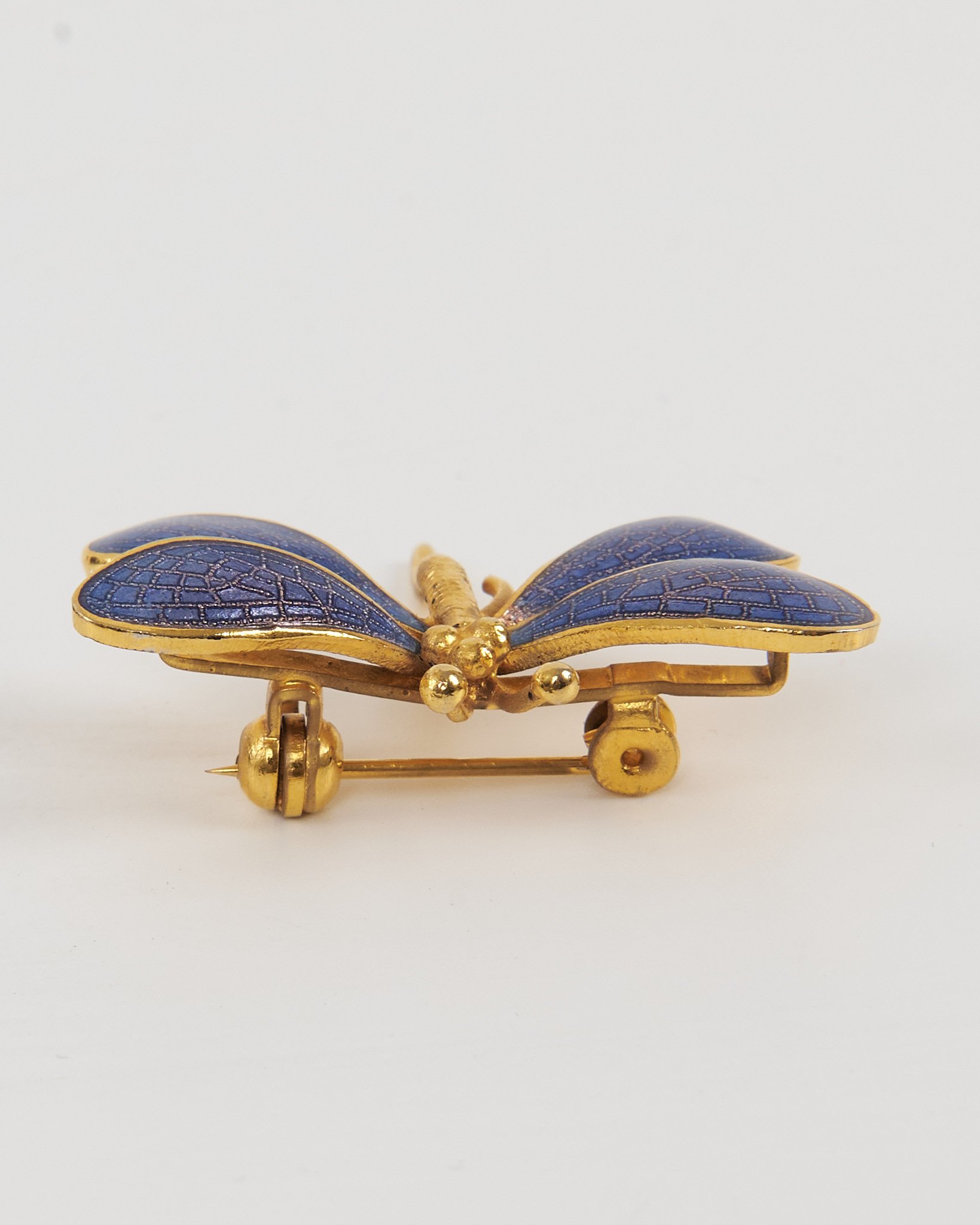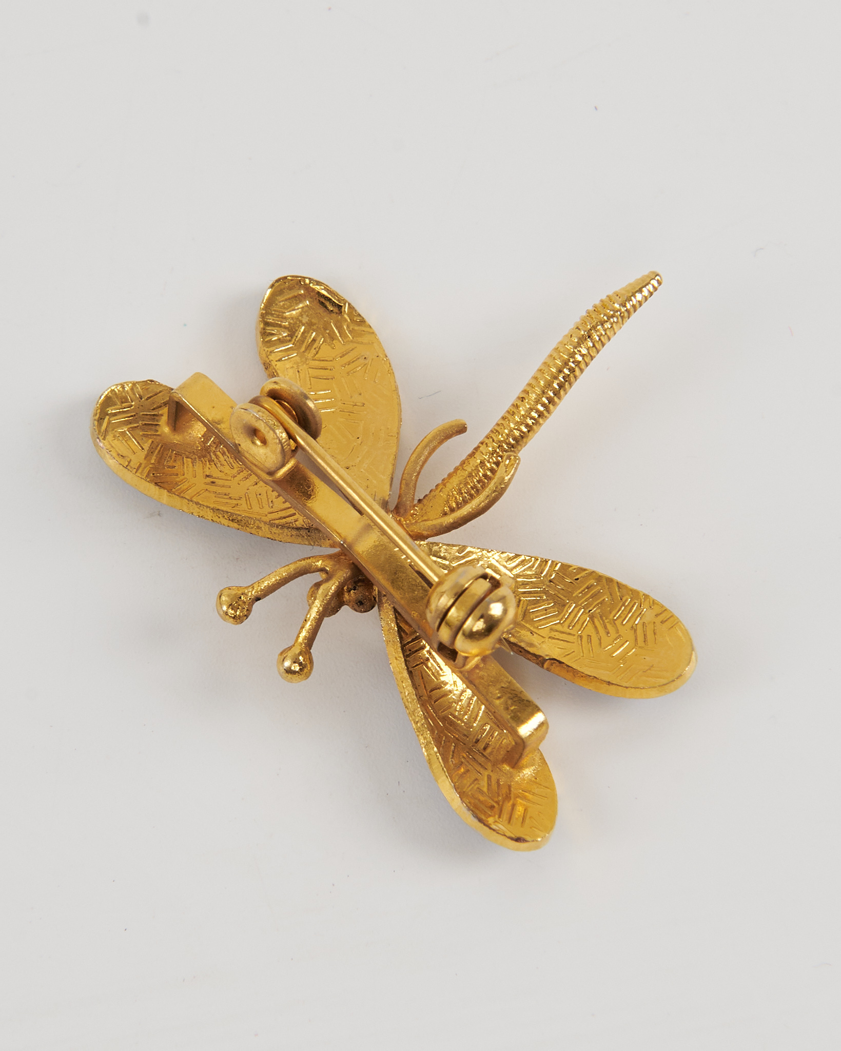 Винтажная брошь в золотом оттенке с фиолетовыми крыльями. Фактура крыльев рельефная, застёжка фиксирует изделие чётко и надёжно. Детальная проработка крыльев и корпуса придаёт аксессуару акцент.