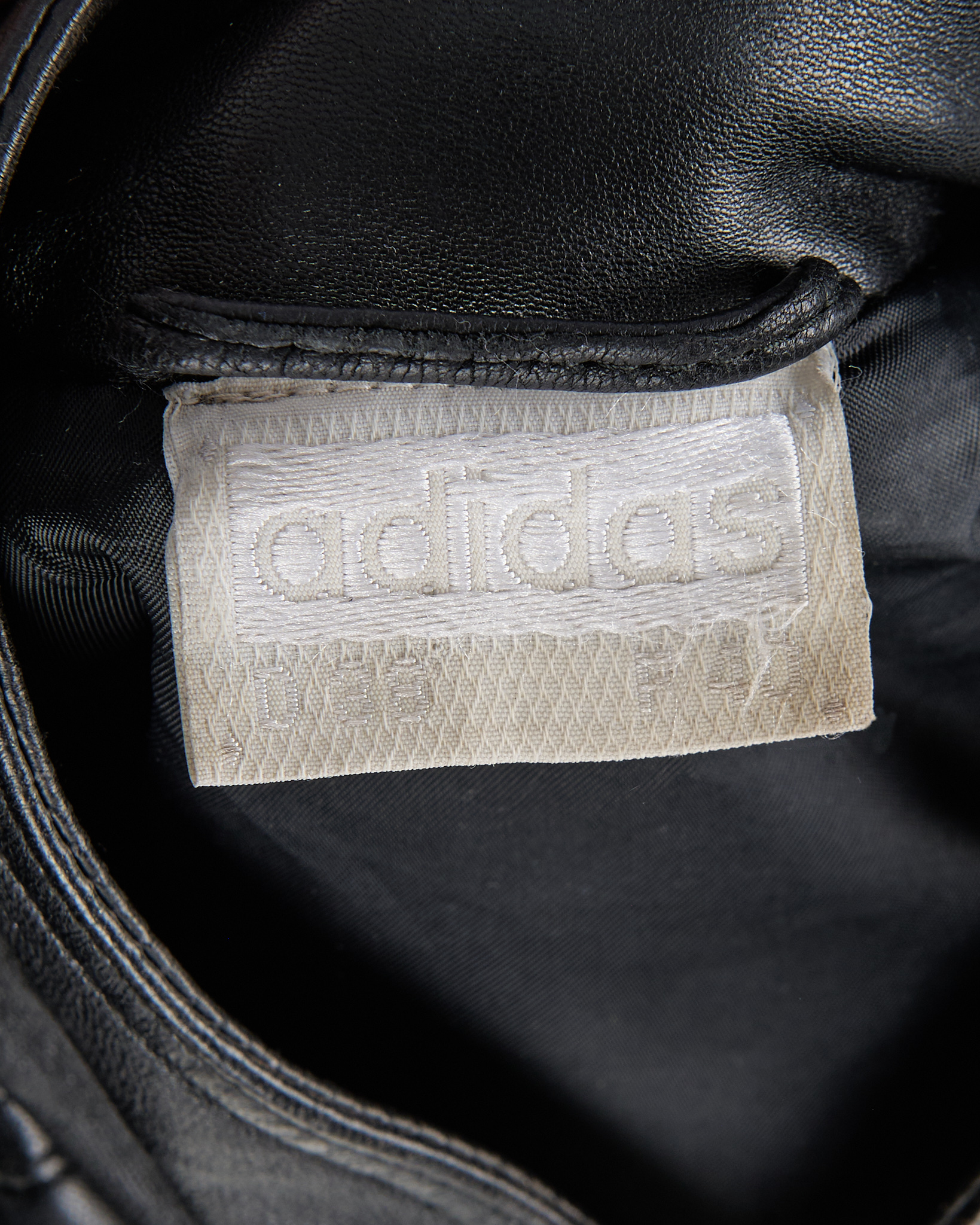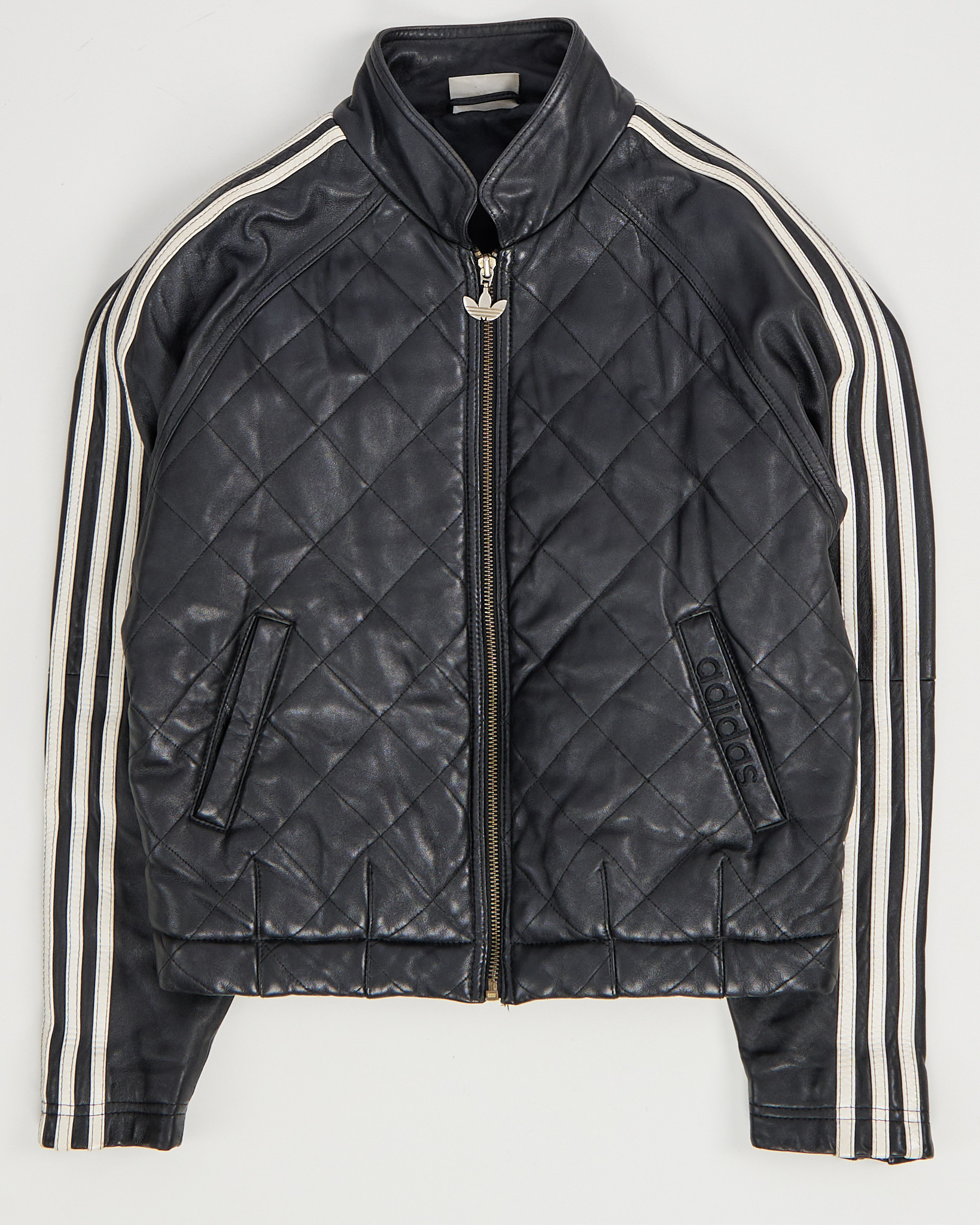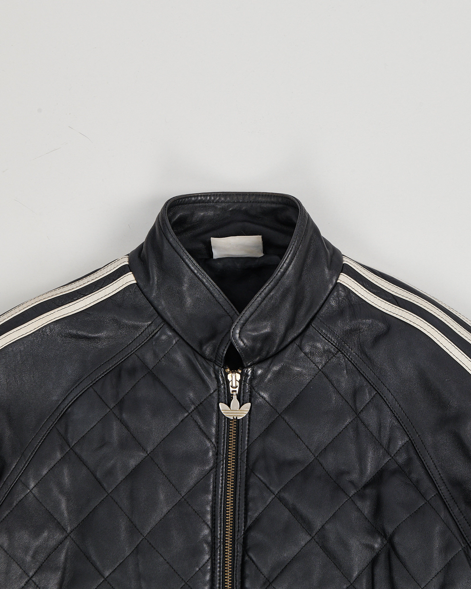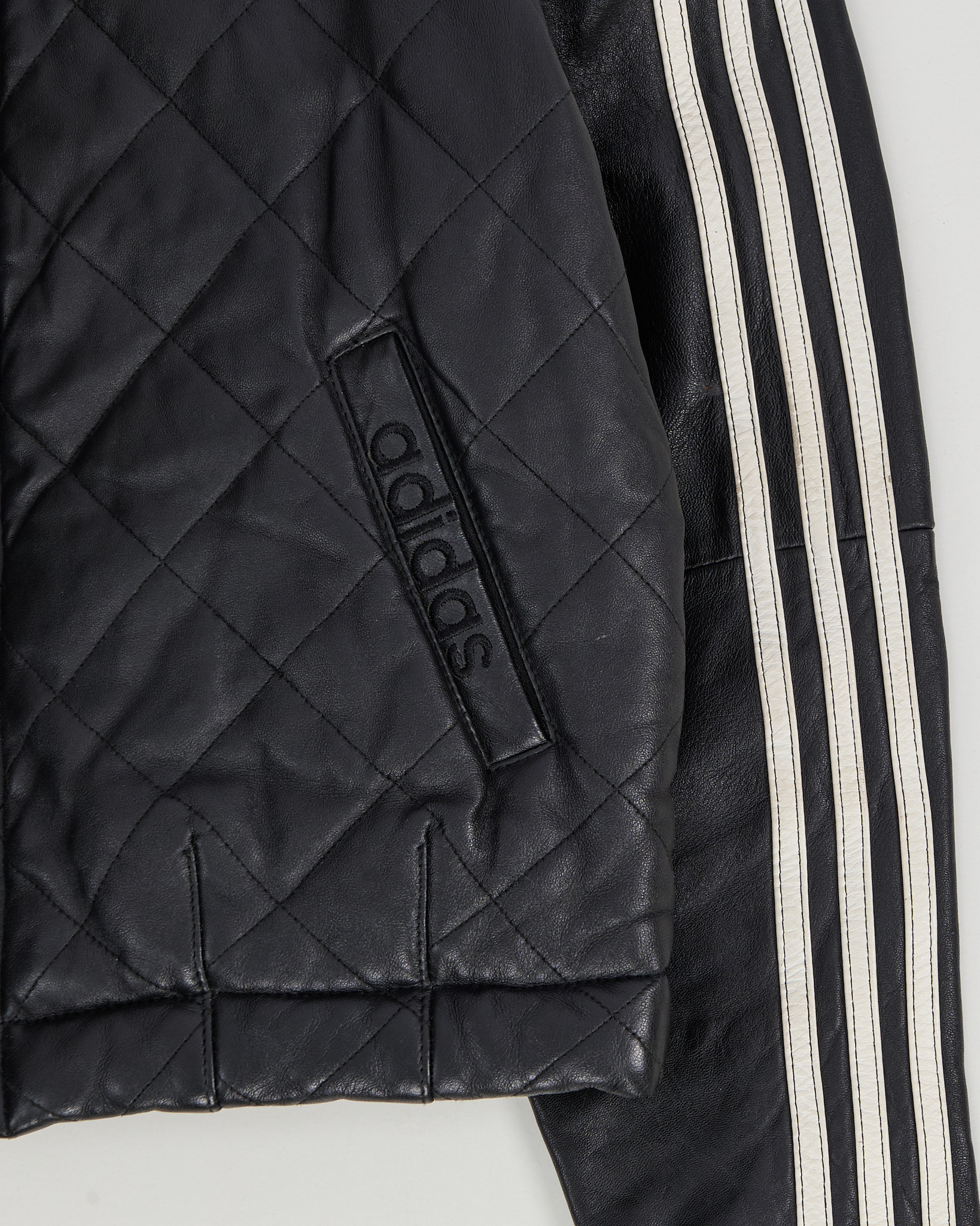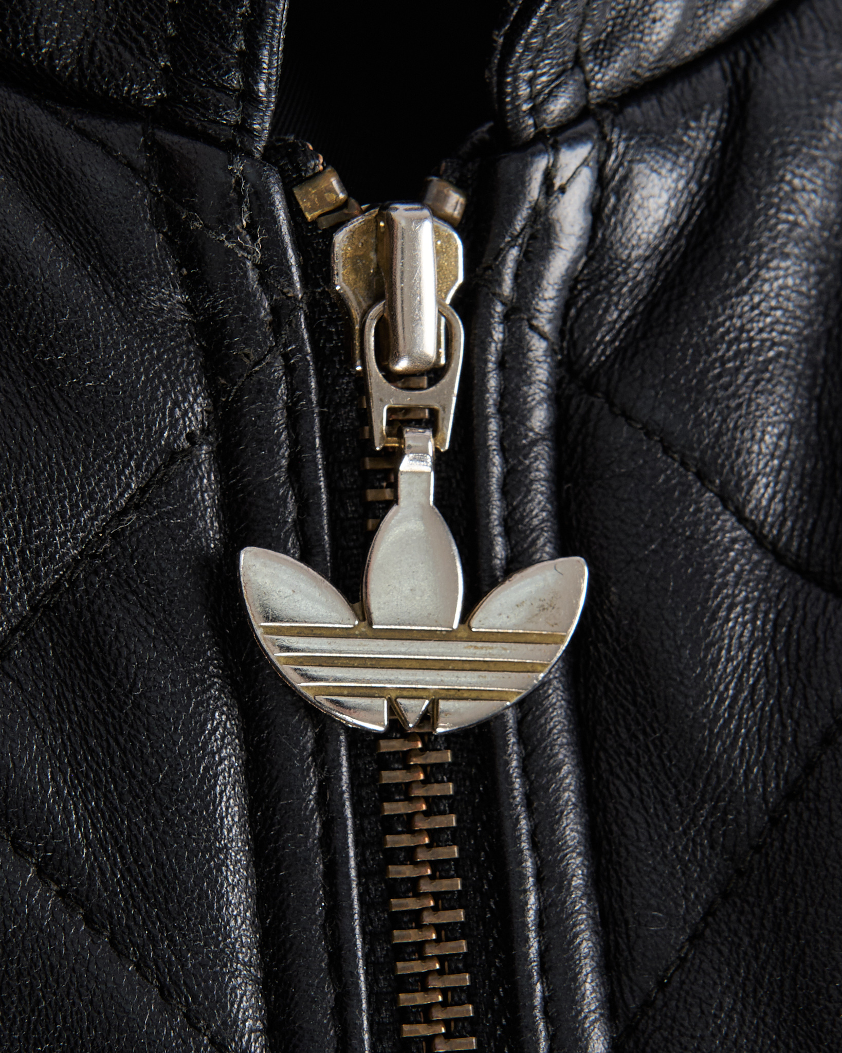 Куртка Adidas из натуральной чёрной кожи с ромбовидной стёжкой. Прямой крой, аккуратный силуэт по корпусу. Контрастные полосы на рукавах и металлическая молния с логтипом.