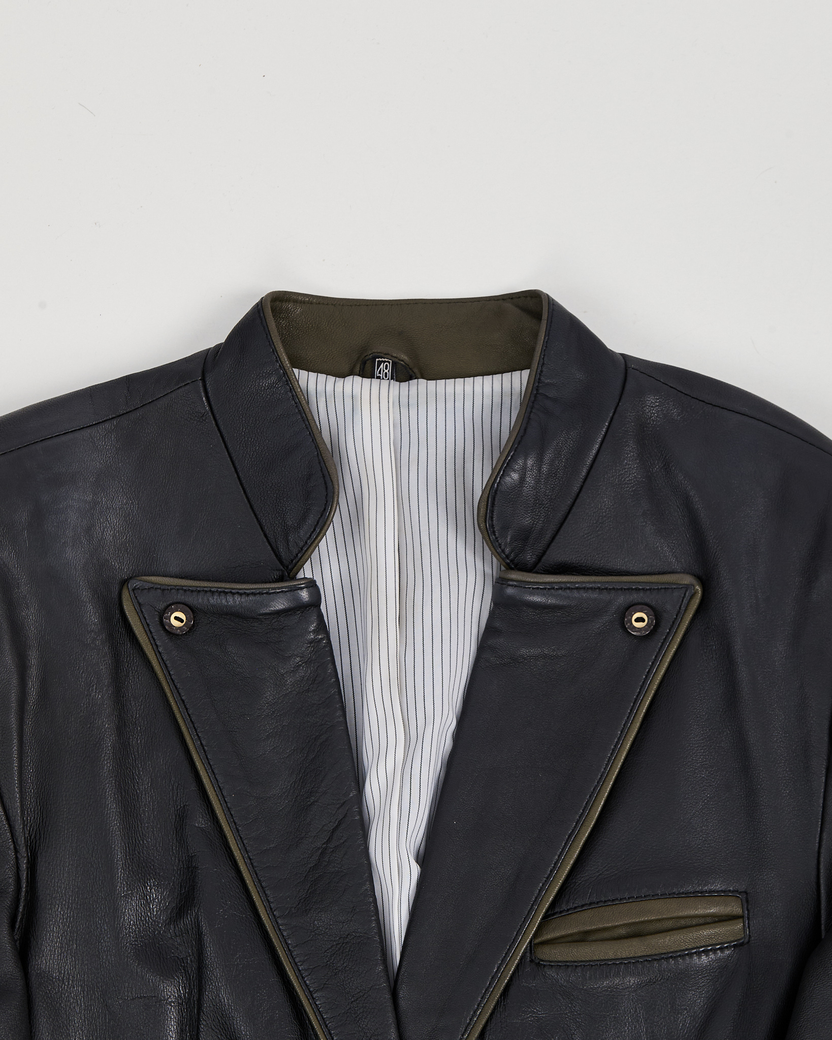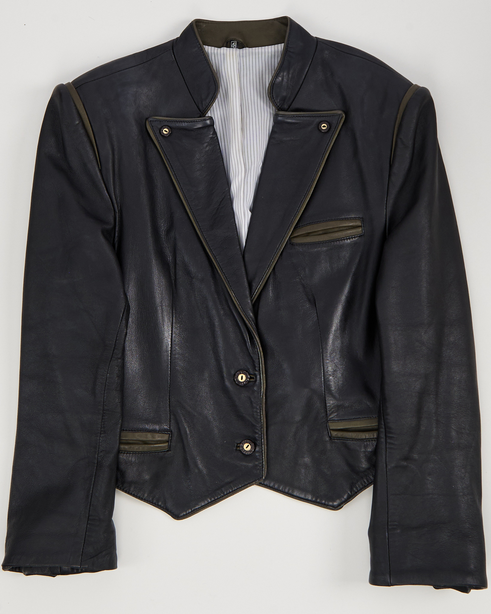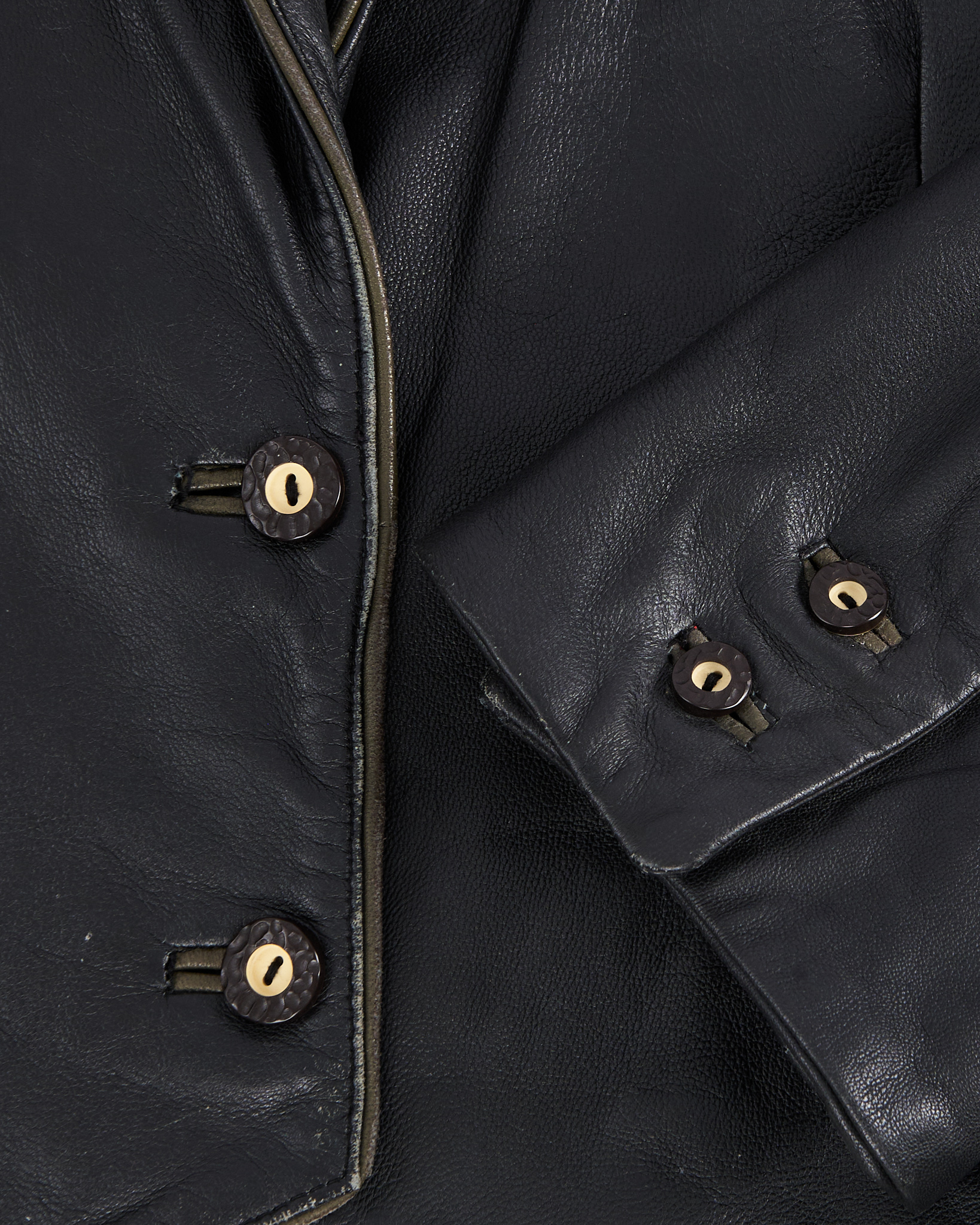 Двубортная куртка из 100% натуральной кожи. Приталенный силуэт, контрастная отделка карманов и лацканов, внутренняя подкладка в тонкую полоску.