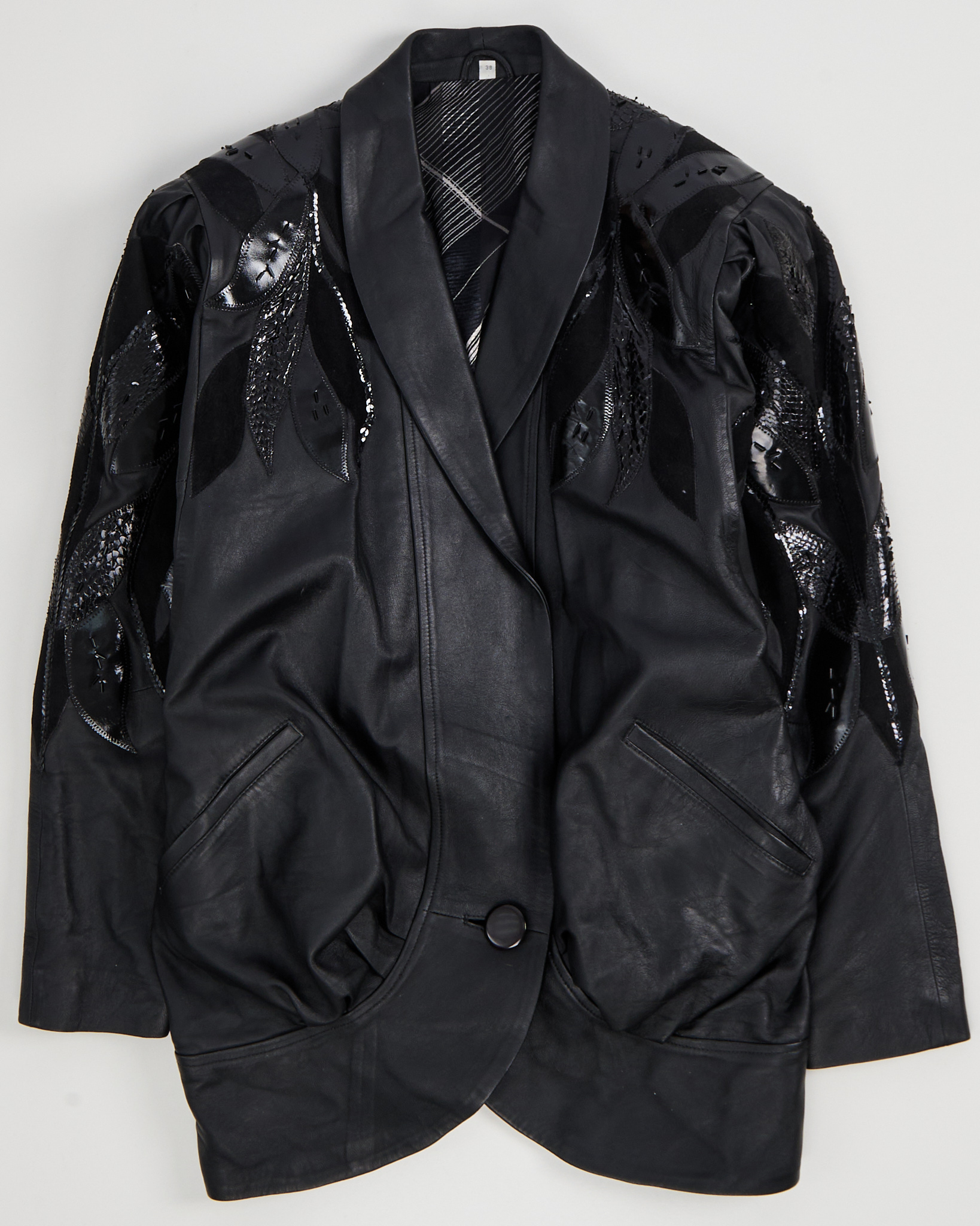 Кожаная куртка с декоративной отделкой. Выполнена из мягкой 100% натуральной кожи. Посадка свободная, укаршена декоративными кожаными вставками с пайетками и бисером. Застёжка на пуговицу, функциональные карманы по бокам.