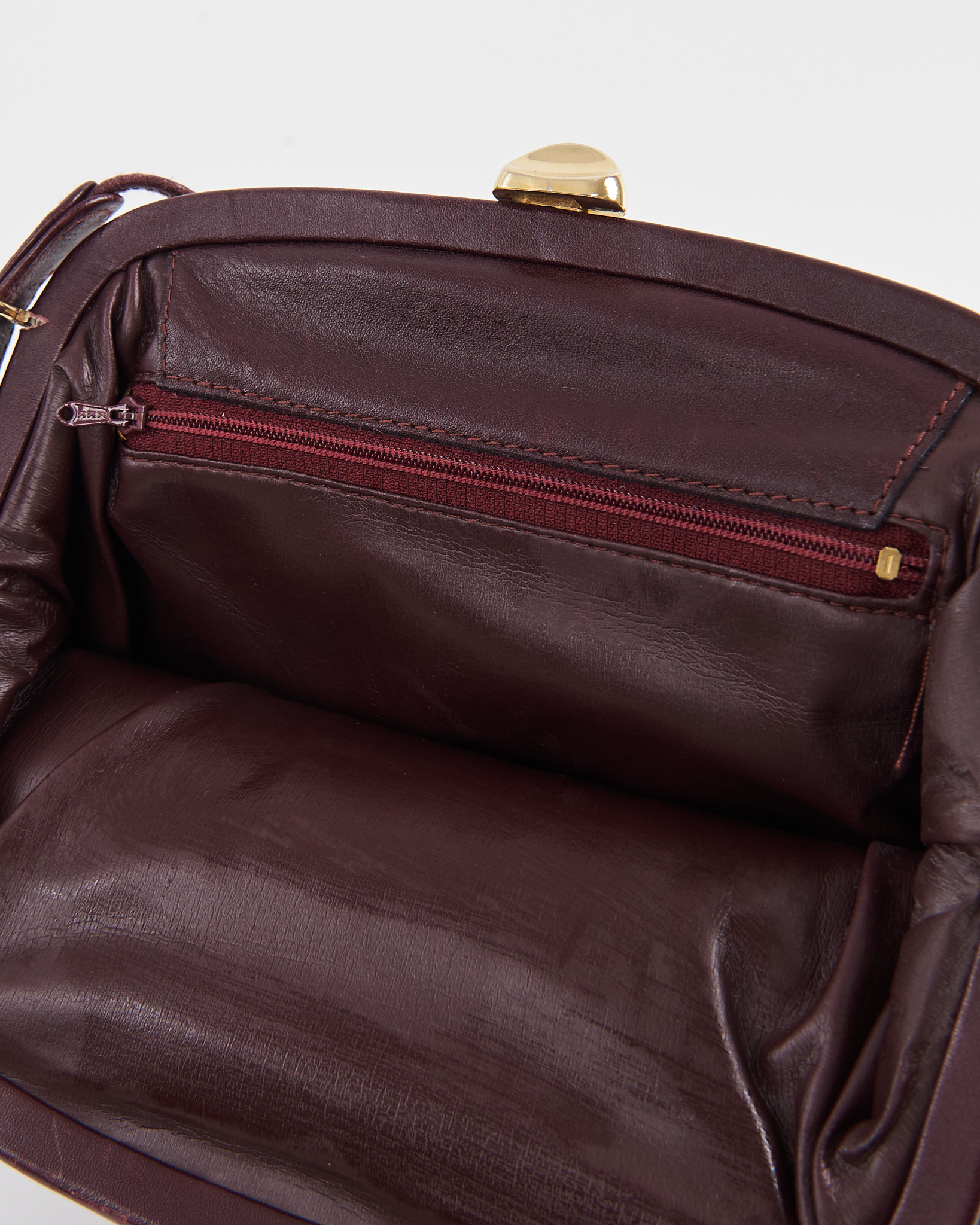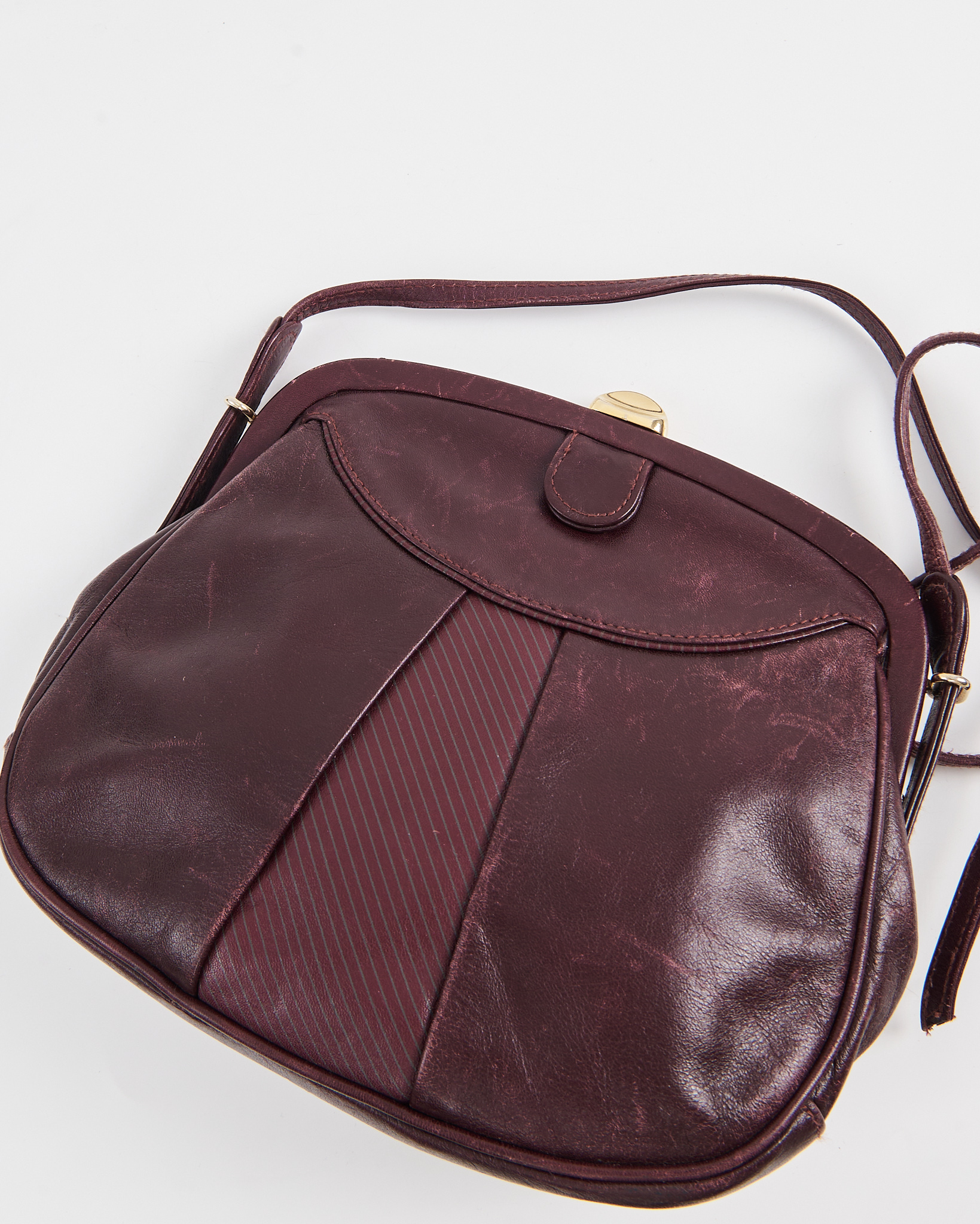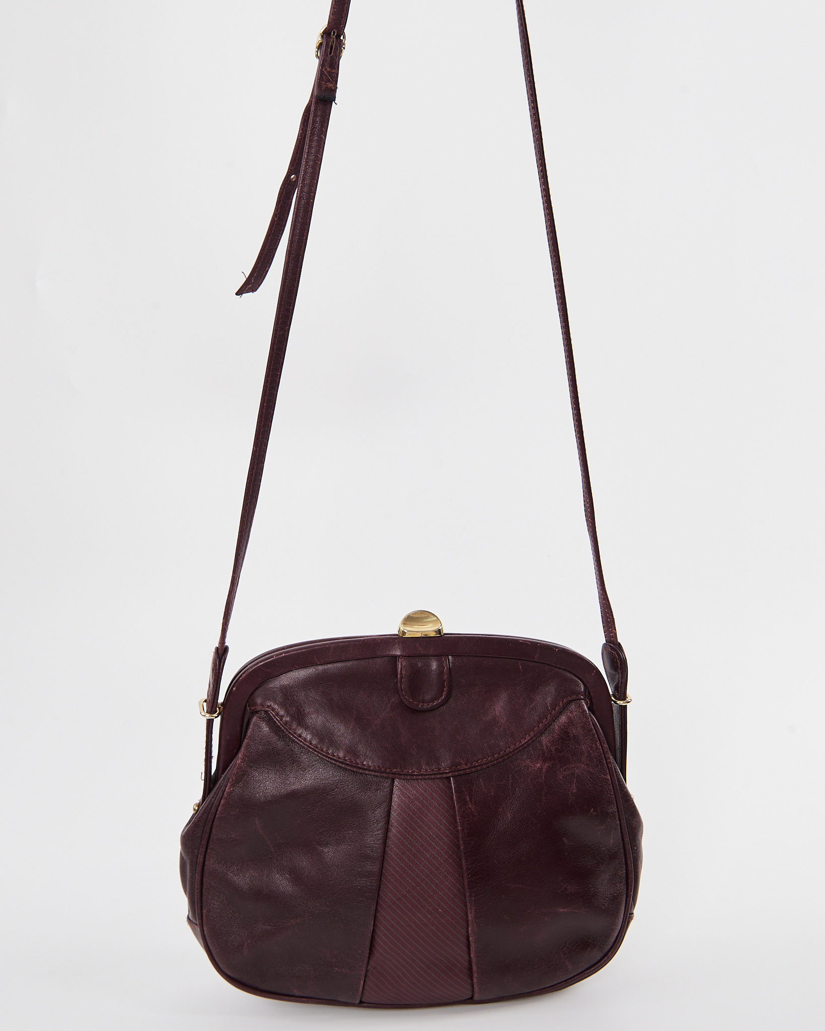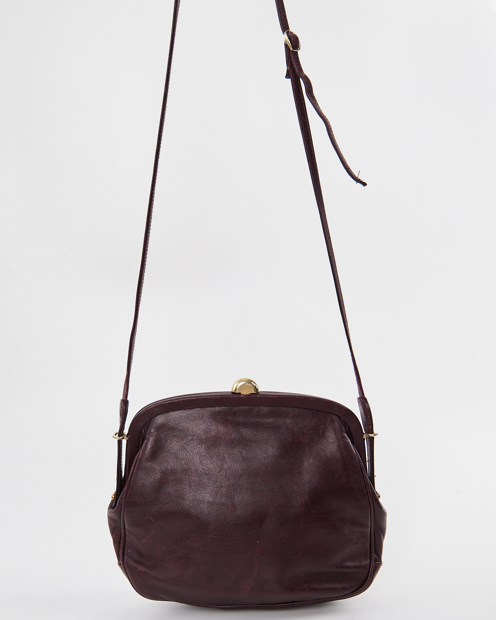 Компактная сумка из натуральной кожи глубокого винного оттенка. Регулируемый ремень обеспечивает удобную посадку на плече. Контрастная вставка с тонкой полоской добавляет акцент. Металлическая застёжка с золотистым блеском.