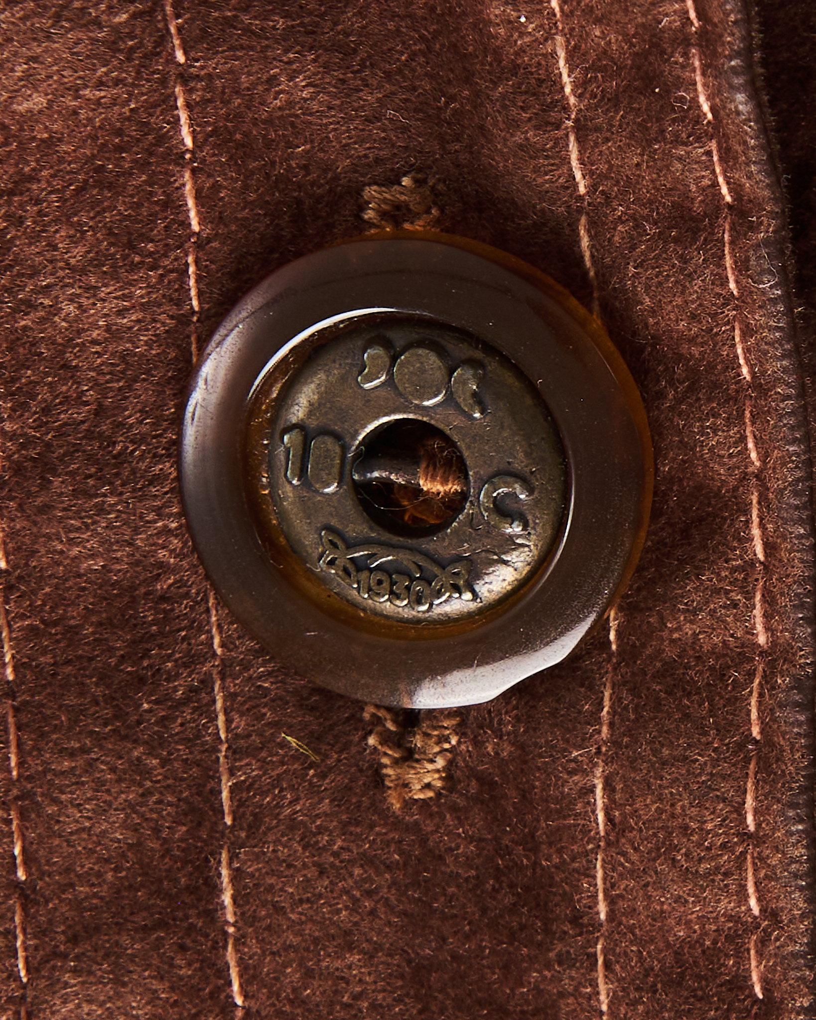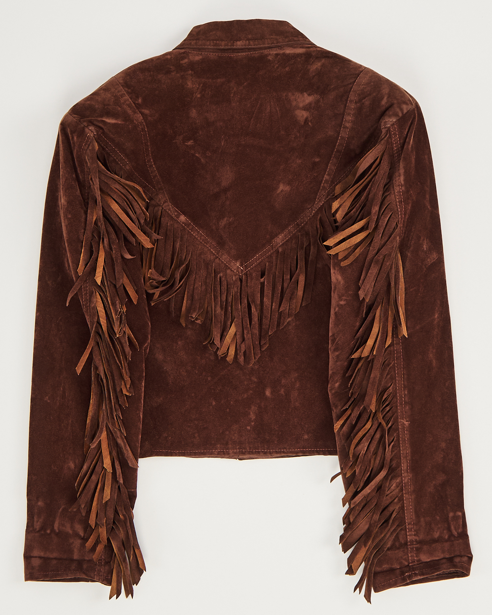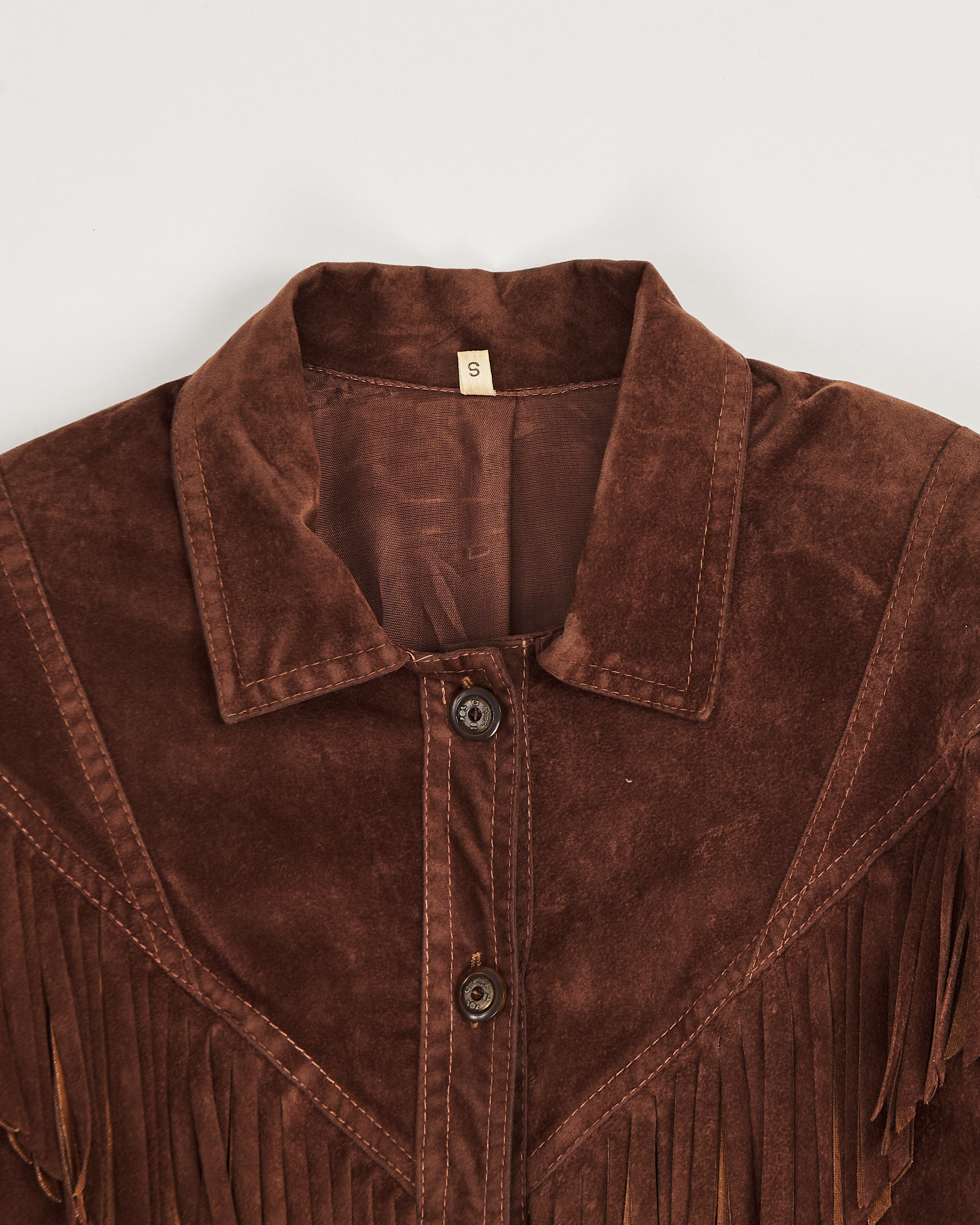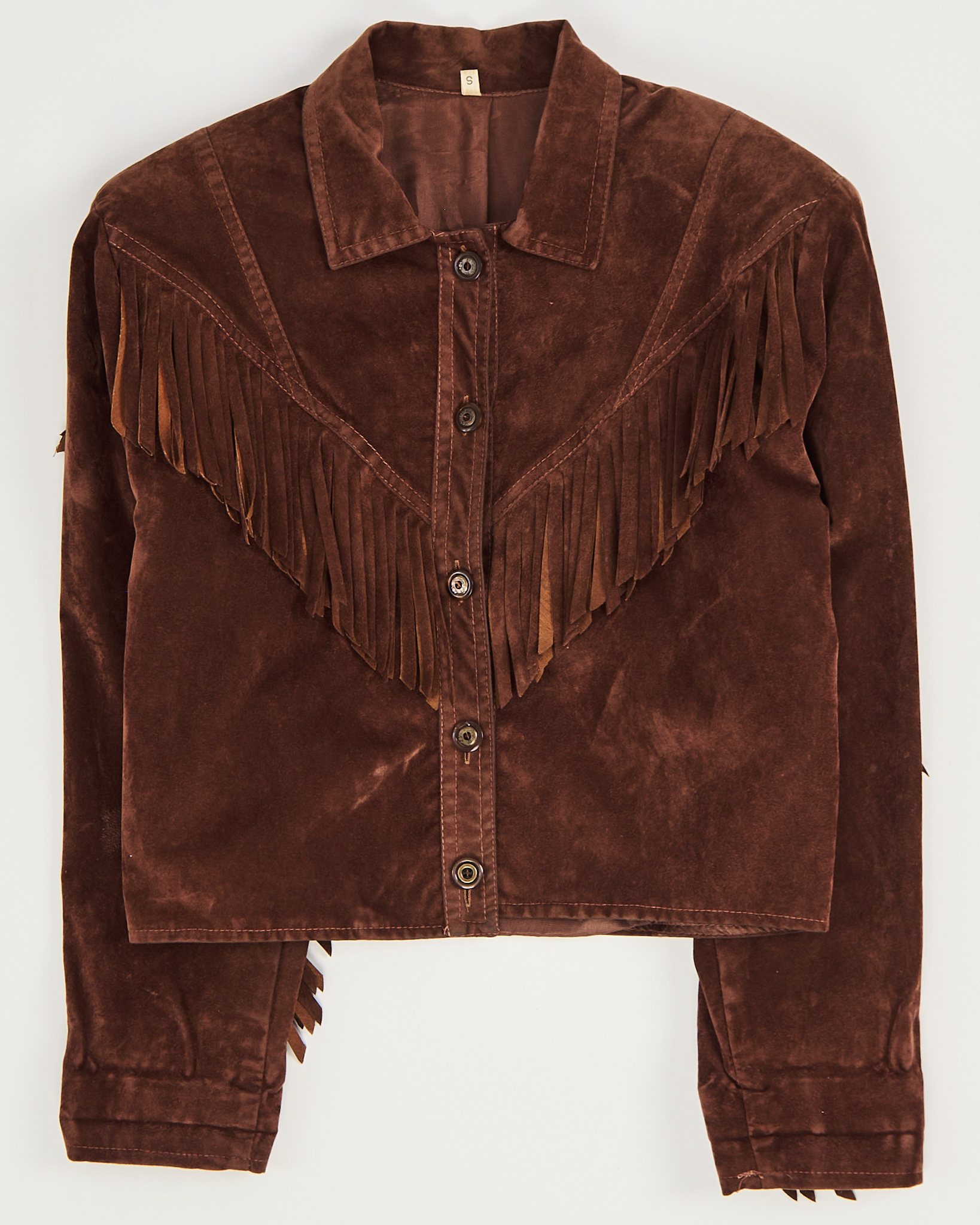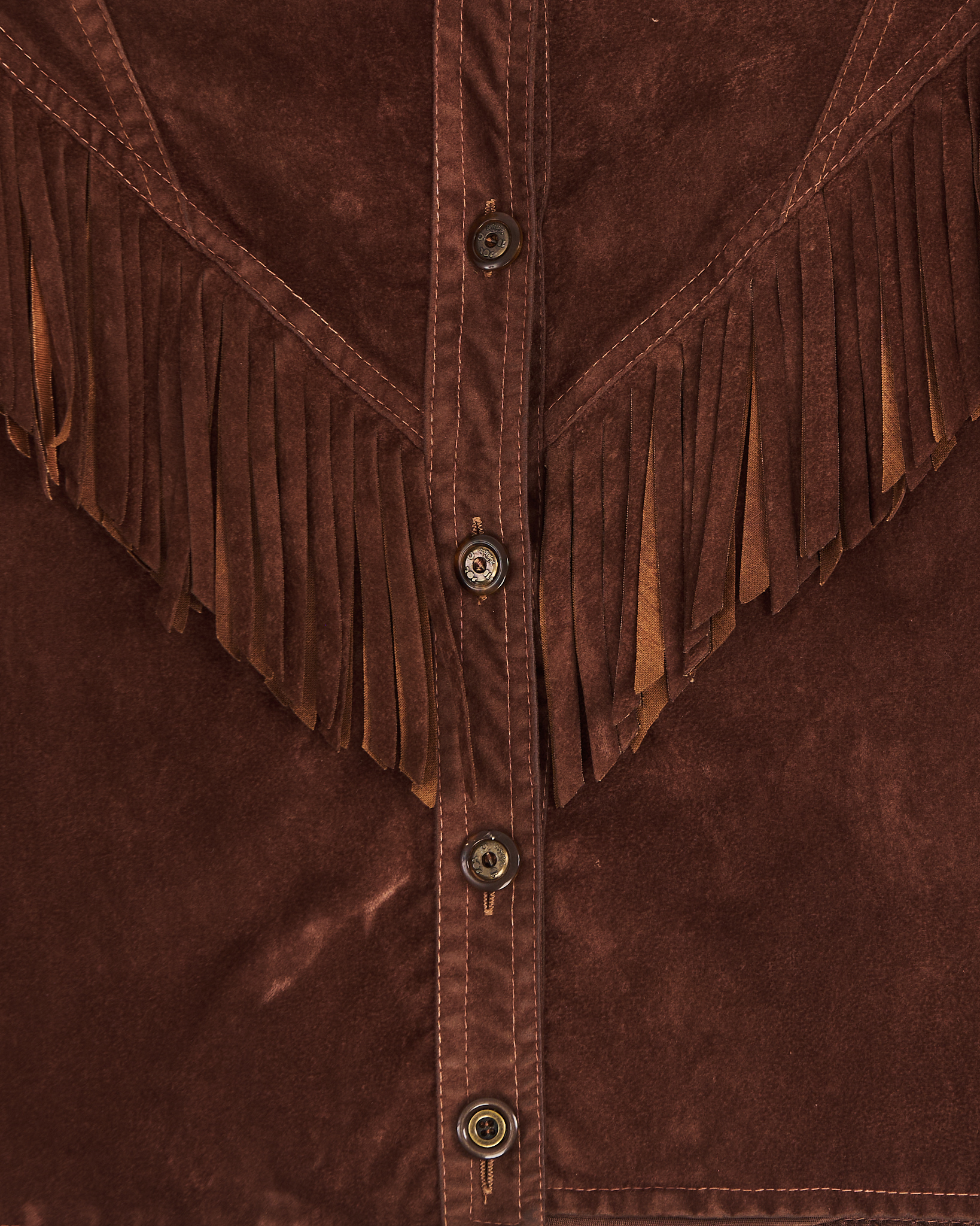 Винтажная куртка из мягкого материала глубокого коричневого оттенка. Материал бархатистый на ощупь, посадка прямая и комфортная. Акцентная бахрома на плечах и груди, удобная застежка на пуговицы.