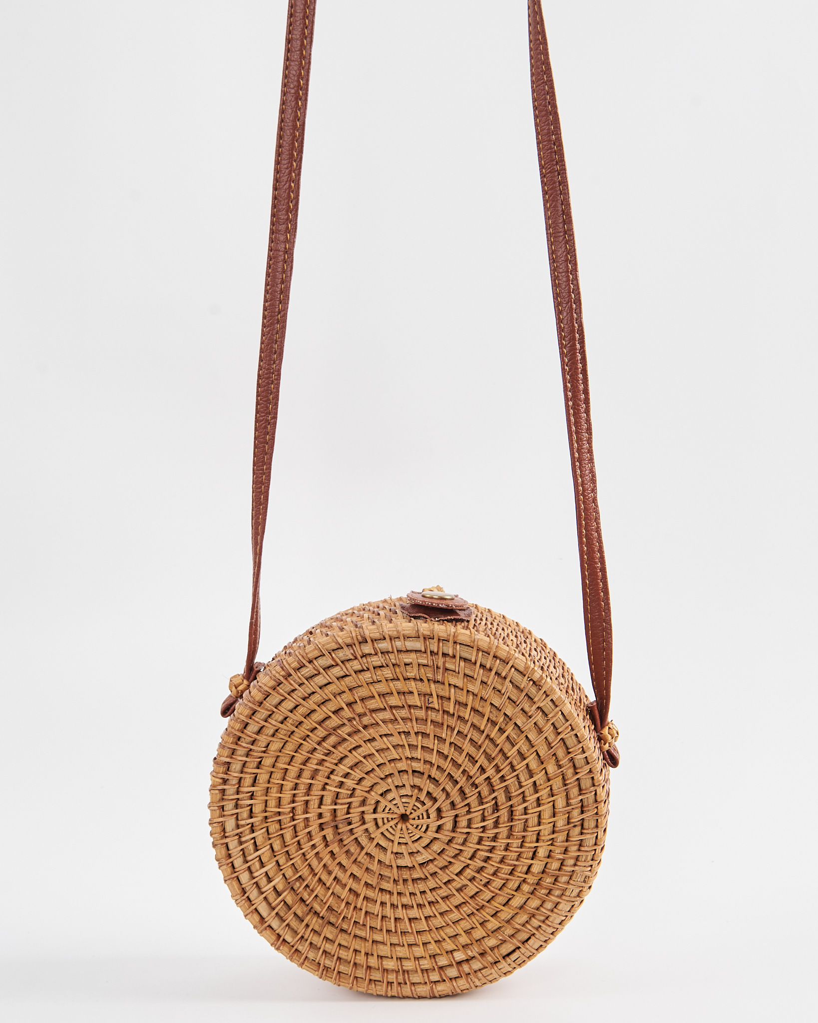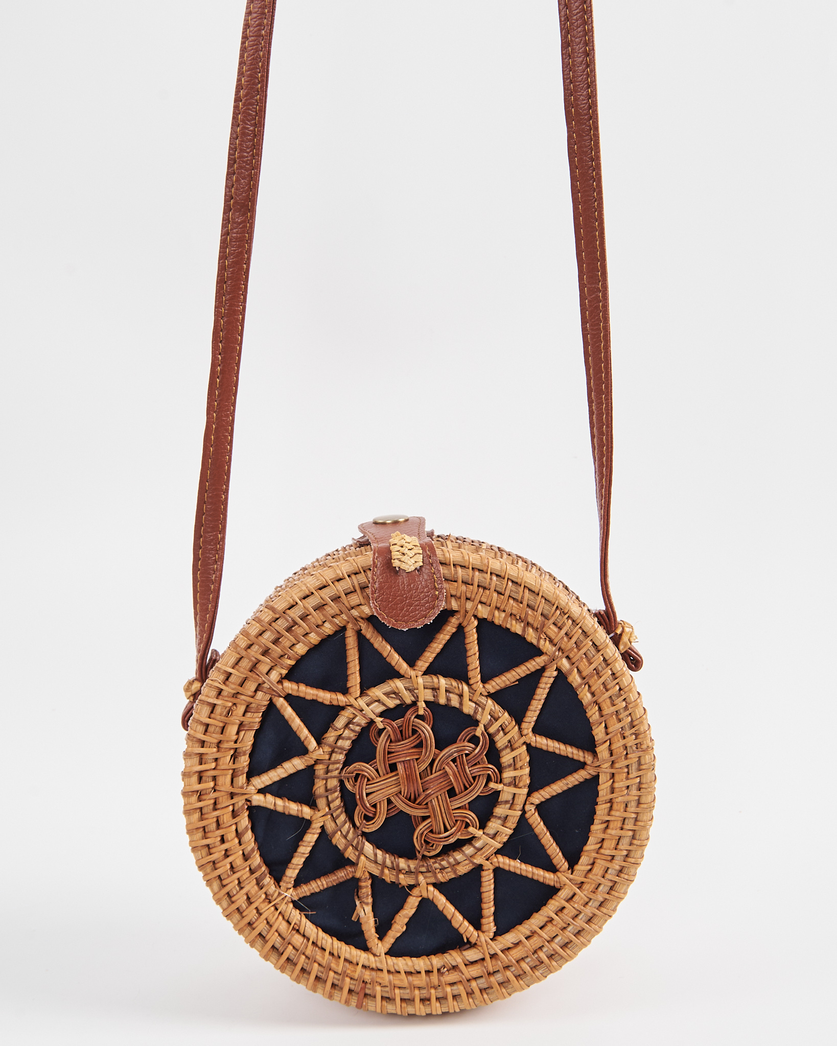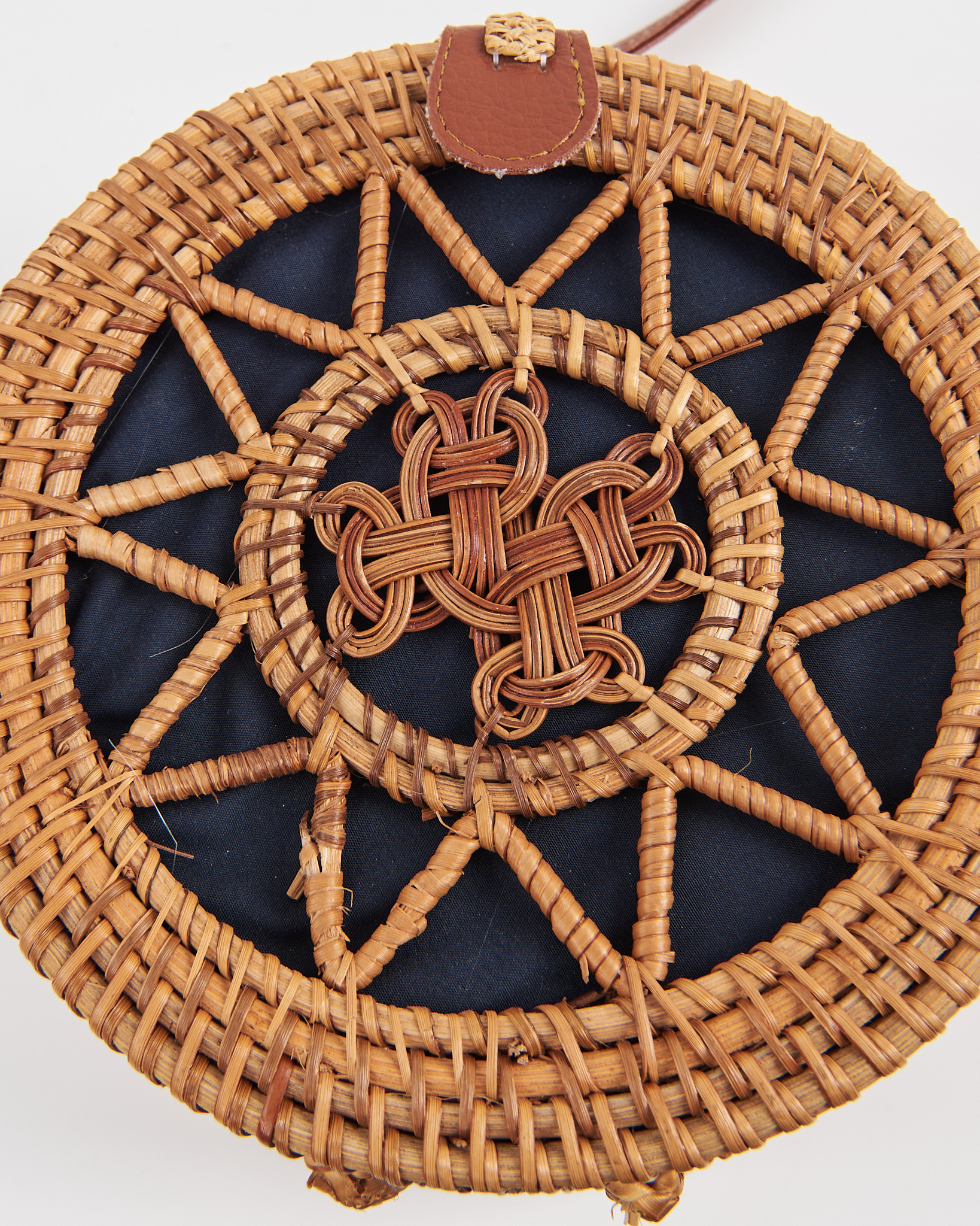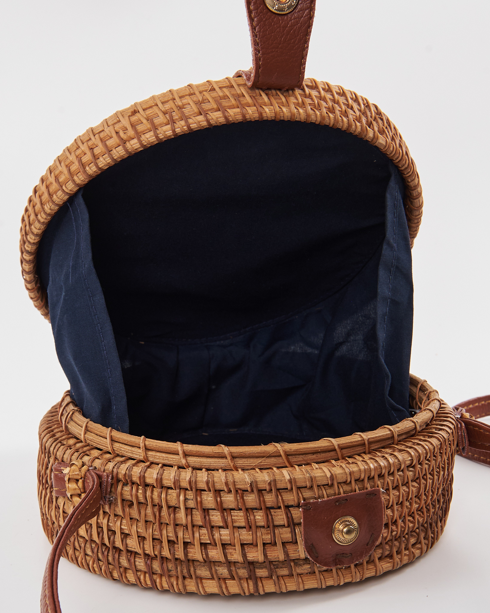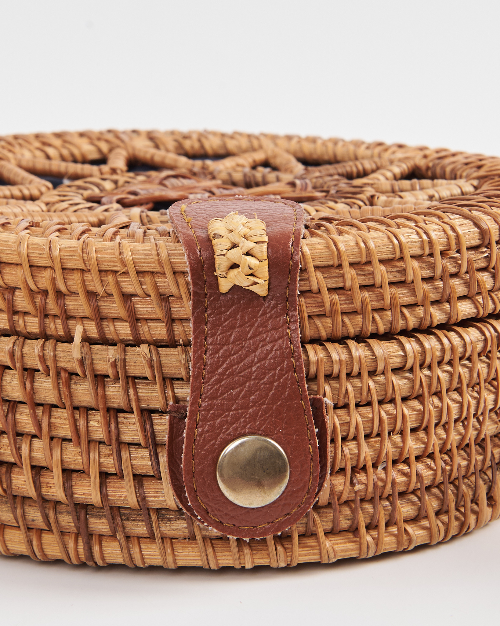 Сумка выполнена из натурального ротанга. Жёсткая форма держит силуэт, аккуратная посадка за счёт узкого кожаного ремня. Контраст тёмной внутренней подкладки и светлого плетения придает сумке акцент.