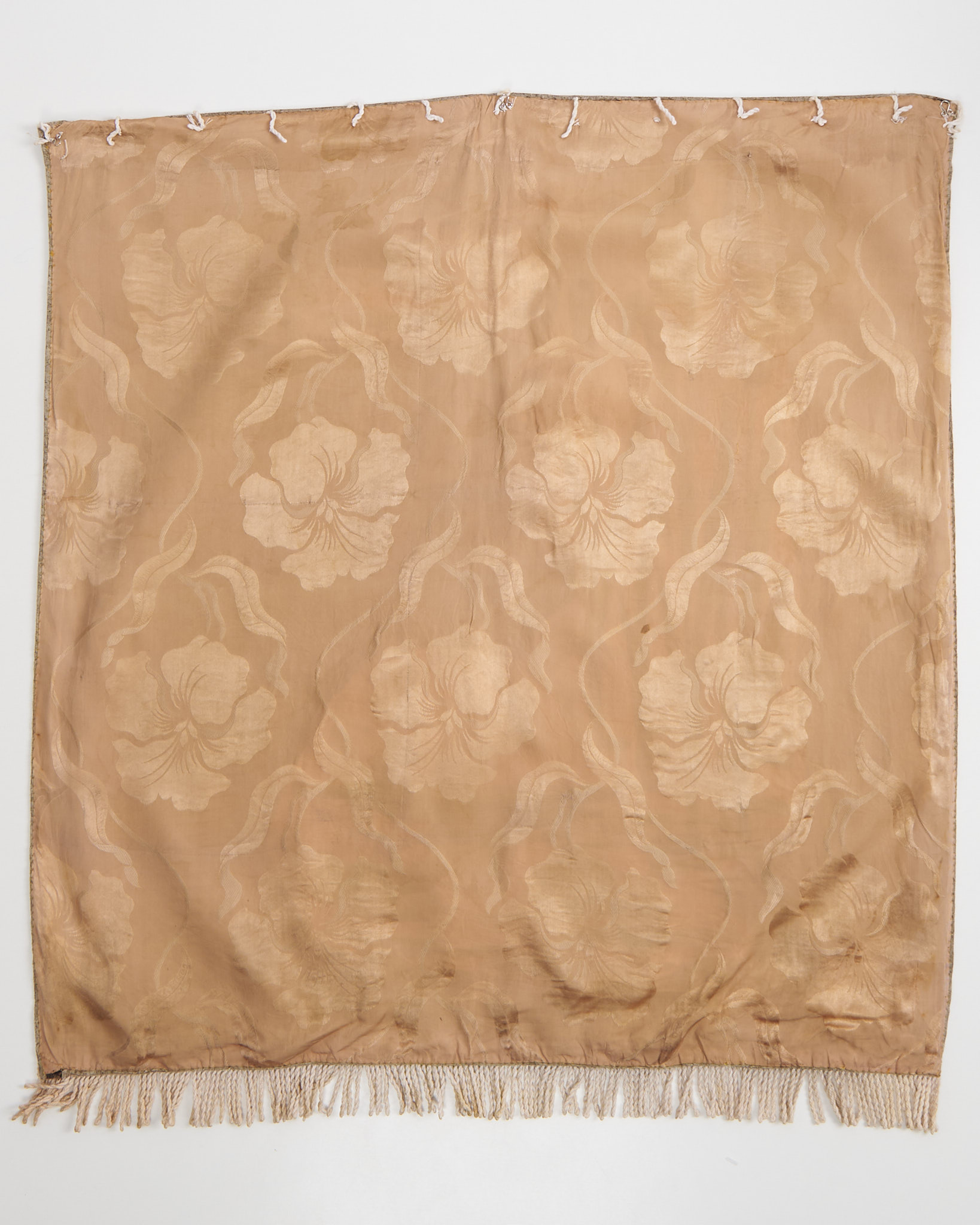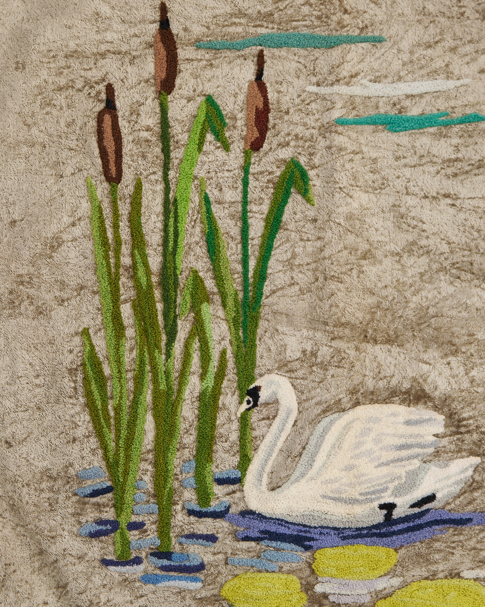 Винтажное плюшевое панно «Лебединое озеро». Густой ворс, сюжет с плывущим лебедем и камышами на бежевом бежевом фоне. Гладкая подкладка с крупным цветочным паттерном.