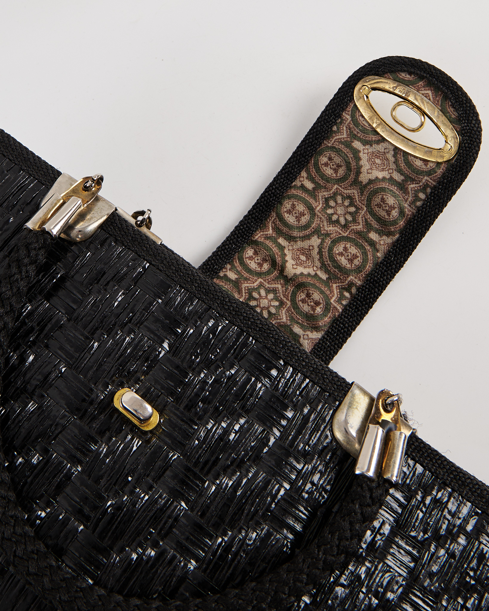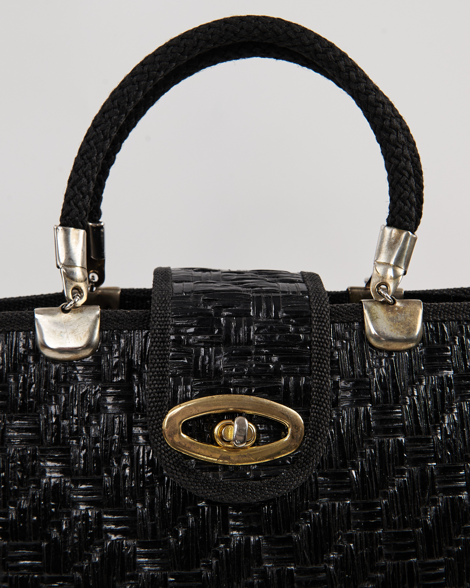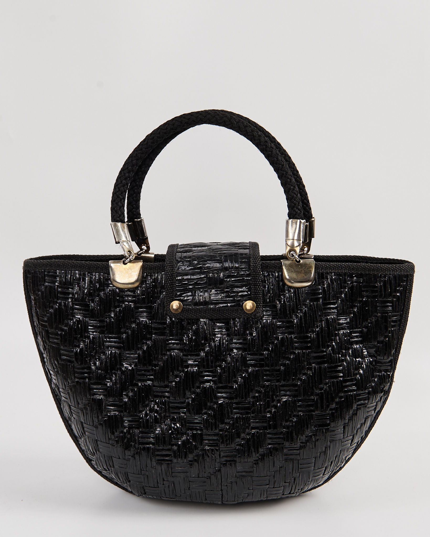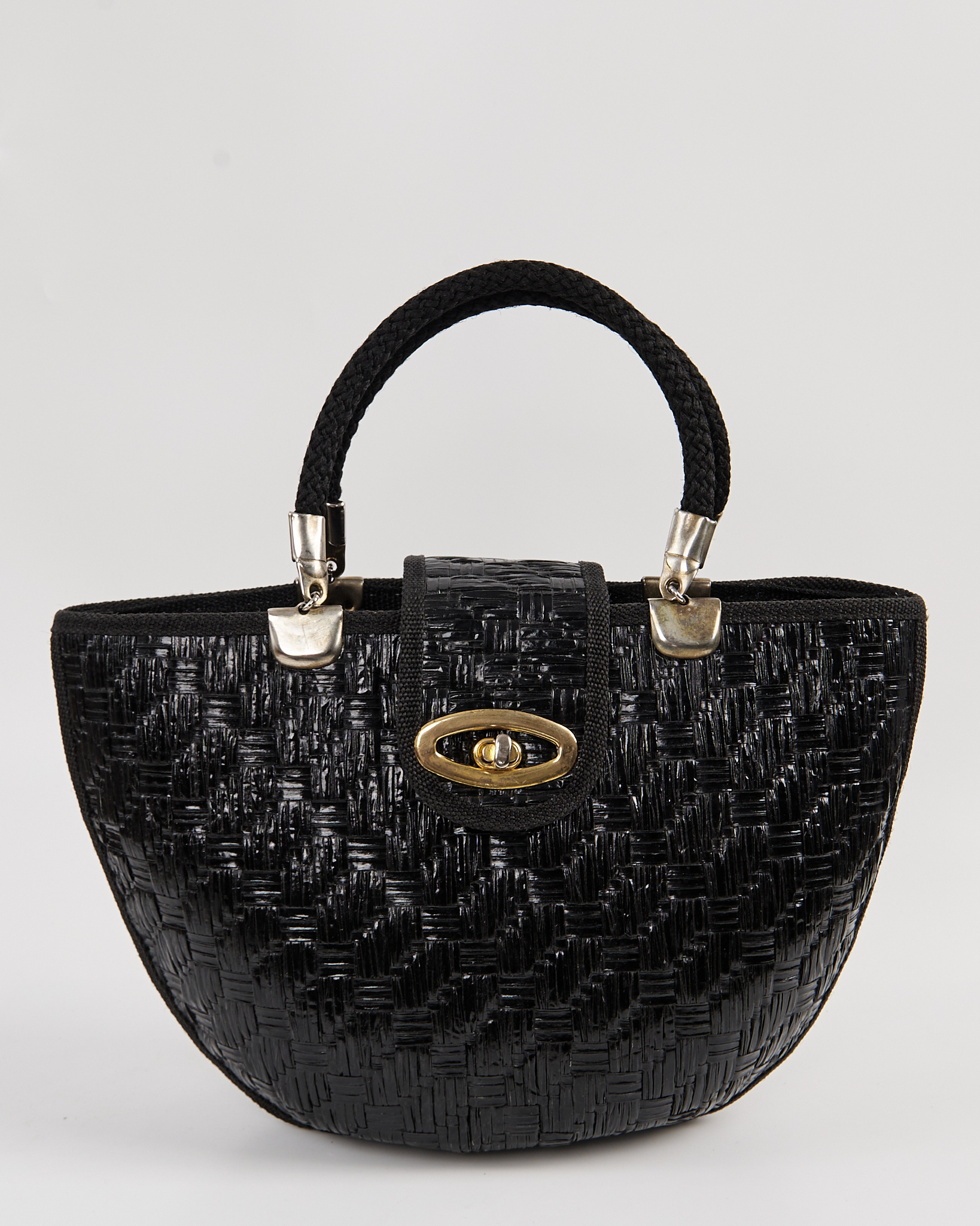 Сумка из плотного плетёного материала глубокого чёрного цвета. Жёсткая фактура держит форму, короткая ручка из плотного шнура. Металлический поворотный замок.