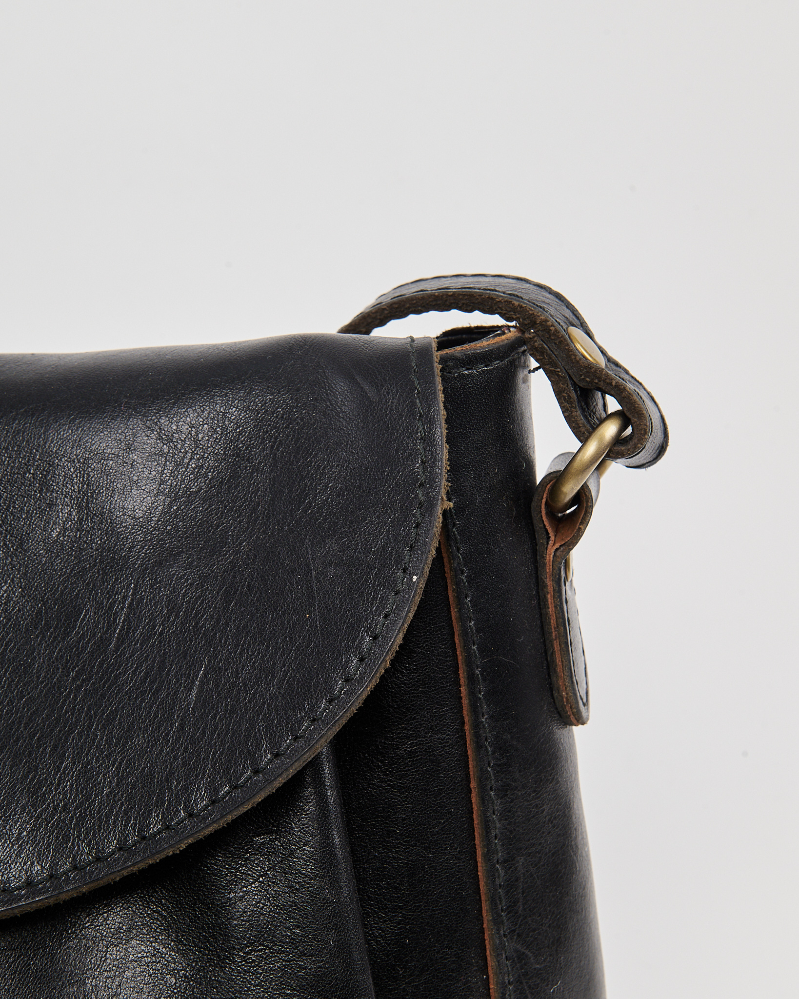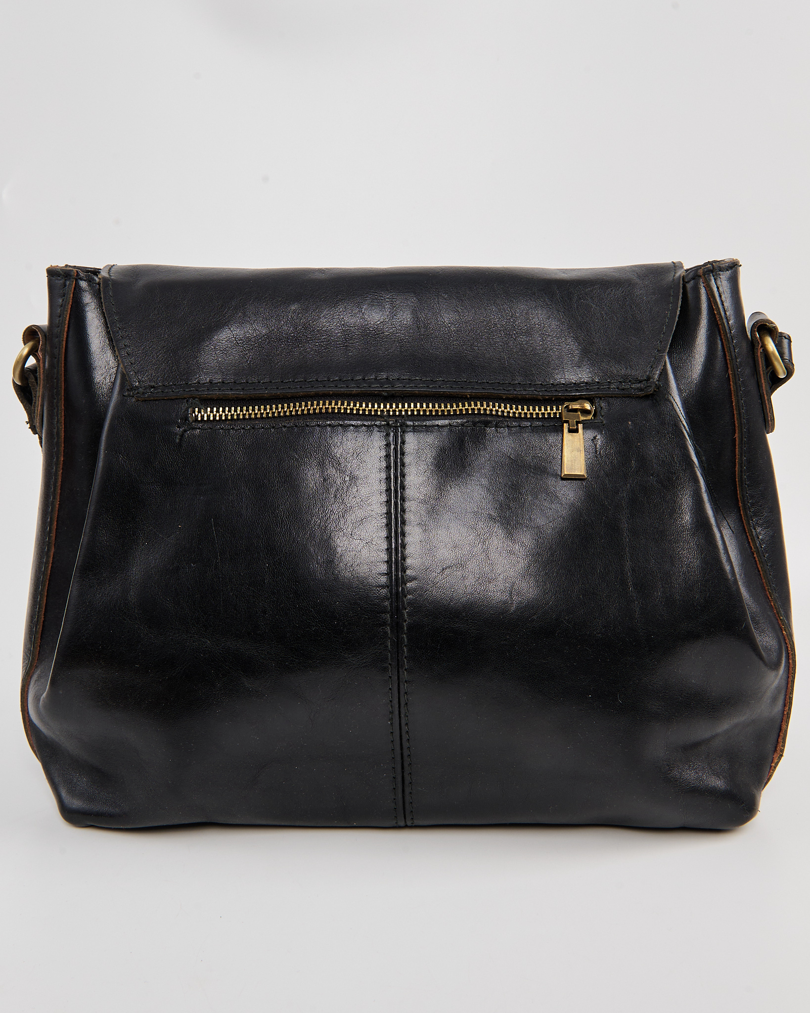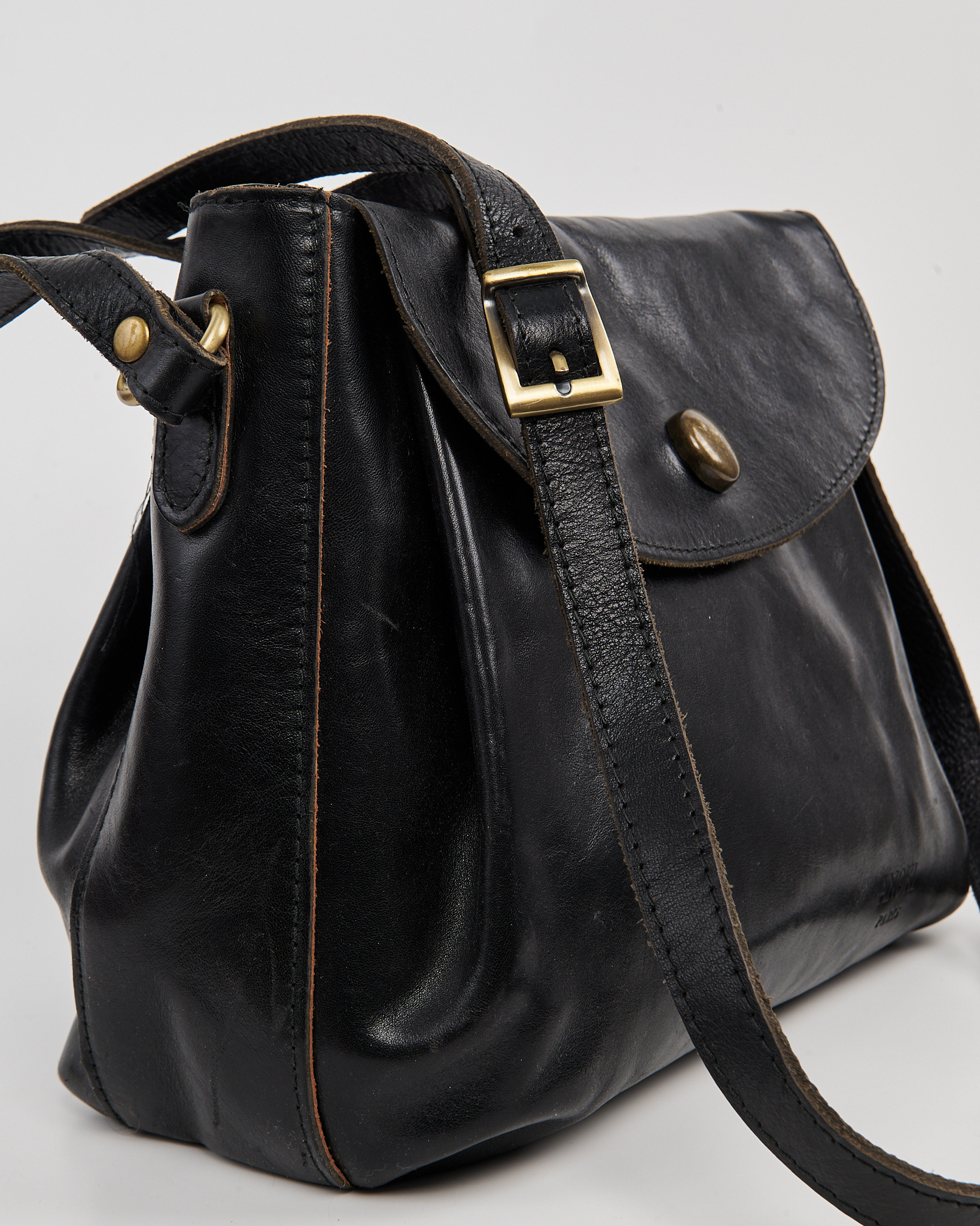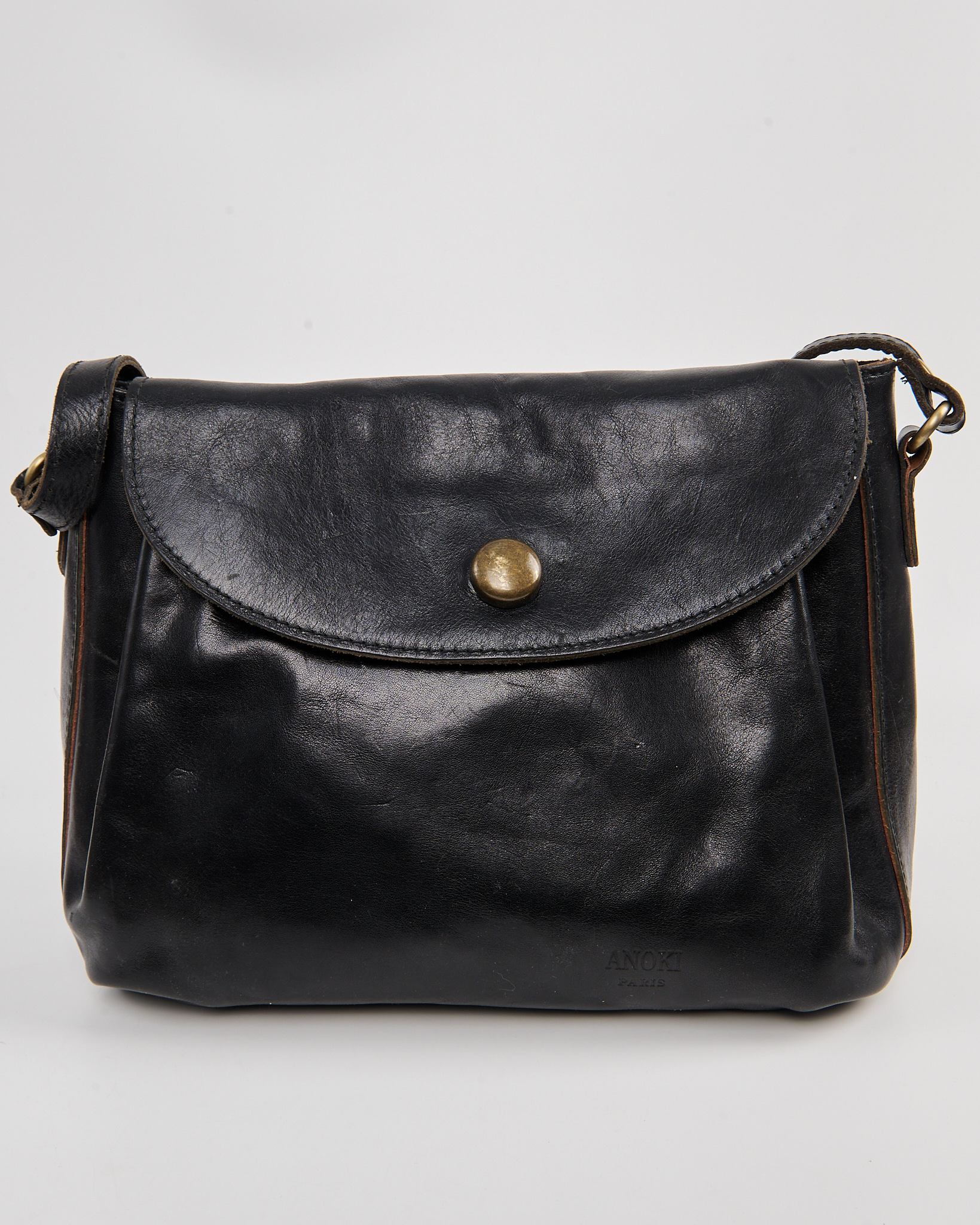 Сумка Anokhi Paris из натуральной кожи. Откидной клапан на металлической кнопке и регулируемый ремень, золотистая фурнитура с патиной.