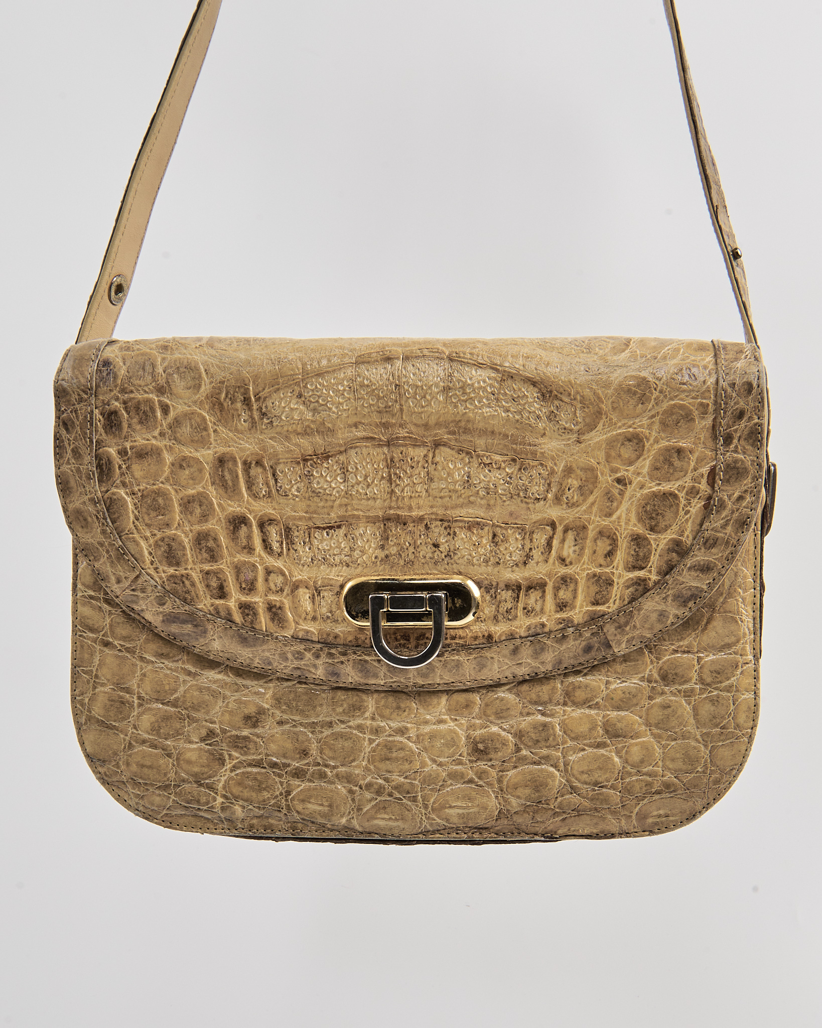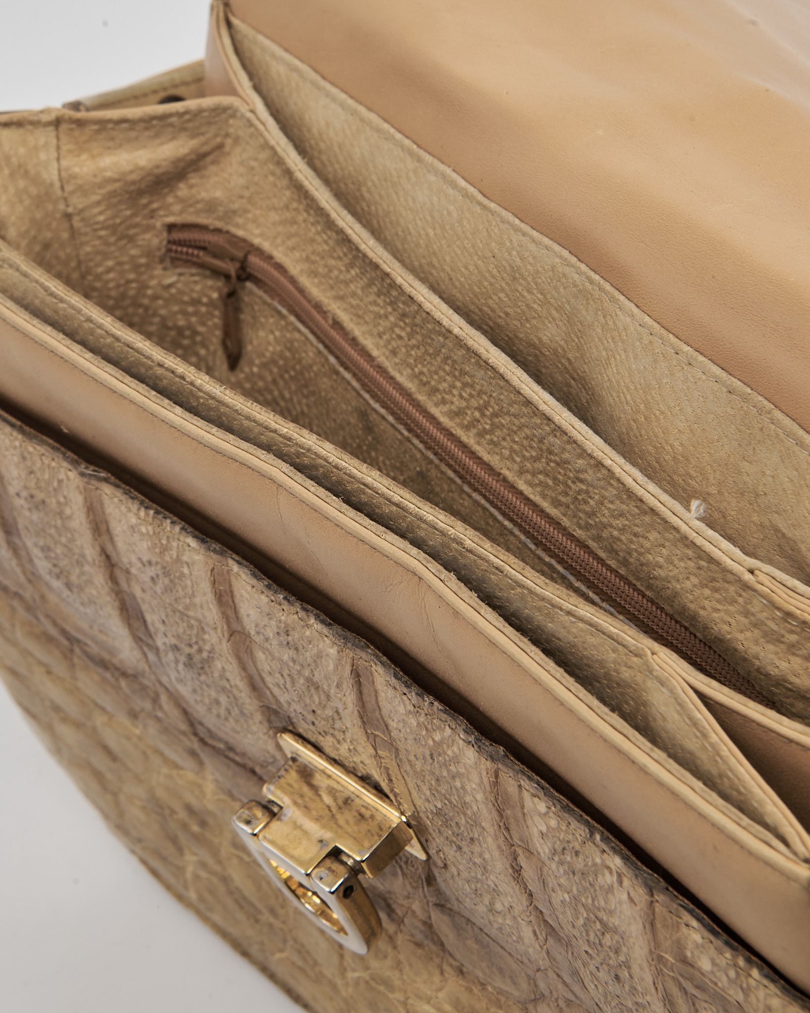 Эффектная сумка из плотной кожи рептилии в теплом бежевом оттенке. Клапан с металлической застежкой и регулируемый ремень