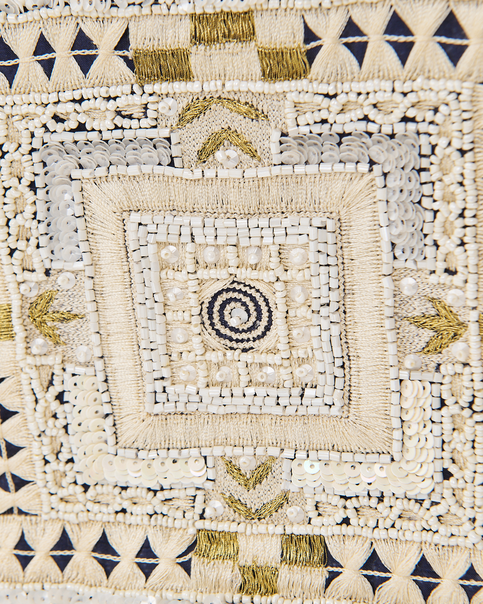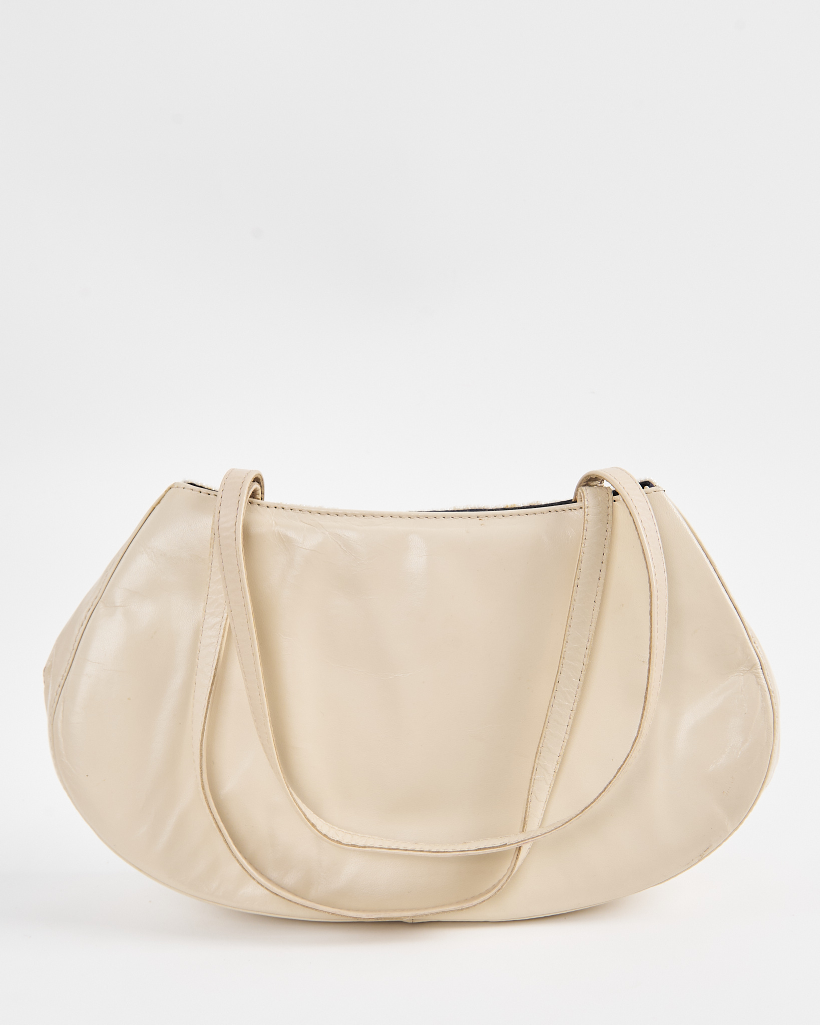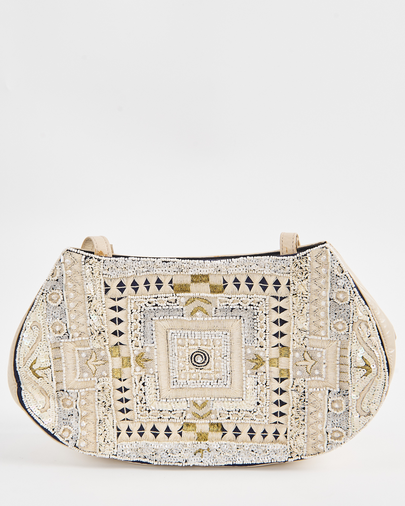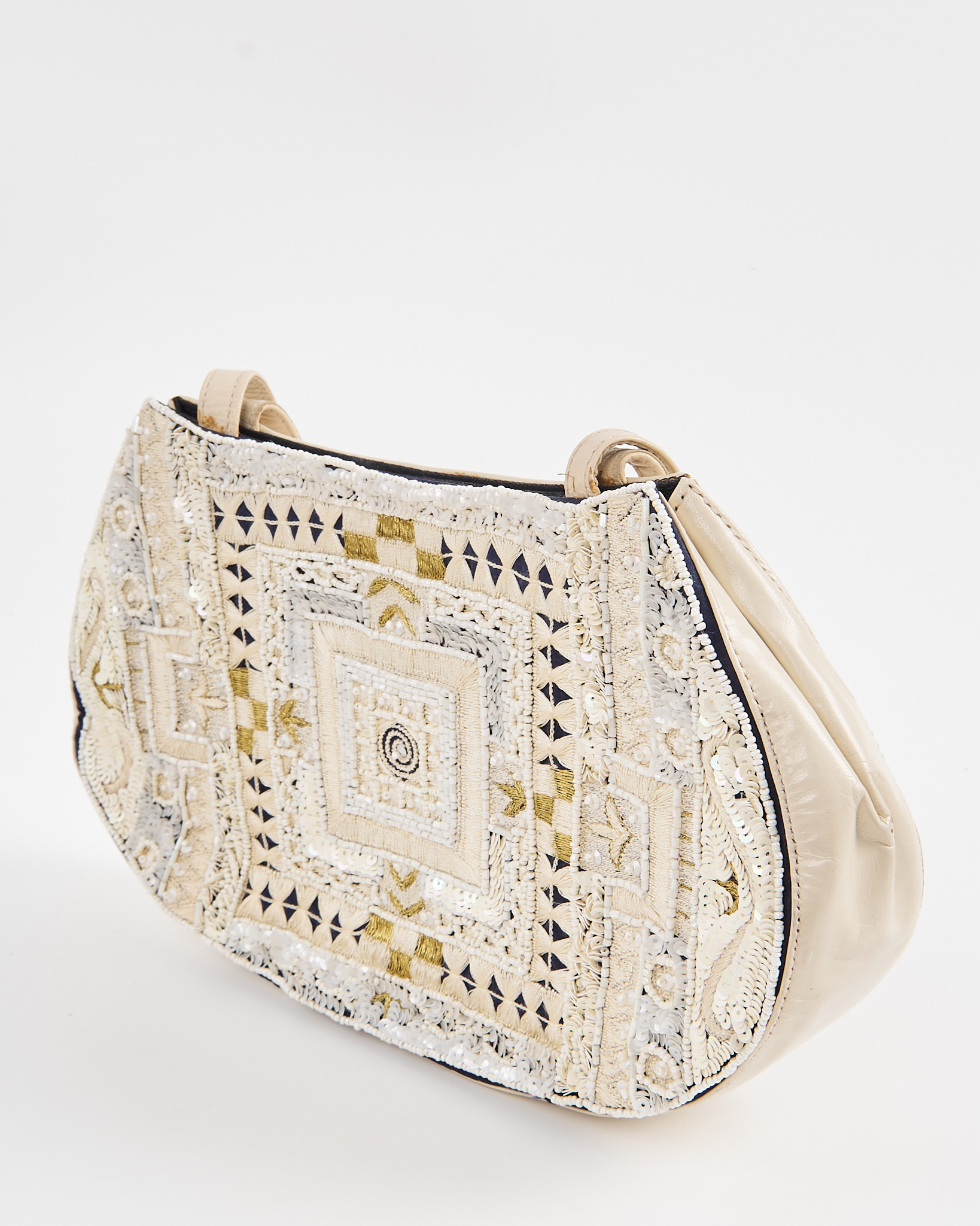 Сумка с вышивкой и бисером. Модель выполнена из мягкой светлой кожи с текстильной панелью, украшенной плотной вышивкой, бисером и пайетками. Сумка мягко ложится под руку и комфортно располагается на плече за счёт изогнутой формы и тонких ручек. Ручная отделка придаёт модели характер и подчёркивает её редкость.