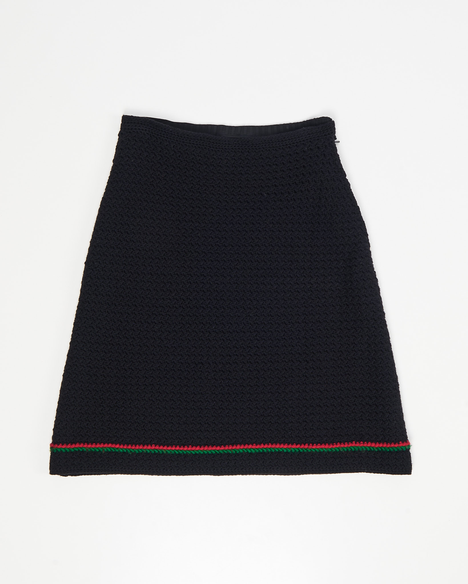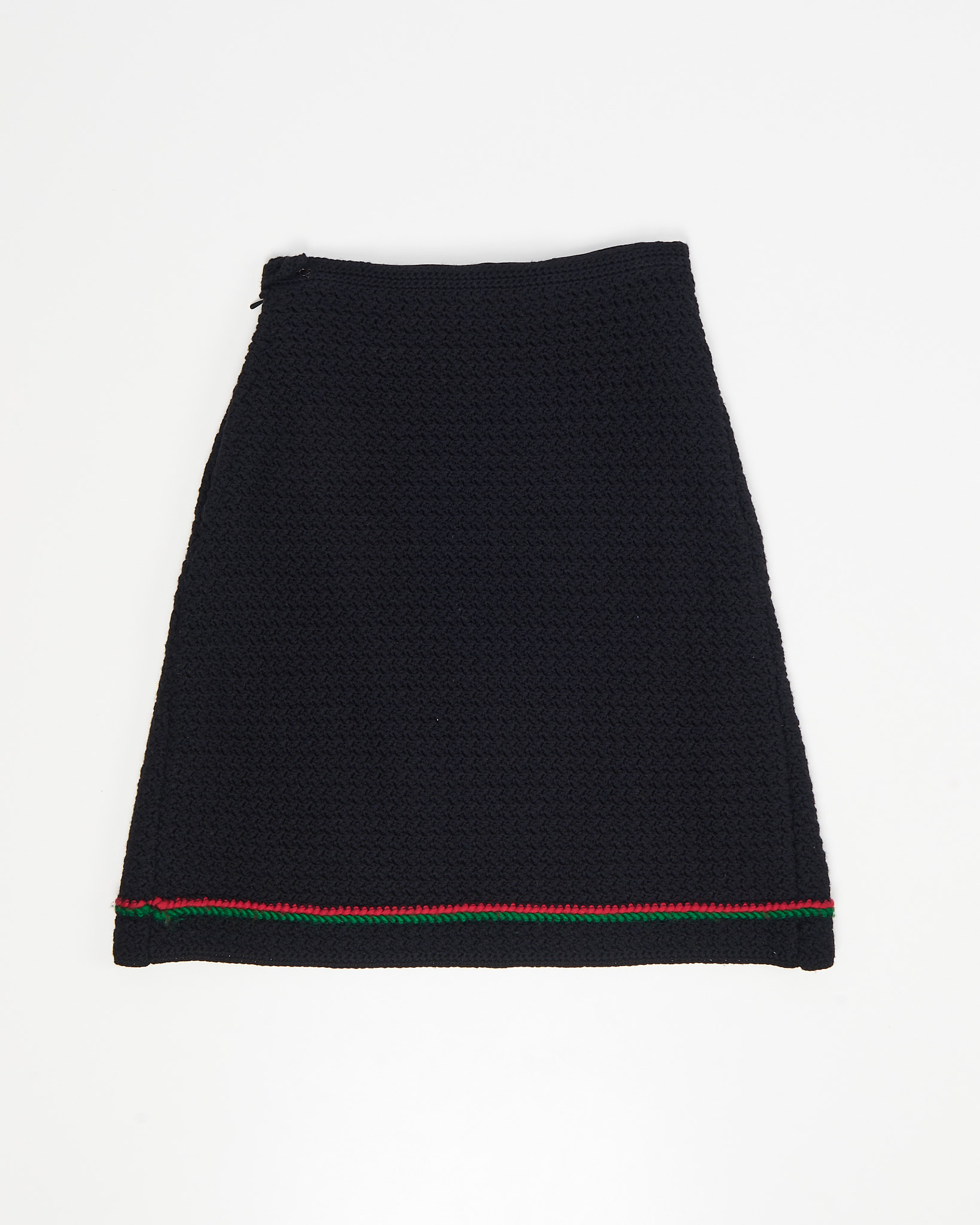 Юбка предположительно выполнена из шерсти.Крой трапеция садится точно по талии,окантовка в классических красно-зеленых тонах у самого подола.