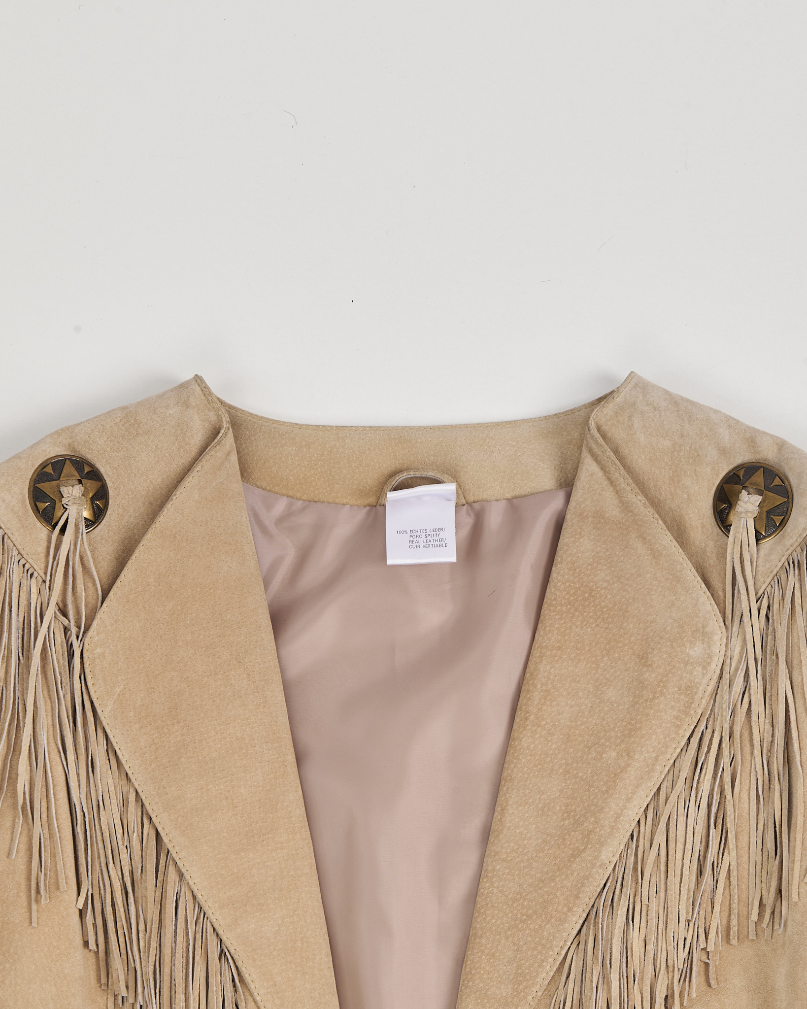 Замшевая куртка с бахромой в стиле вестерн. Куртка из мягкой натуральной замши тёплого песочного оттенка. Посадка укороченная, линия плеч чёткая, силуэт не утяжеляет образ. Длинная бахрома и декоративные металлические элементы со звёздами.