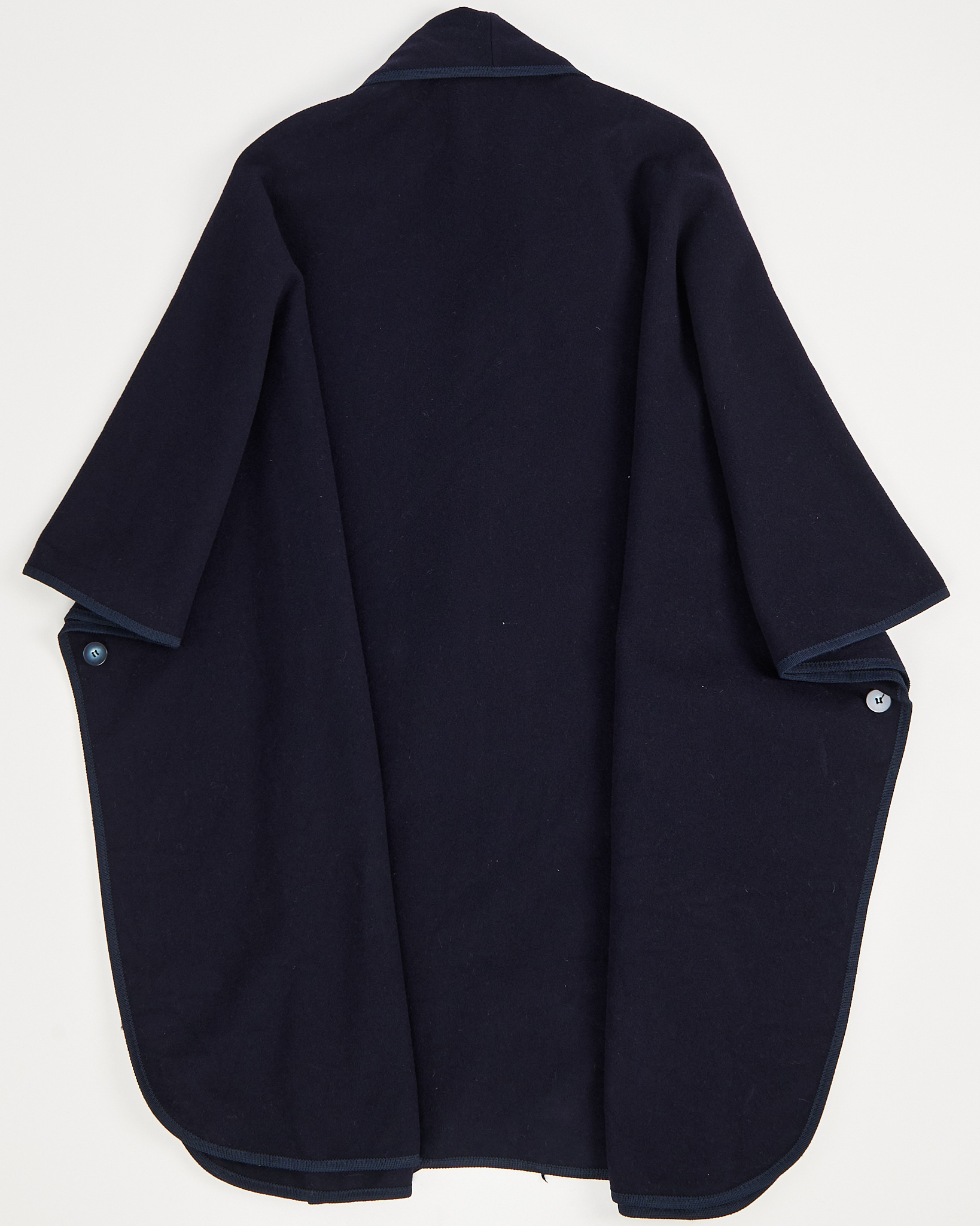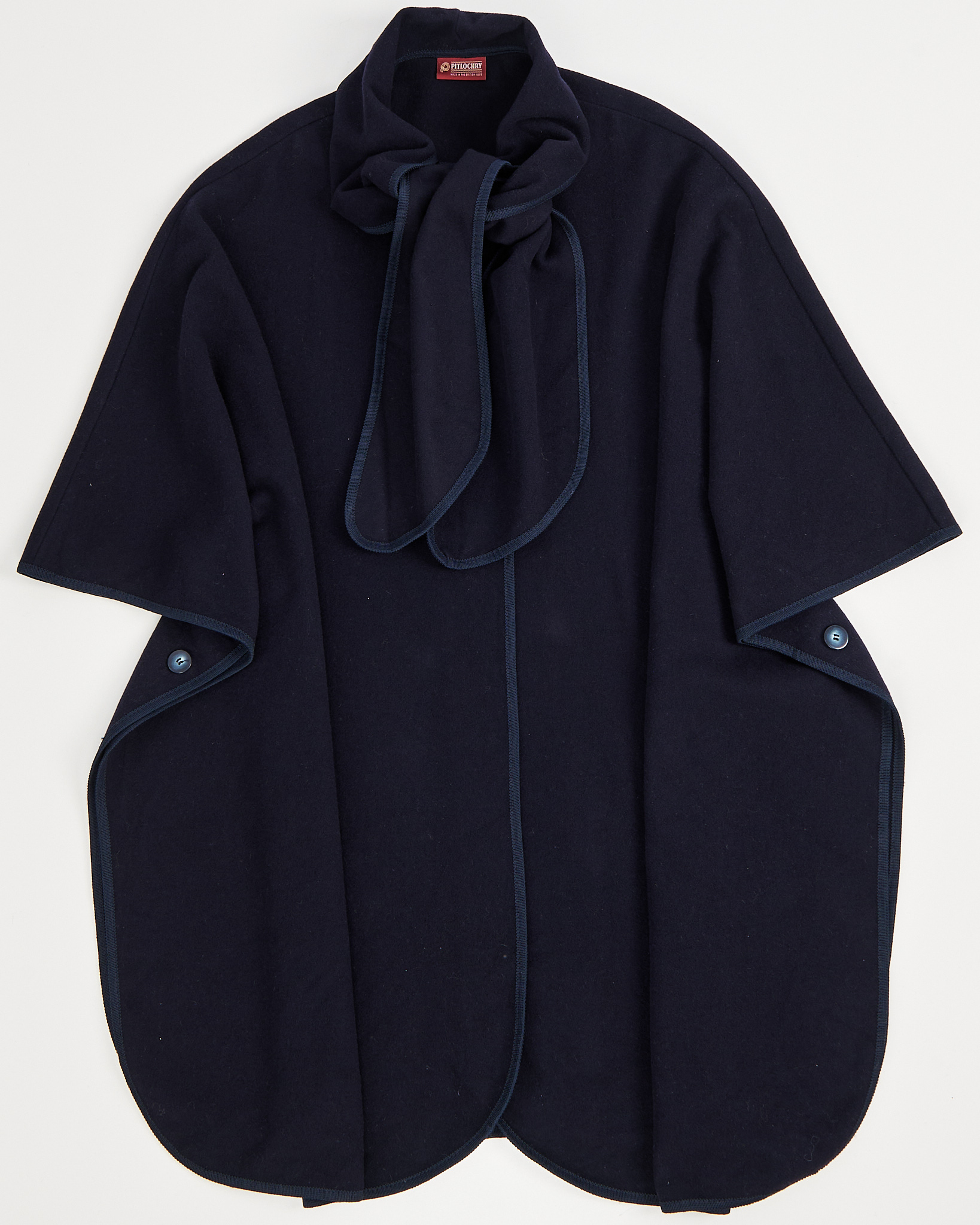 Пончо Pitlochry с шарфом-воротником. Глубокий тёмно-синий оттенок и мягкая, тактильно приятная ткань. Свободная посадка, практичный шарф-воротник. Аккуратная отделка краёв тесьмой и удобная застёжка на пуговицы.