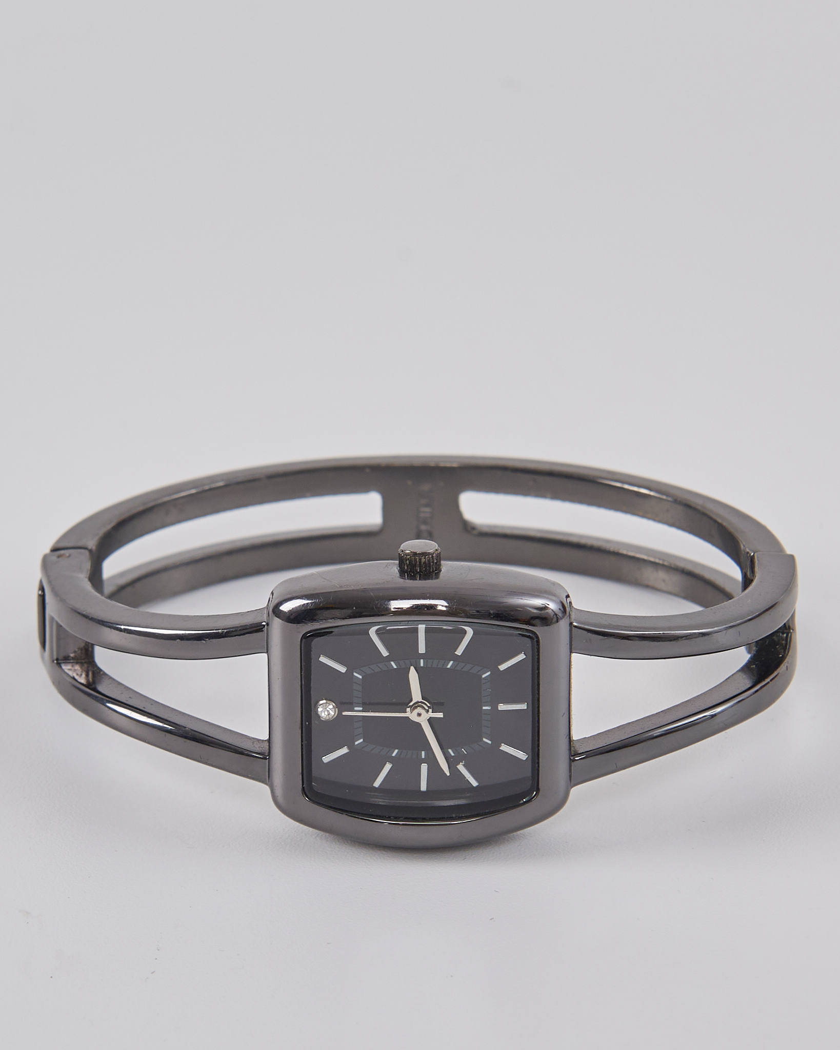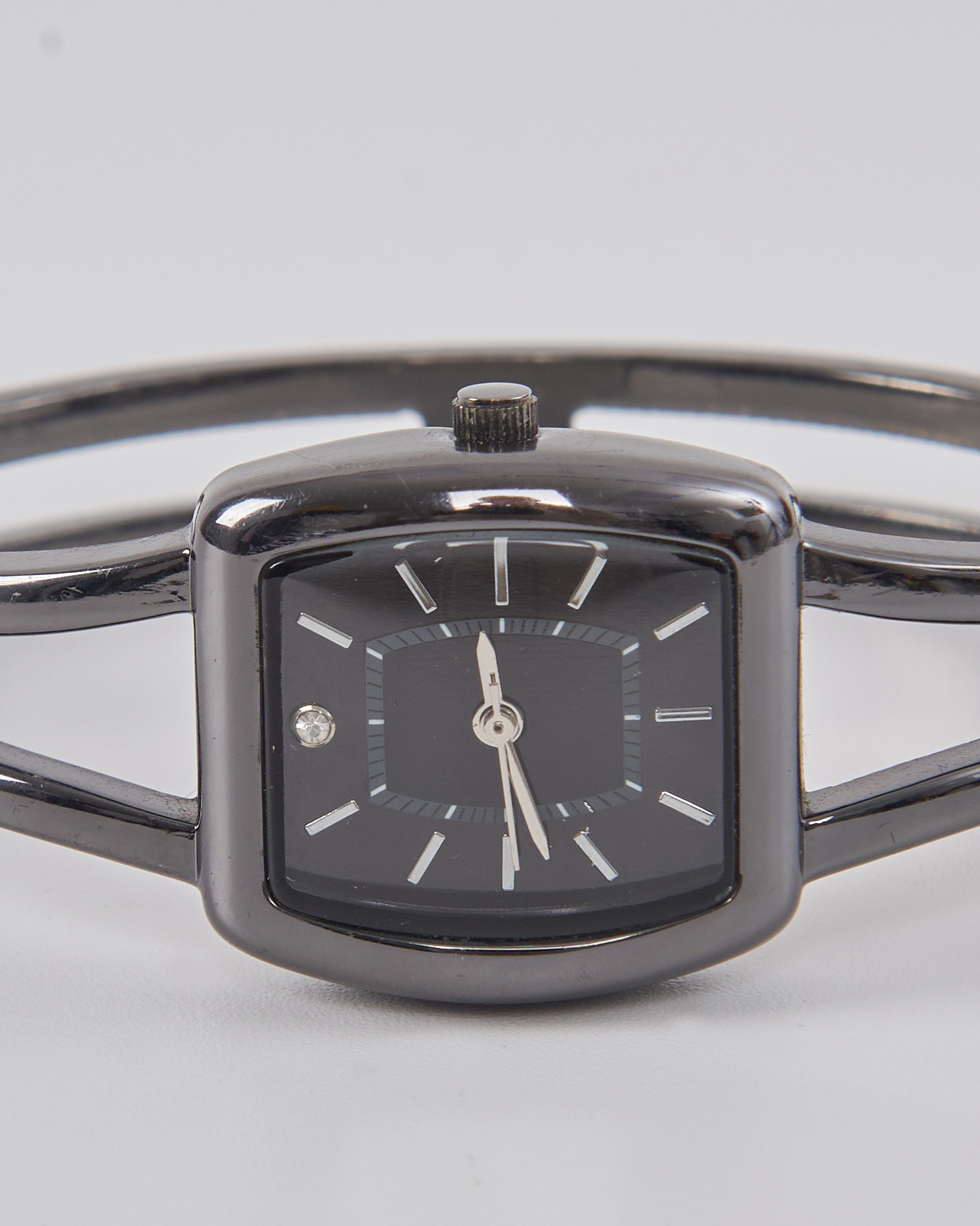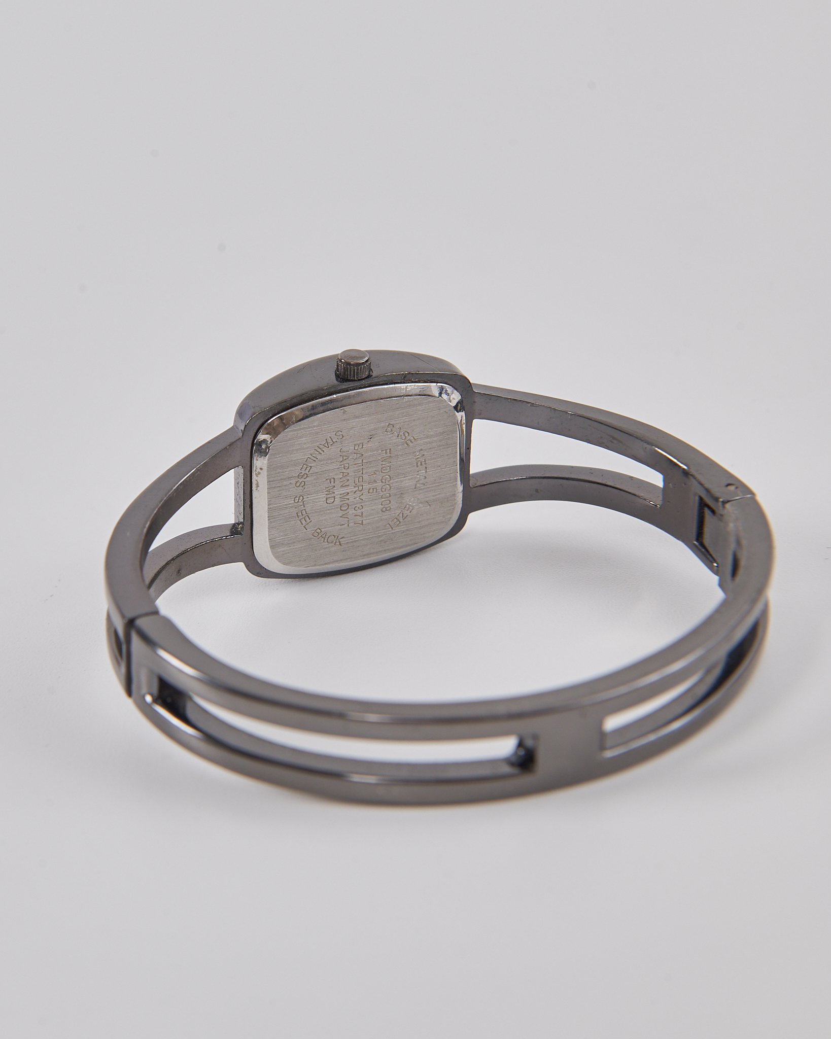 Часы в корпусе тёмного металла с жёстким браслетом-обручем. Посадка фиксированная, браслет чётко держит форму и аккуратно садится на запястье. Квадратный циферблат с контрастной разметкой, минималистичный декор с камнем на циферблате.